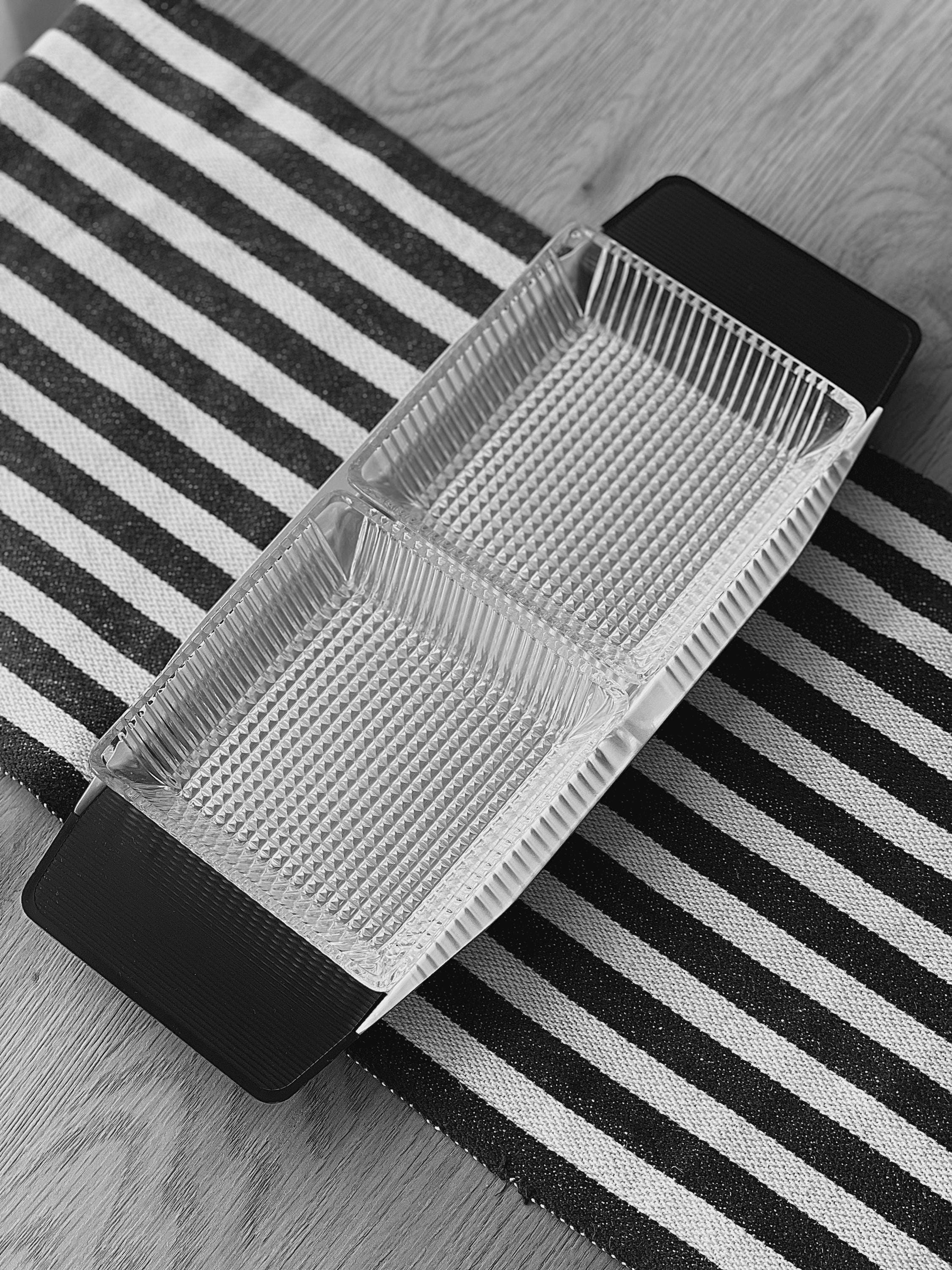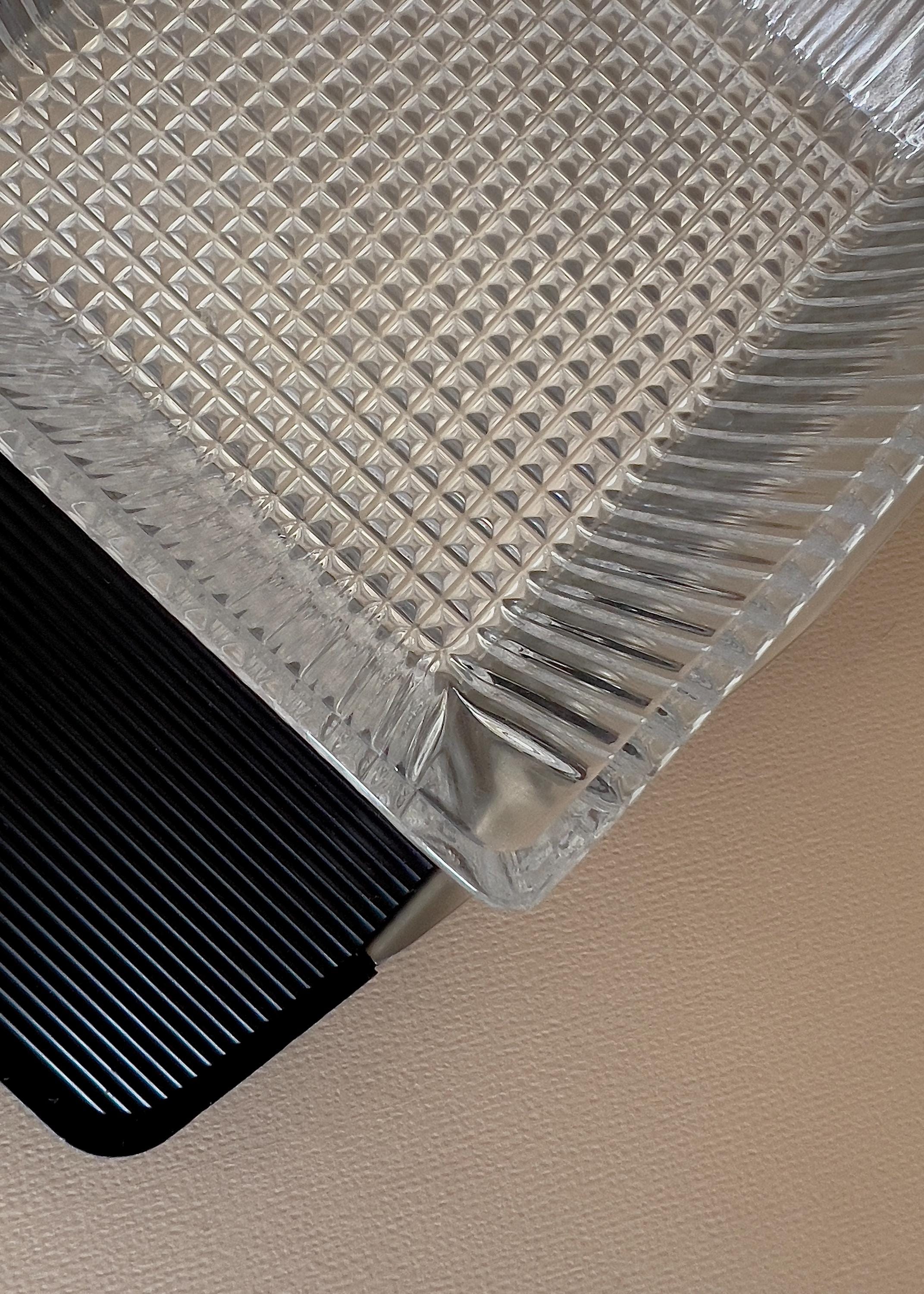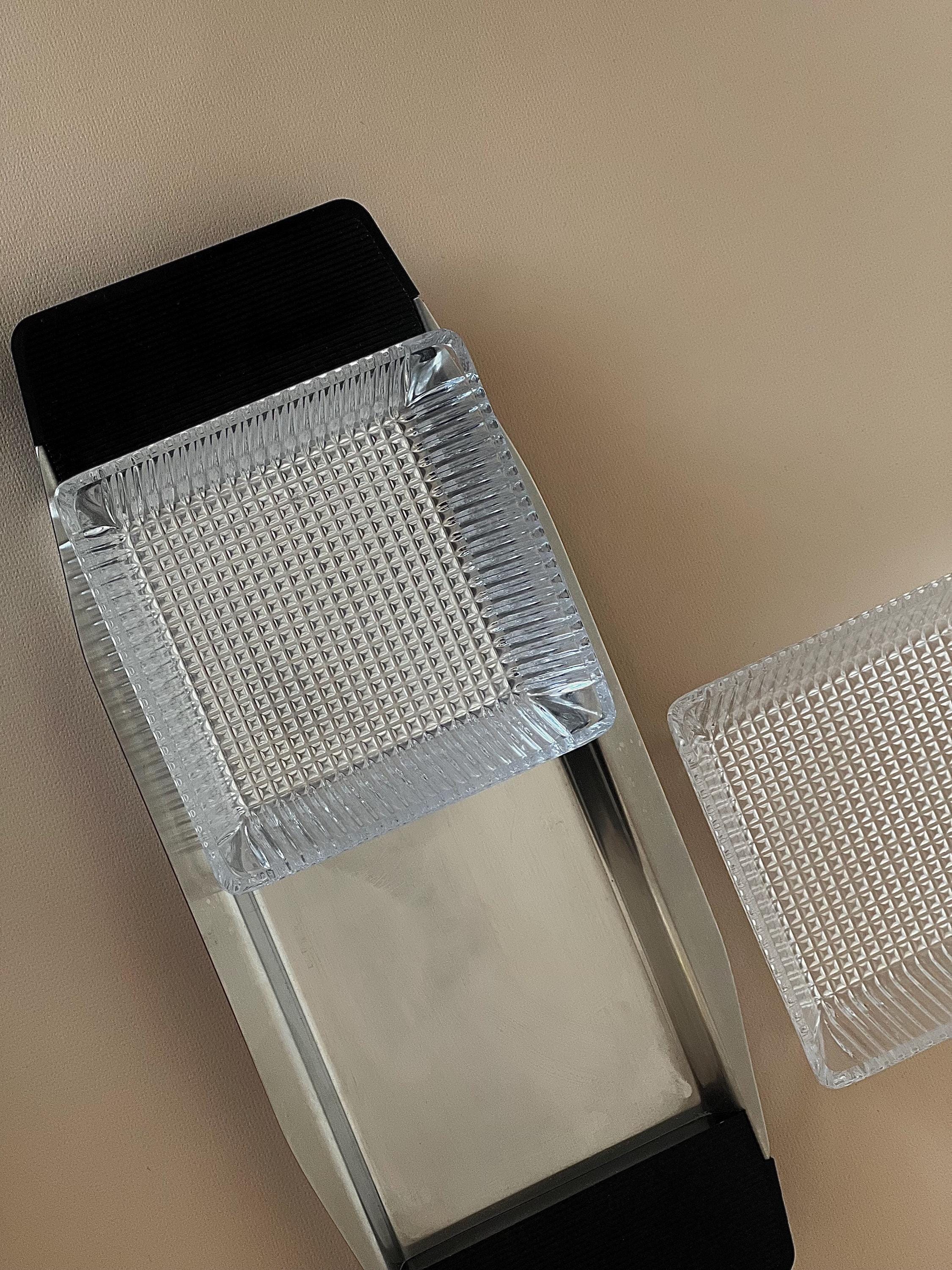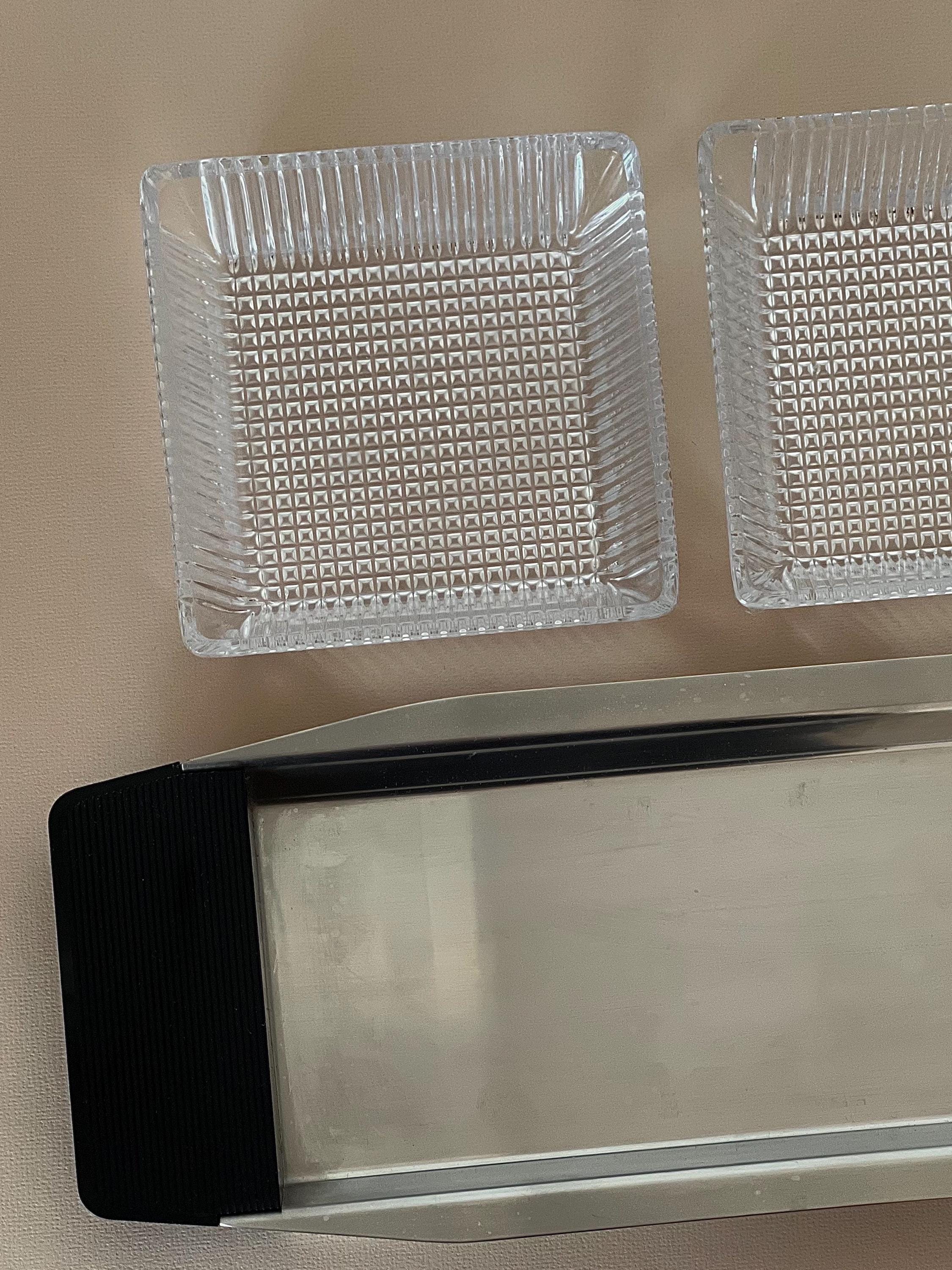 This minimalist serving bowl was designed by Günter Kupetz for WMF in the 1960s. It consists of a straight-lined tray made of metal (Cromargan), with two grooved handles made of black plastic, and two glass bowl inserts made of pressed glass.