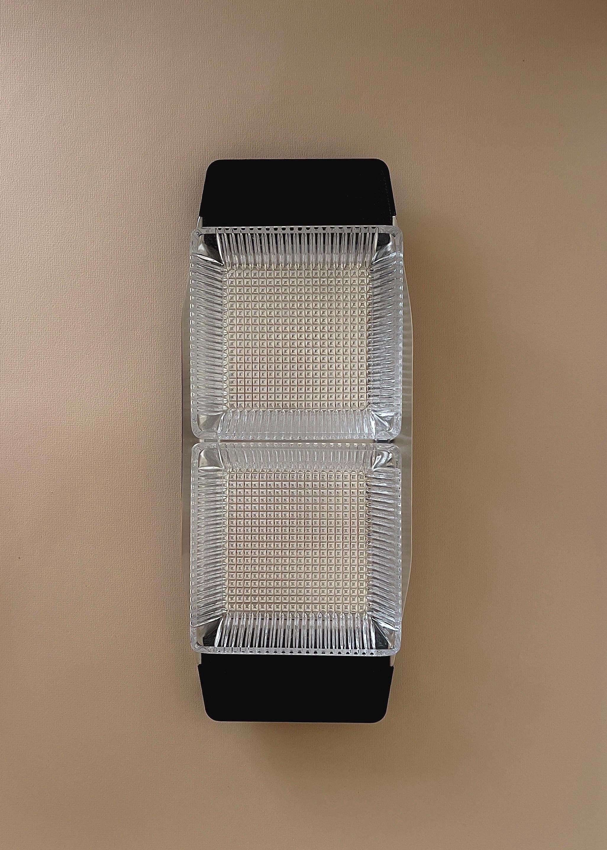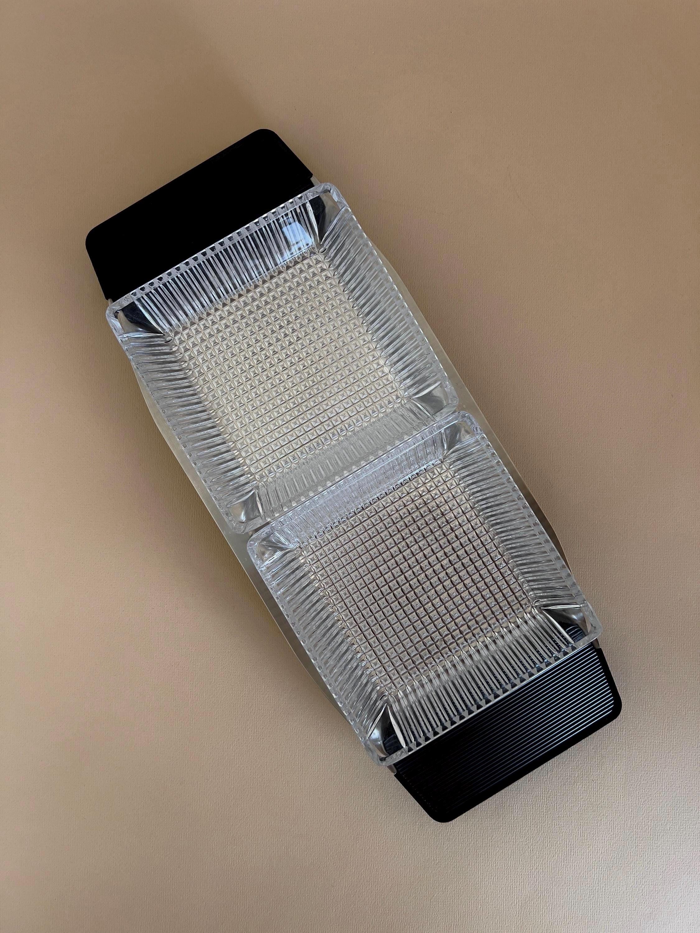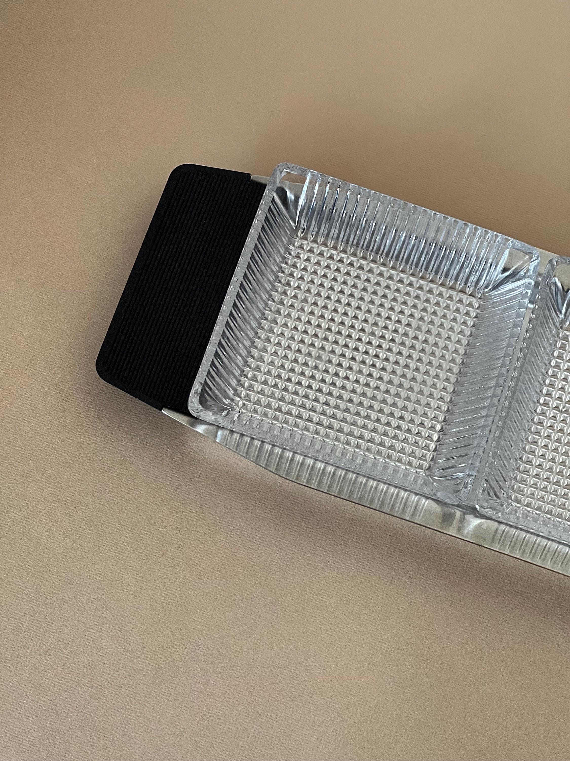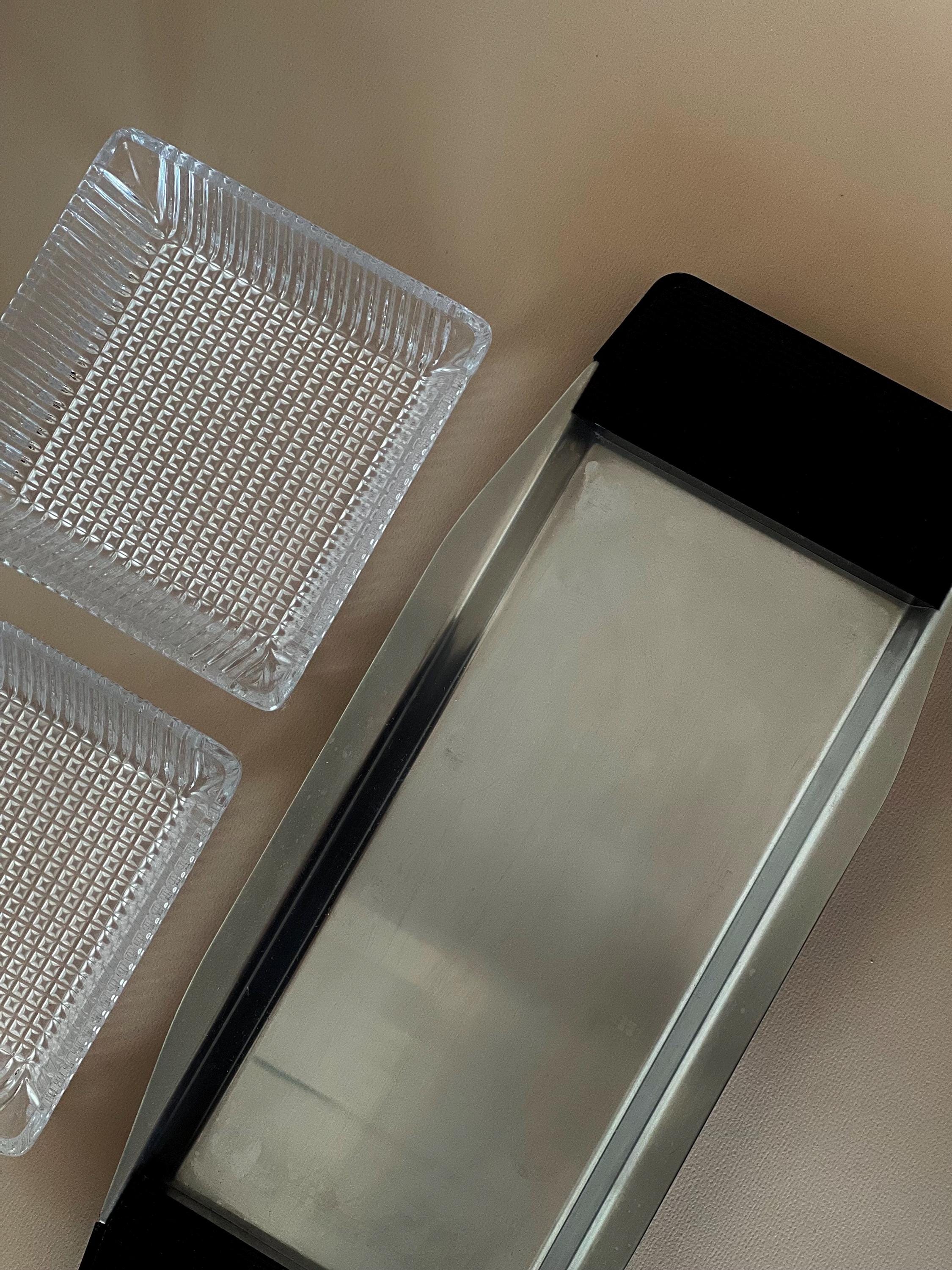 This minimalist serving bowl was designed by Günter Kupetz for WMF in the 1960s. It consists of a straight-lined tray made of metal (Cromargan), with two grooved handles made of black plastic, and two glass bowl inserts made of pressed glass.