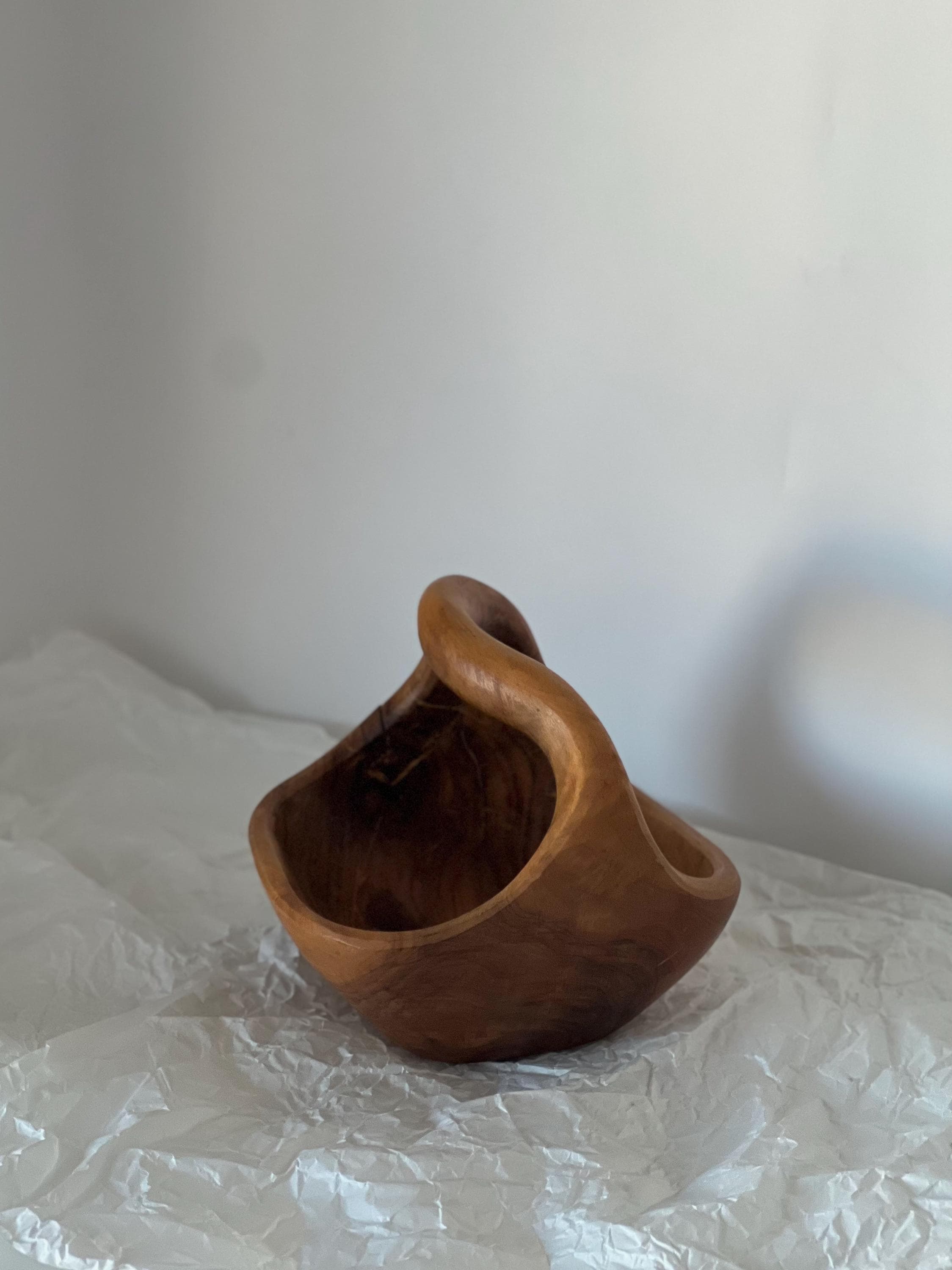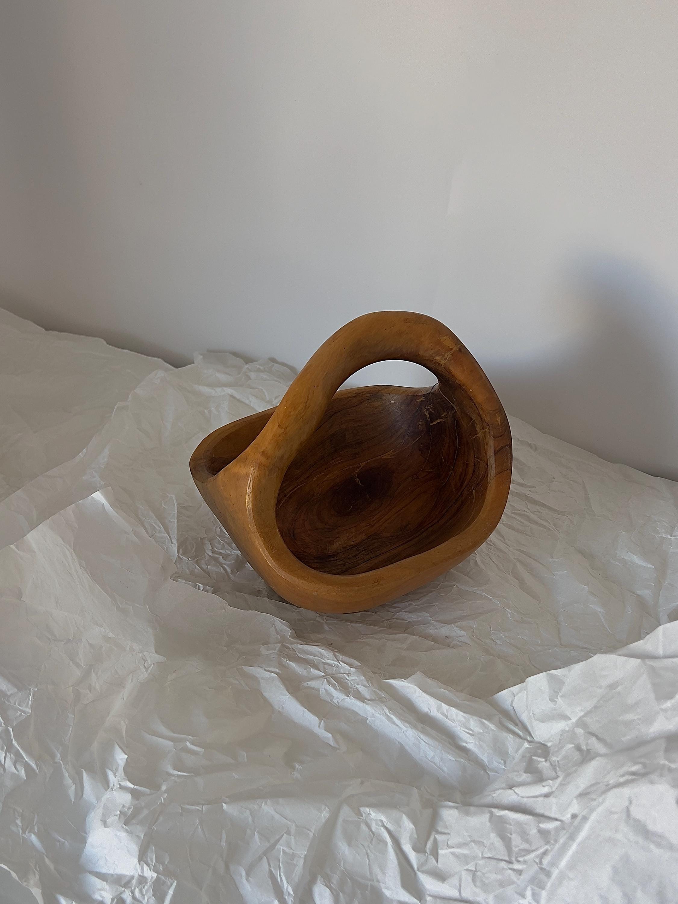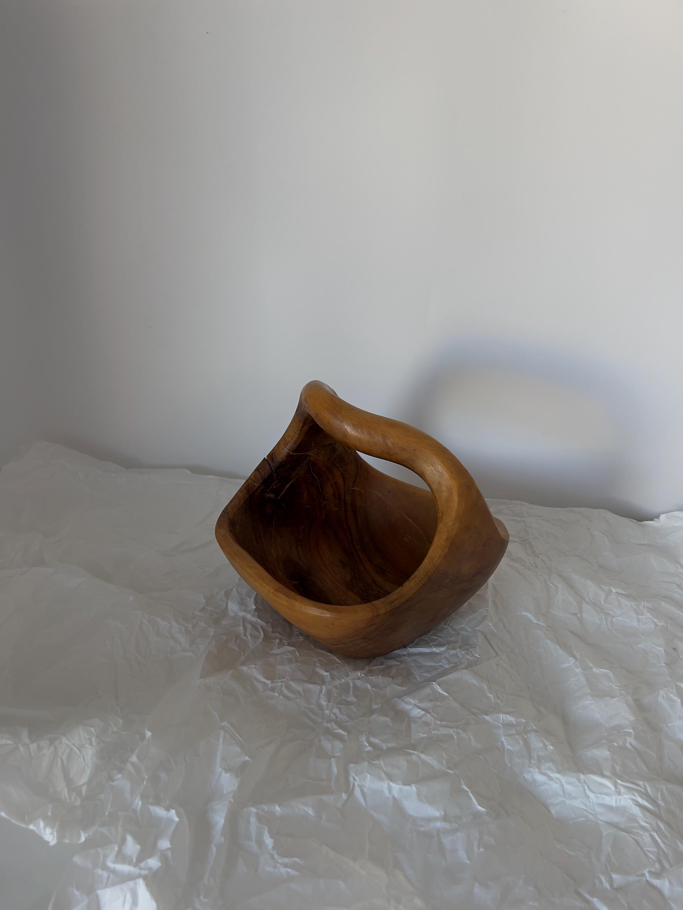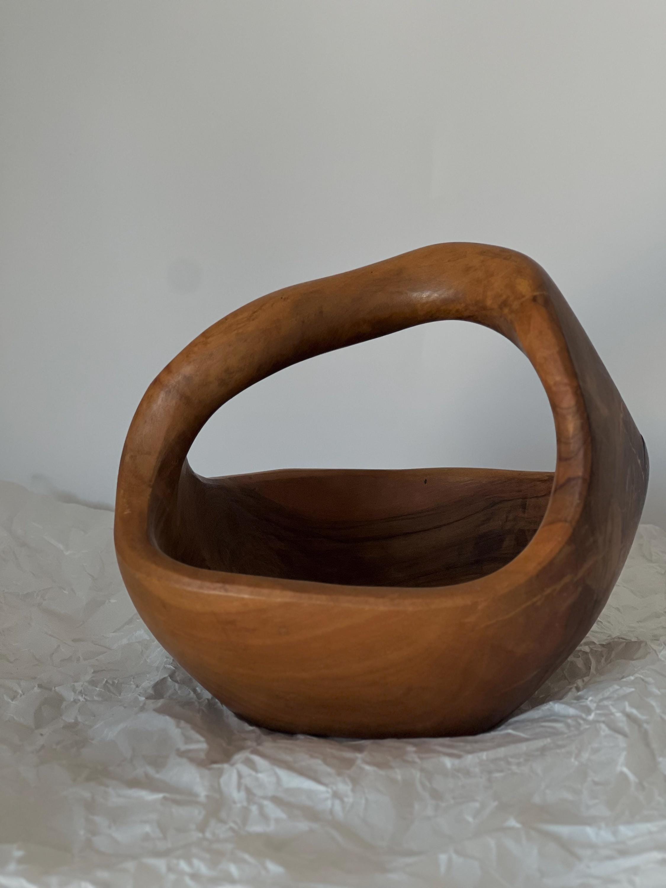 A hand-carved wooden basket bowl, sculpted from a single block of hardwood. Its flowing form and integrated handle create a piece that feels both organic and intentional. The rich natural grain makes every angle unique, while the warm patina tells the story of its age.
