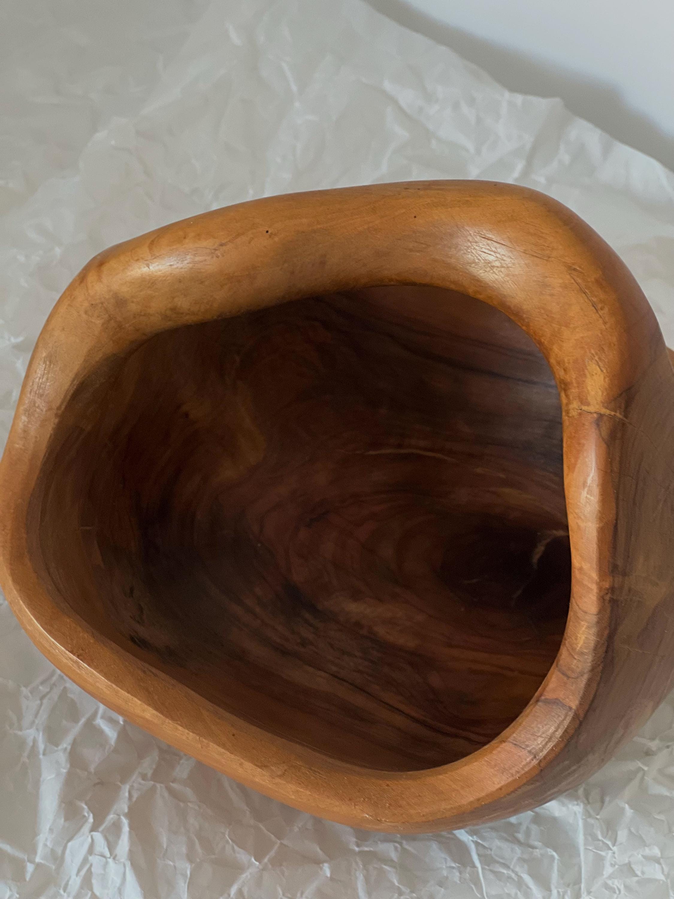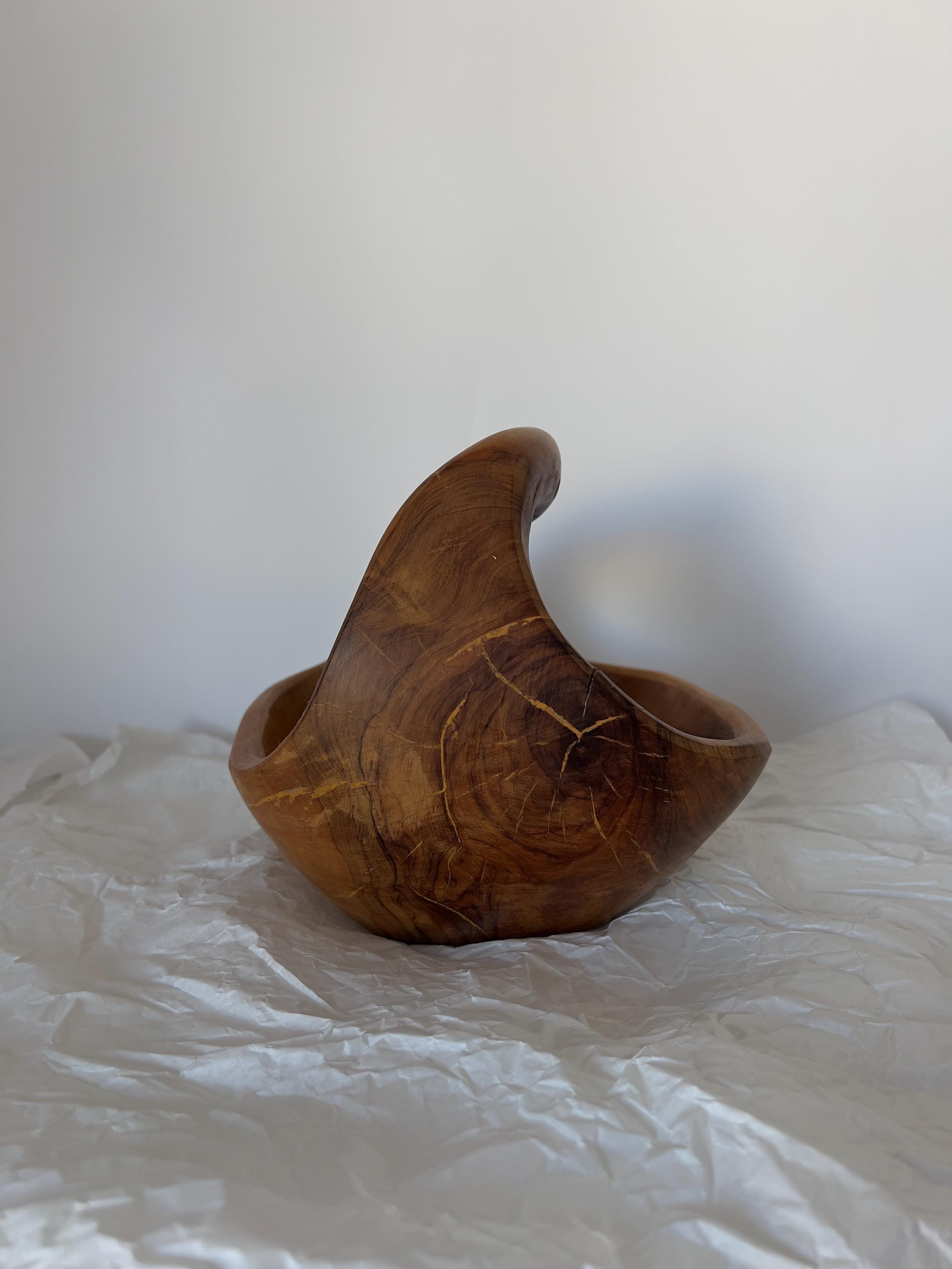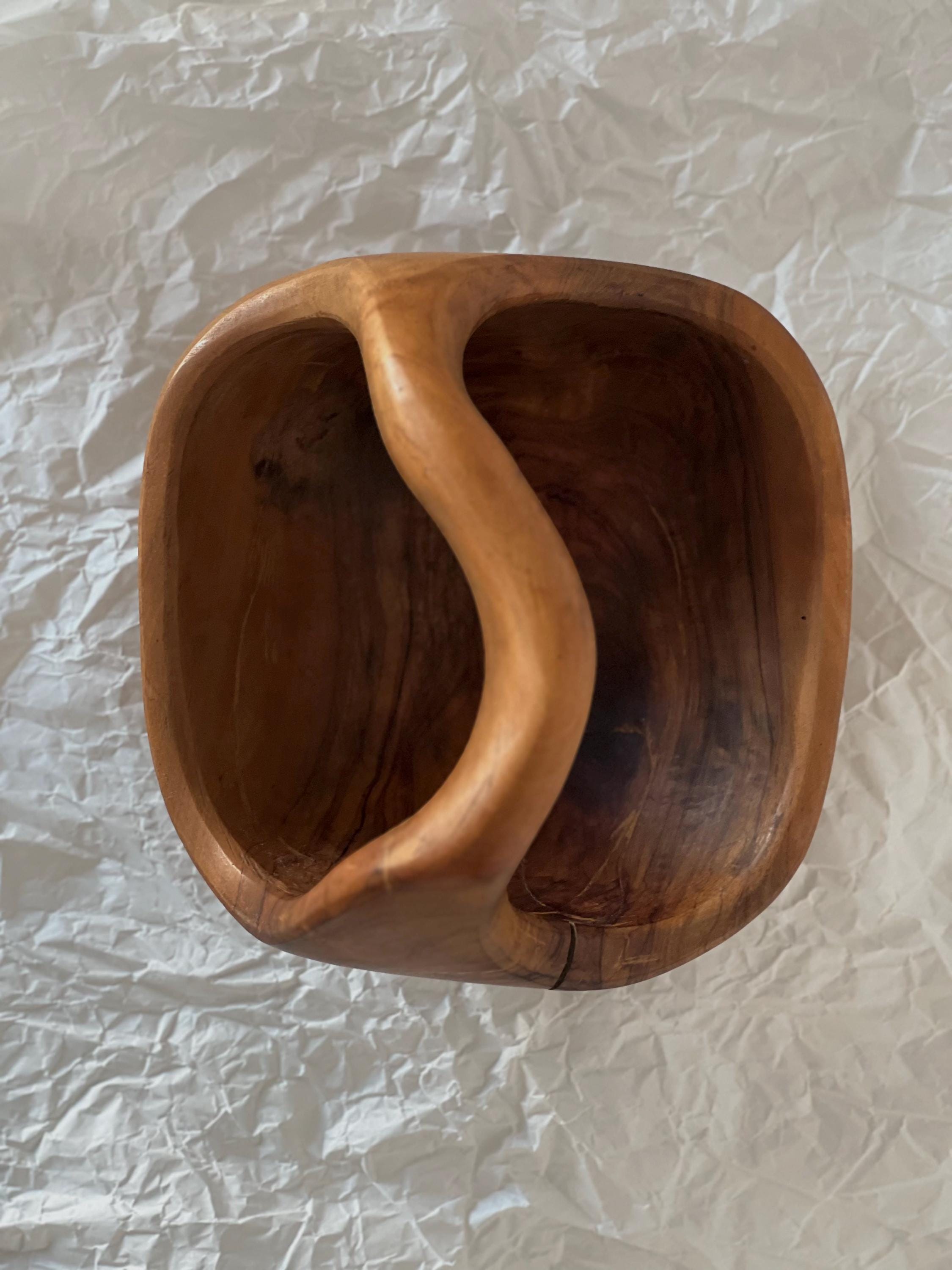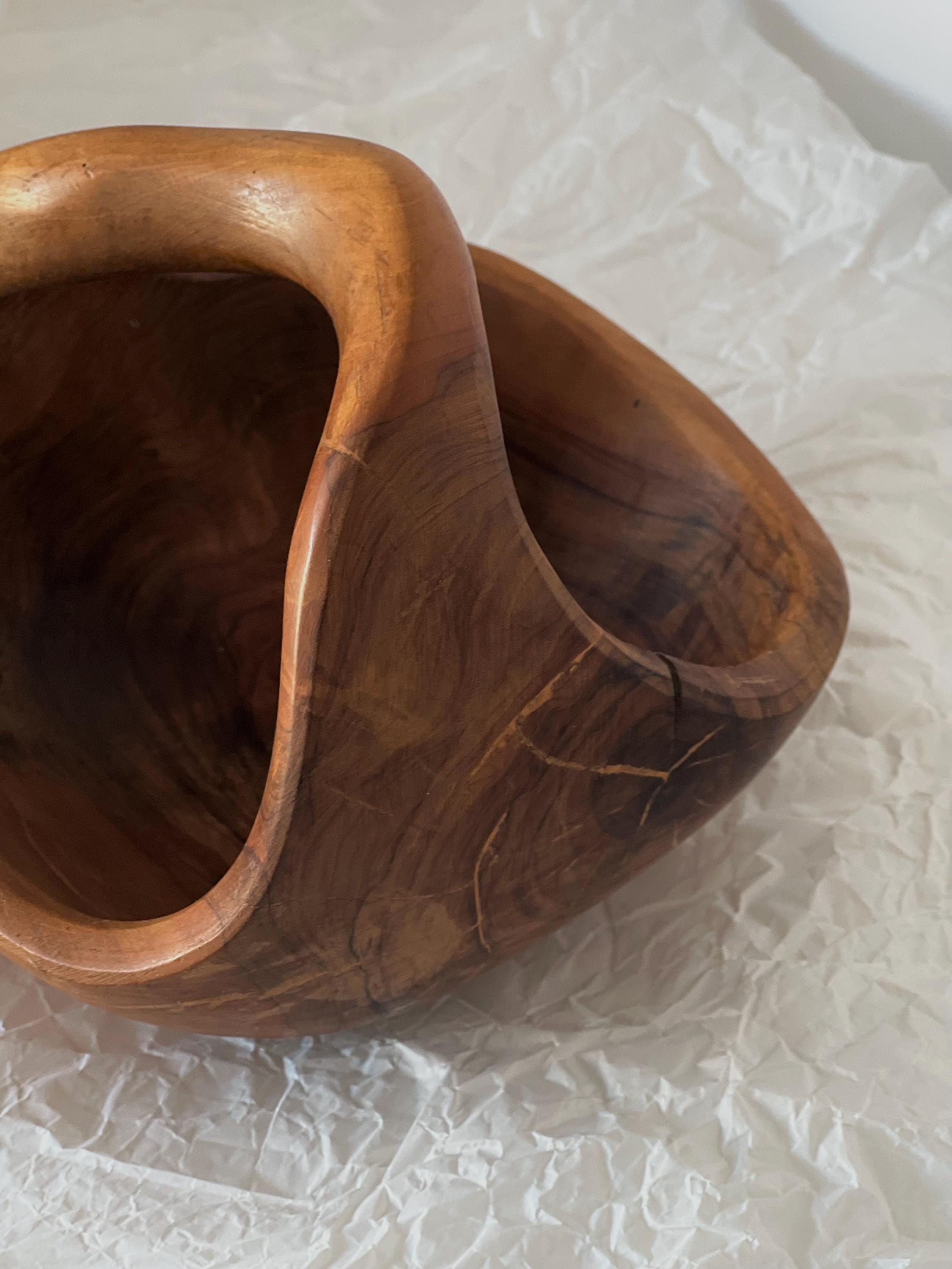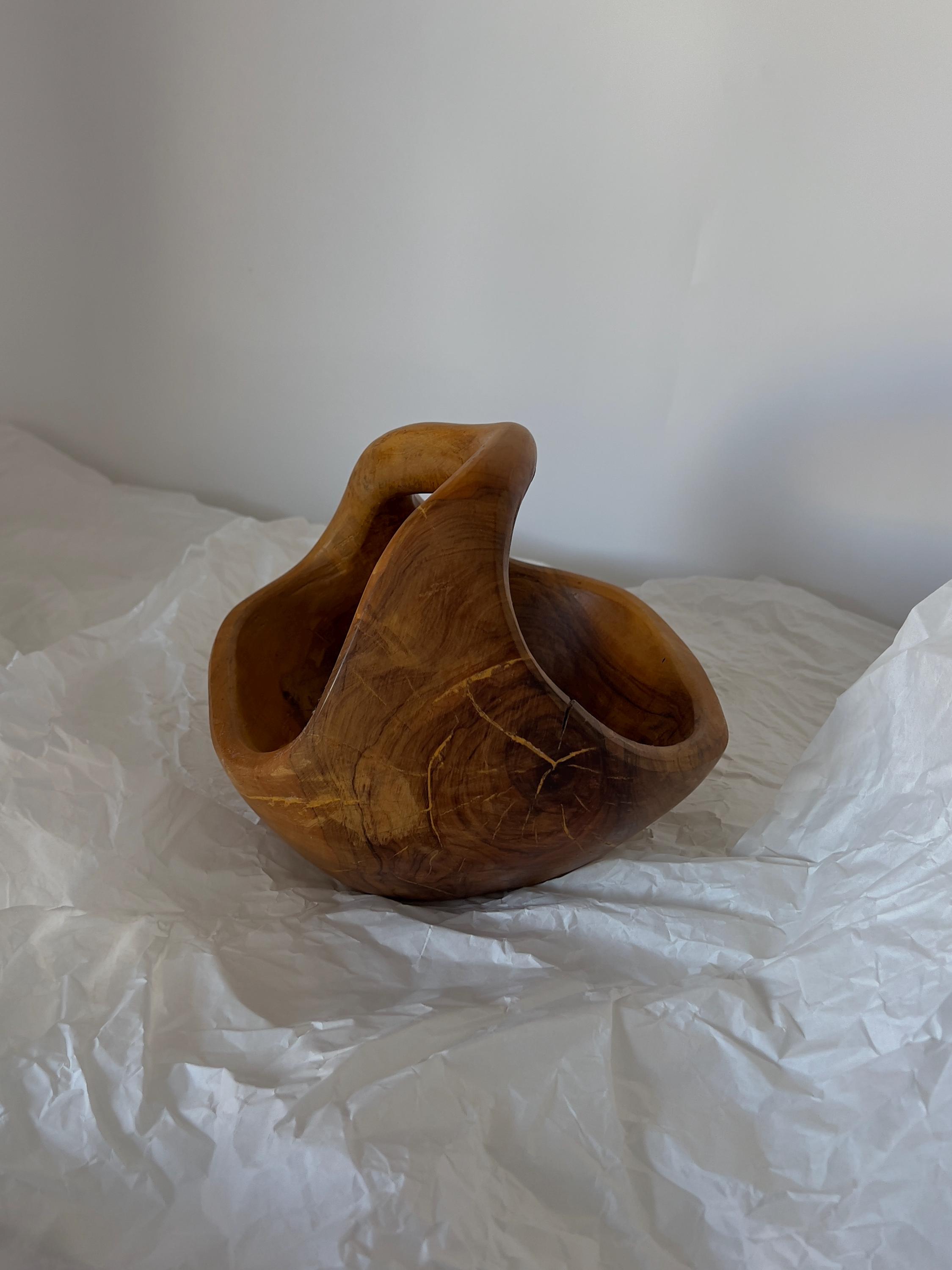 A hand-carved wooden basket bowl, sculpted from a single block of hardwood. Its flowing form and integrated handle create a piece that feels both organic and intentional. The rich natural grain makes every angle unique, while the warm patina tells the story of its age.