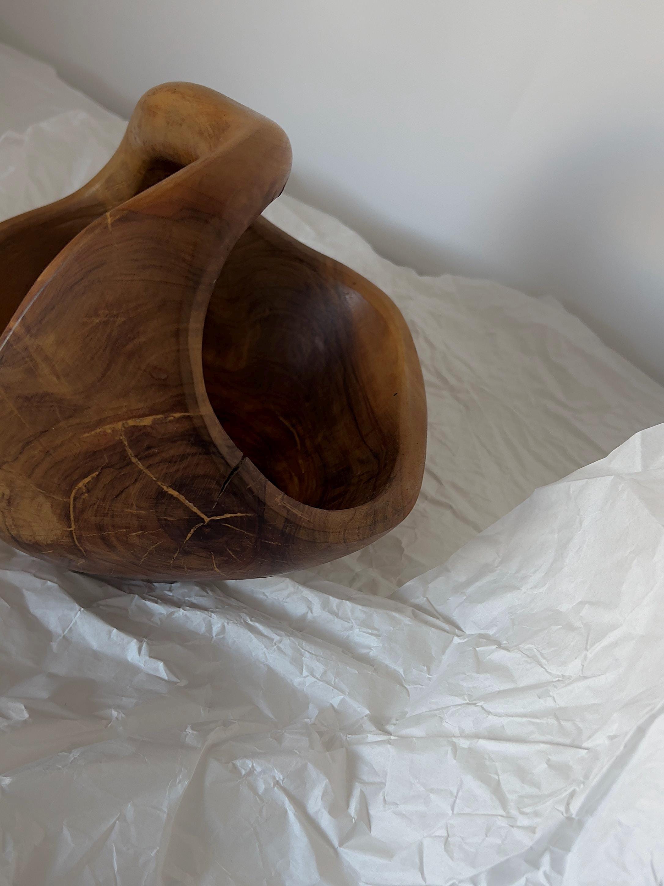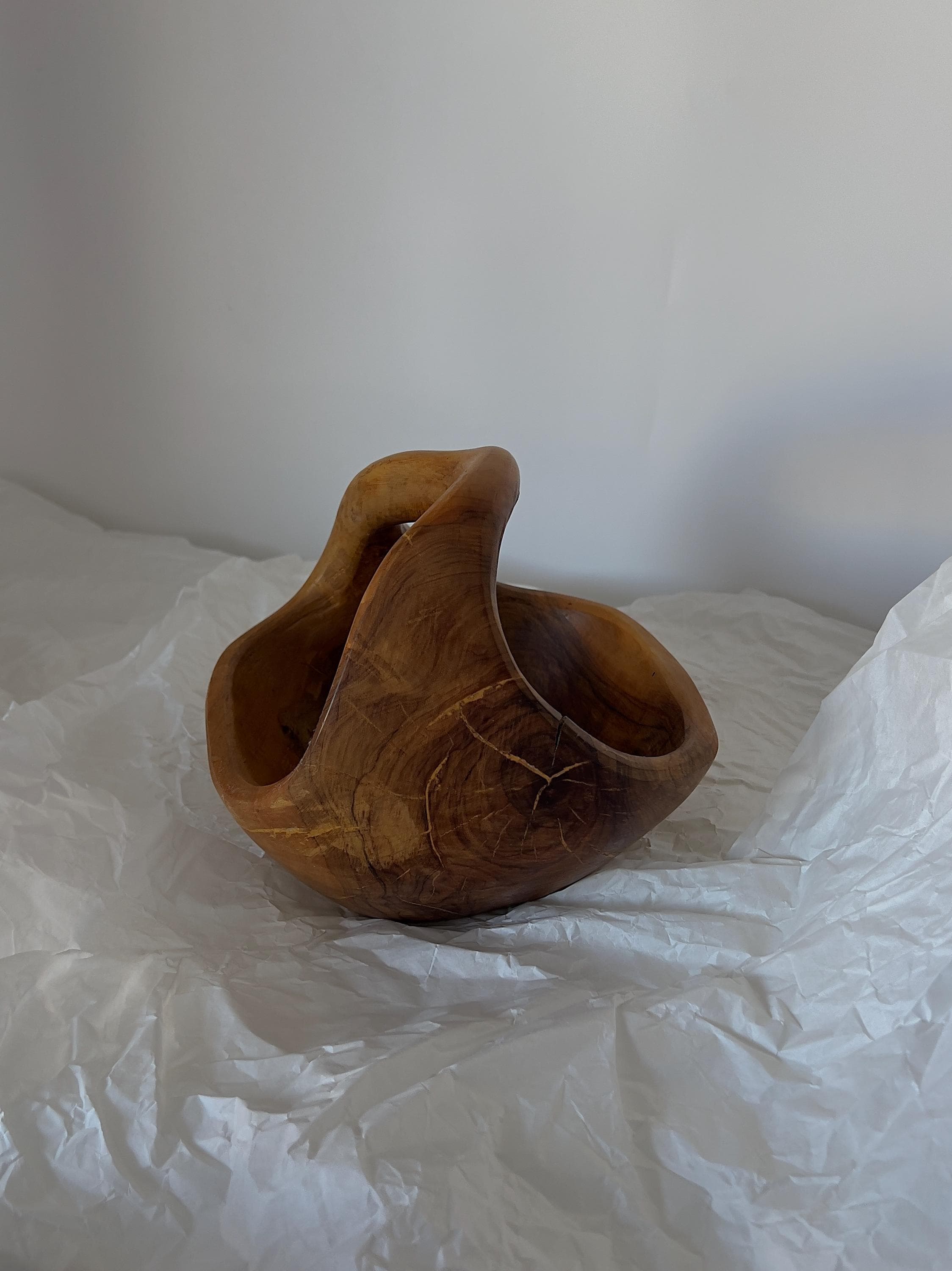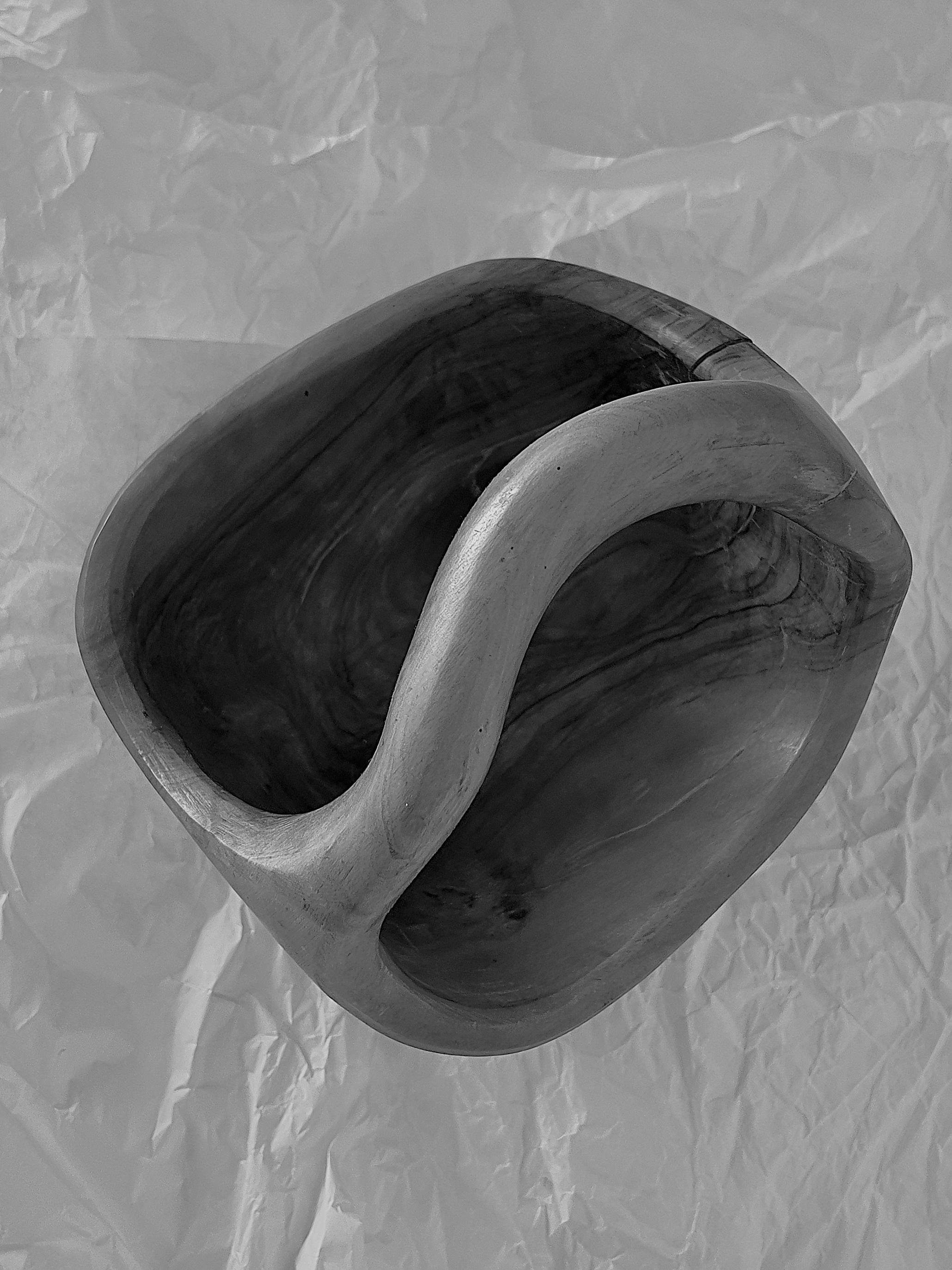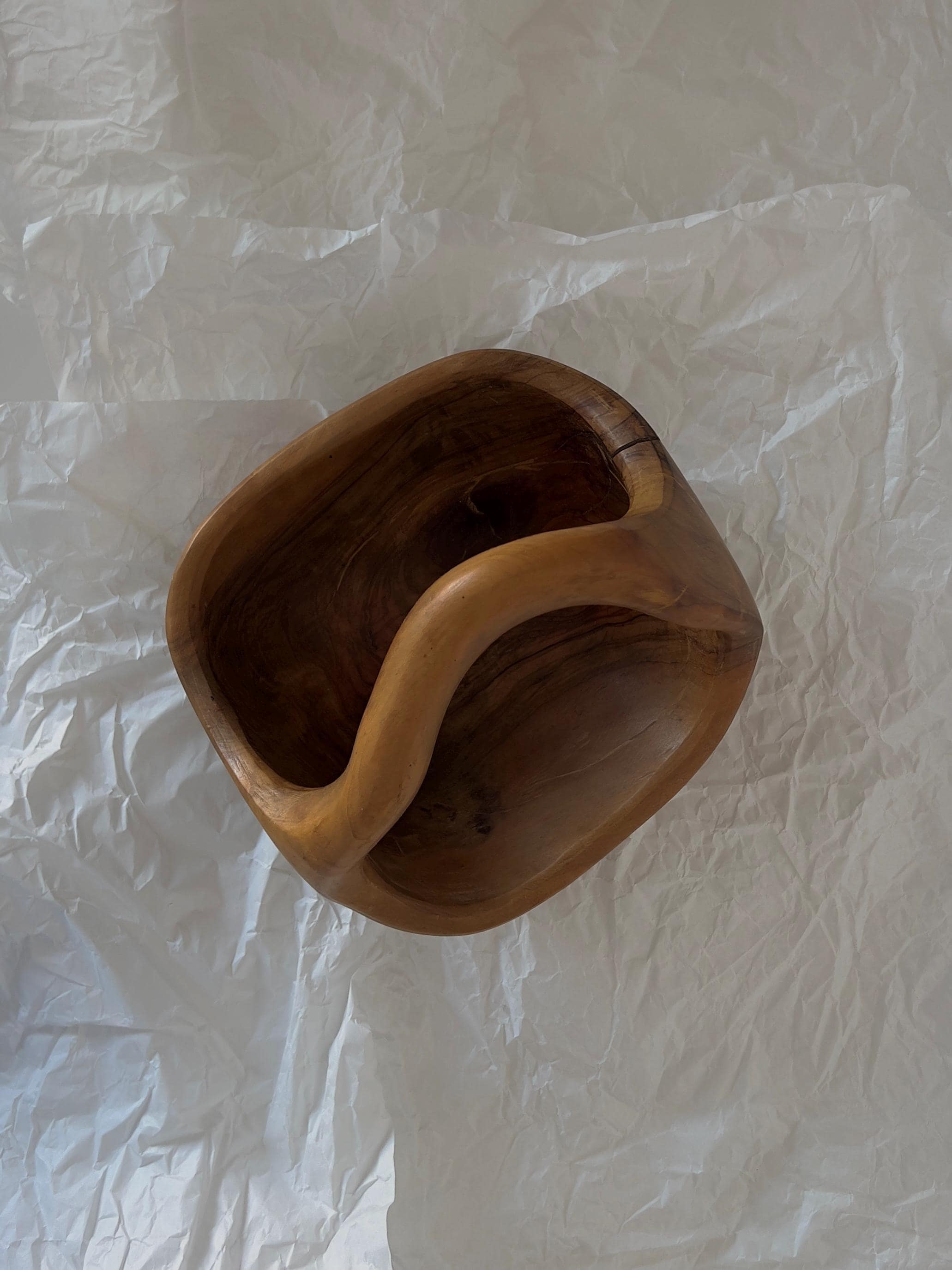 A hand-carved wooden basket bowl, sculpted from a single block of hardwood. Its flowing form and integrated handle create a piece that feels both organic and intentional. The rich natural grain makes every angle unique, while the warm patina tells the story of its age.