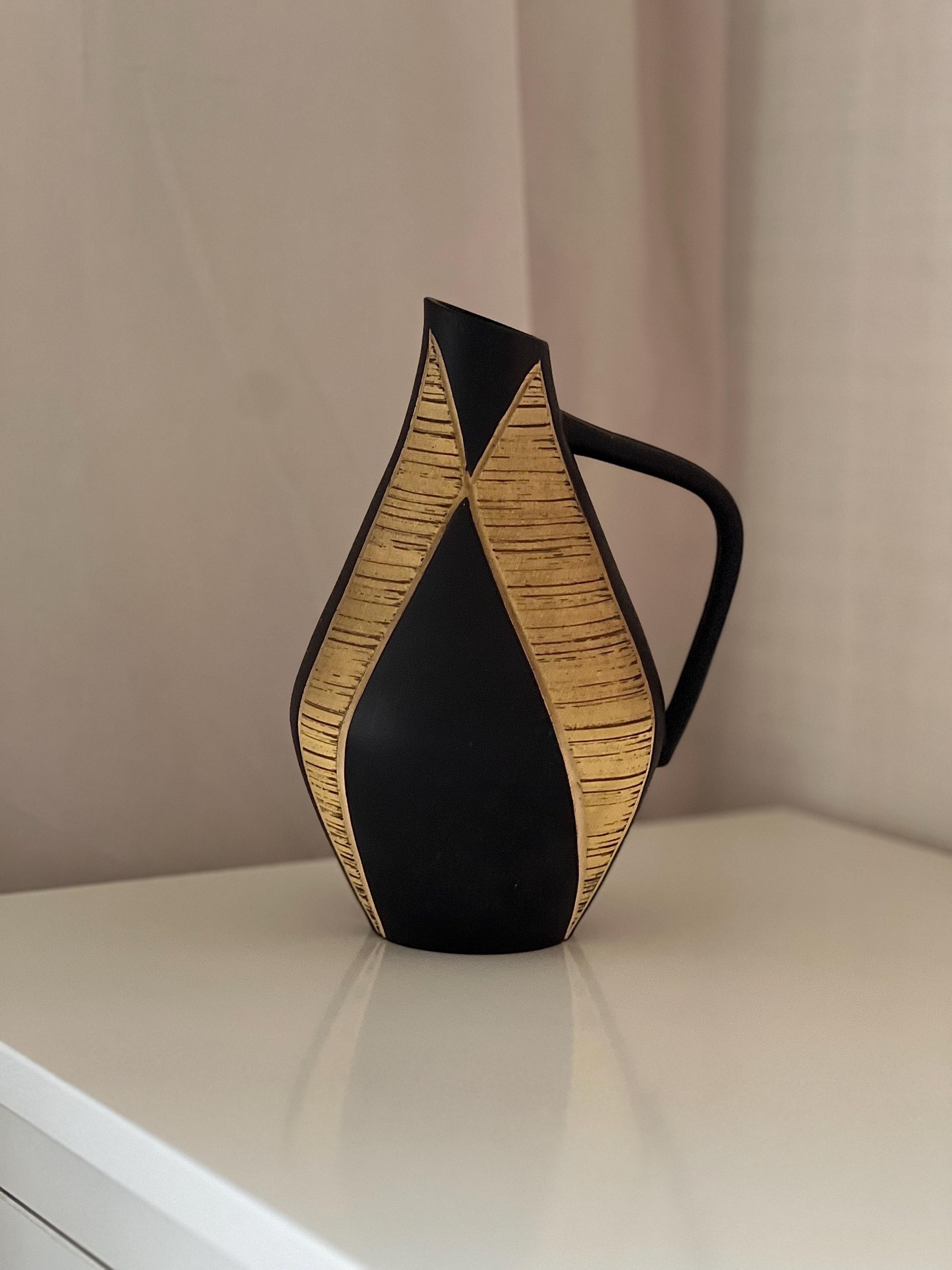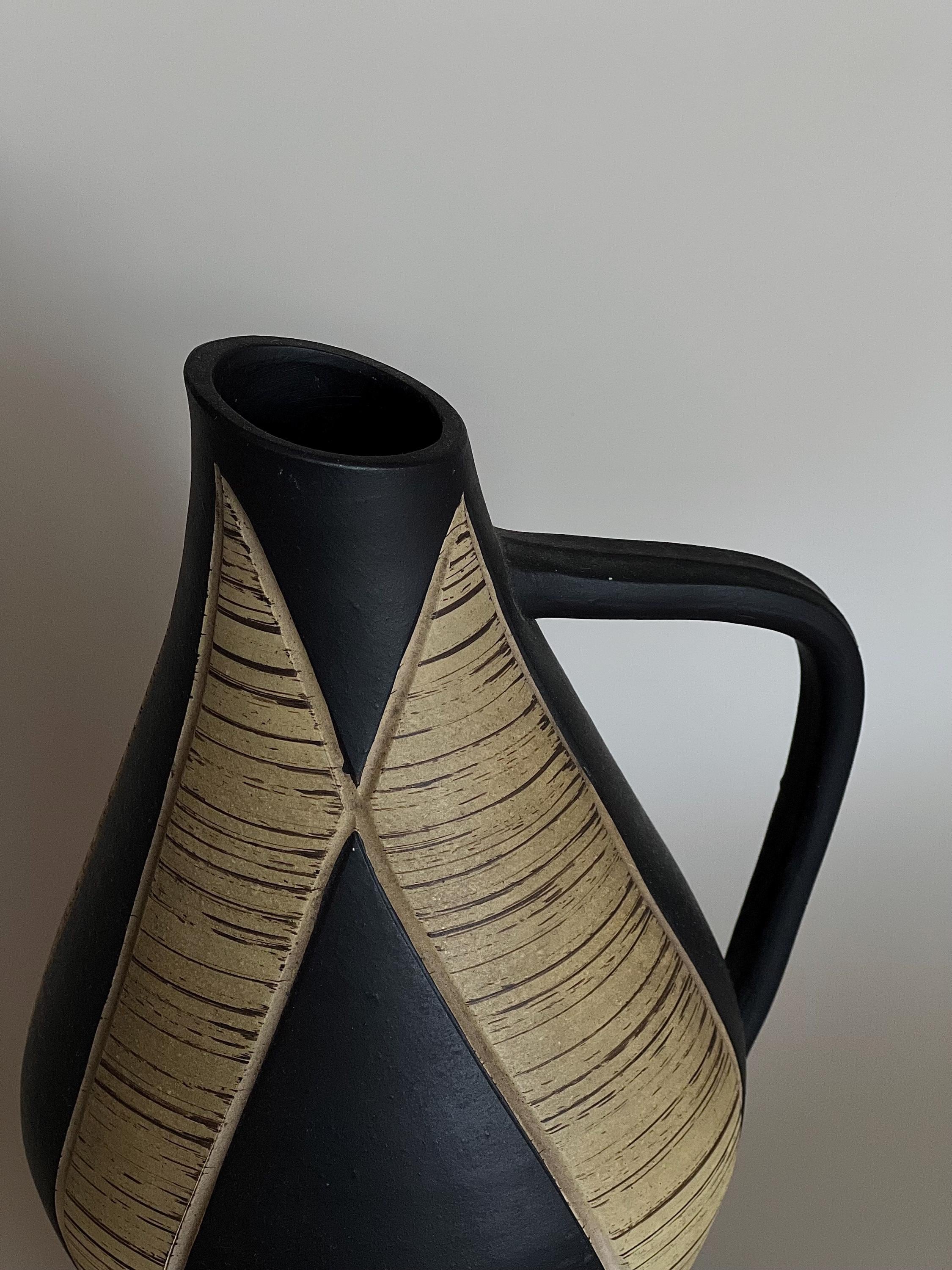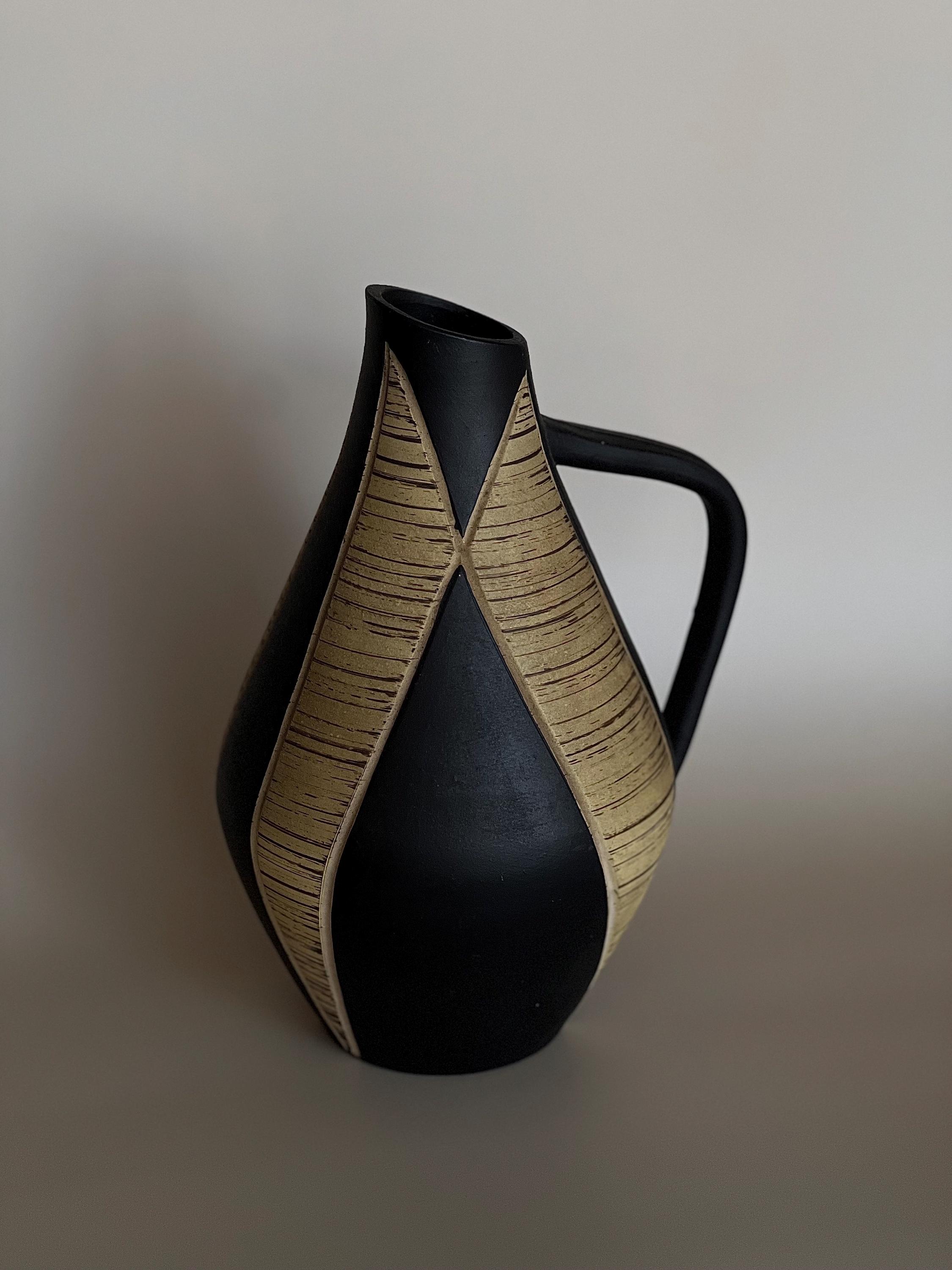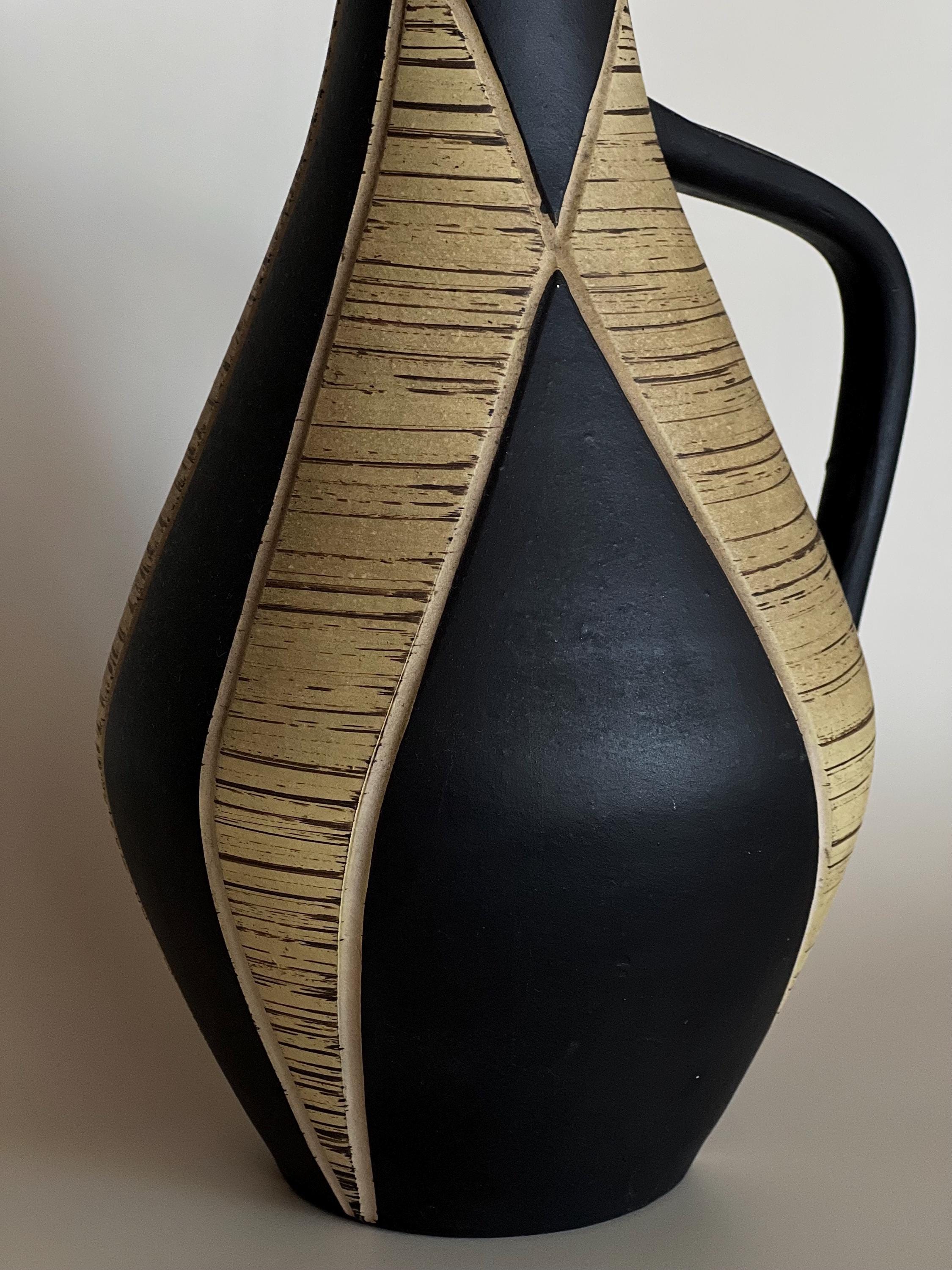 This striking vintage German handmade ceramic vase features a sculptural pitcher form with organic curves, a matte black body, and textured beige carved panels that create beautiful contrast. Minimalist yet warm — a perfect statement for a sideboard, shelf, or table styling.