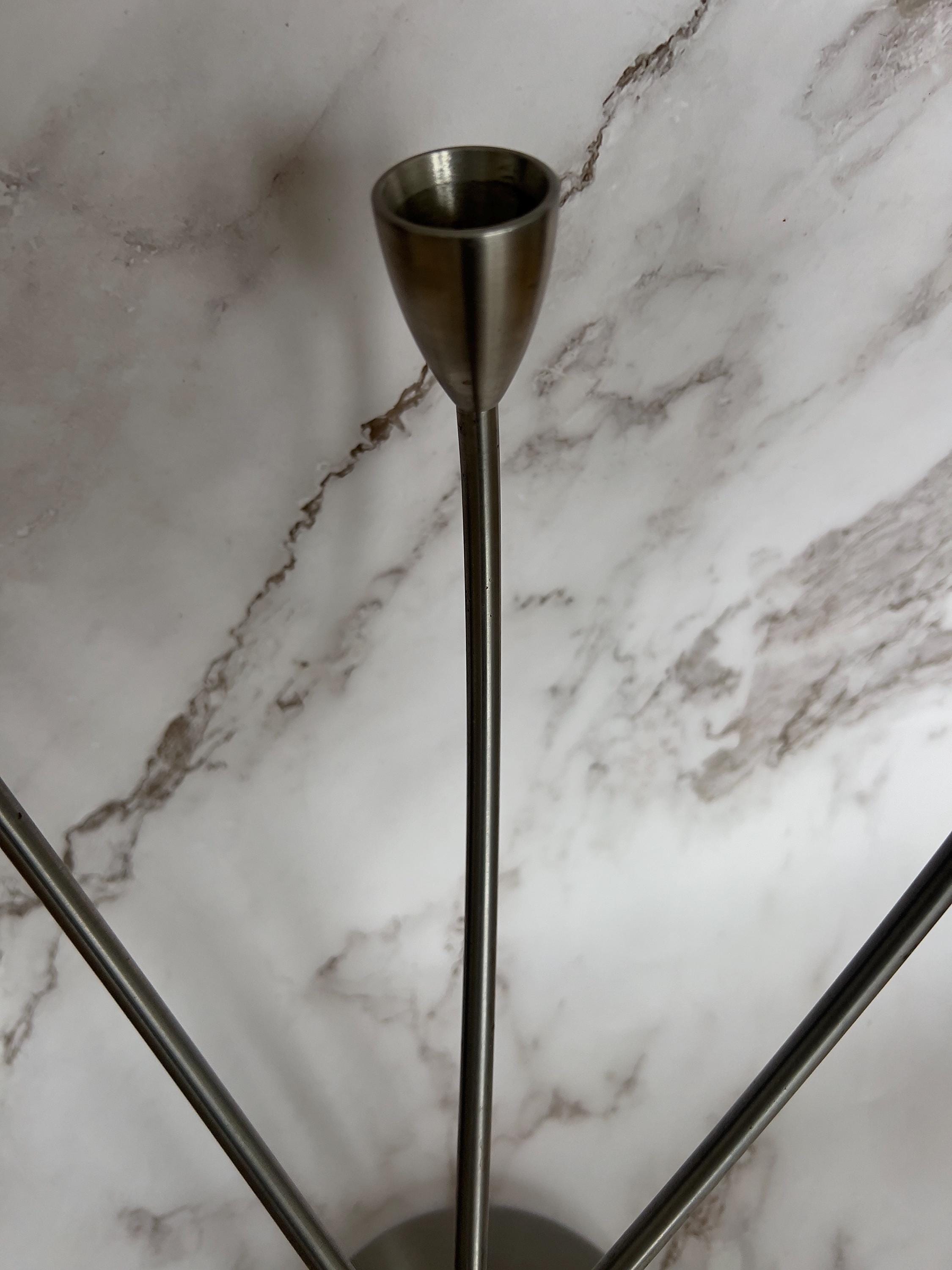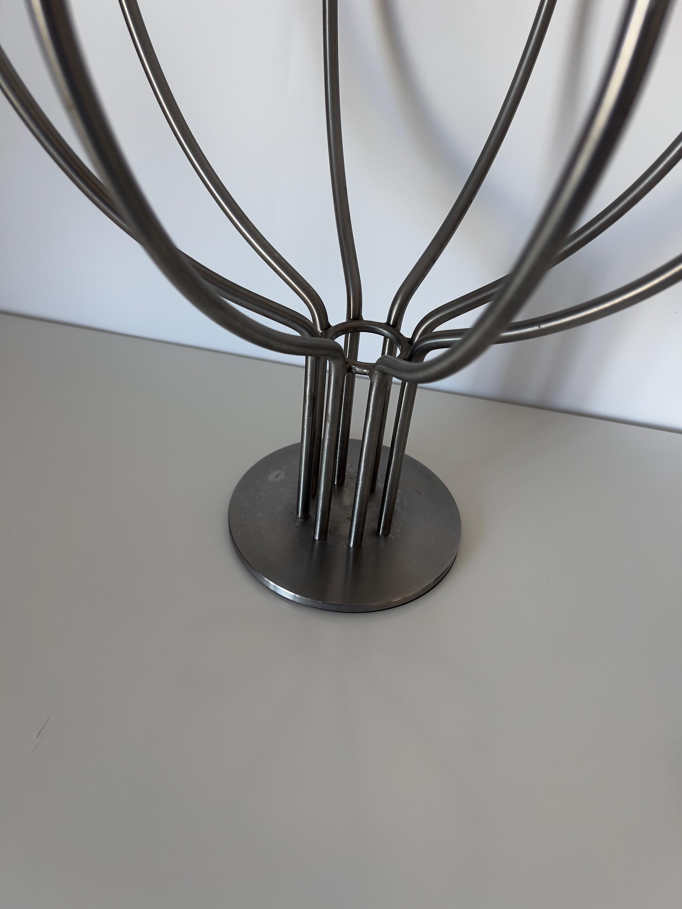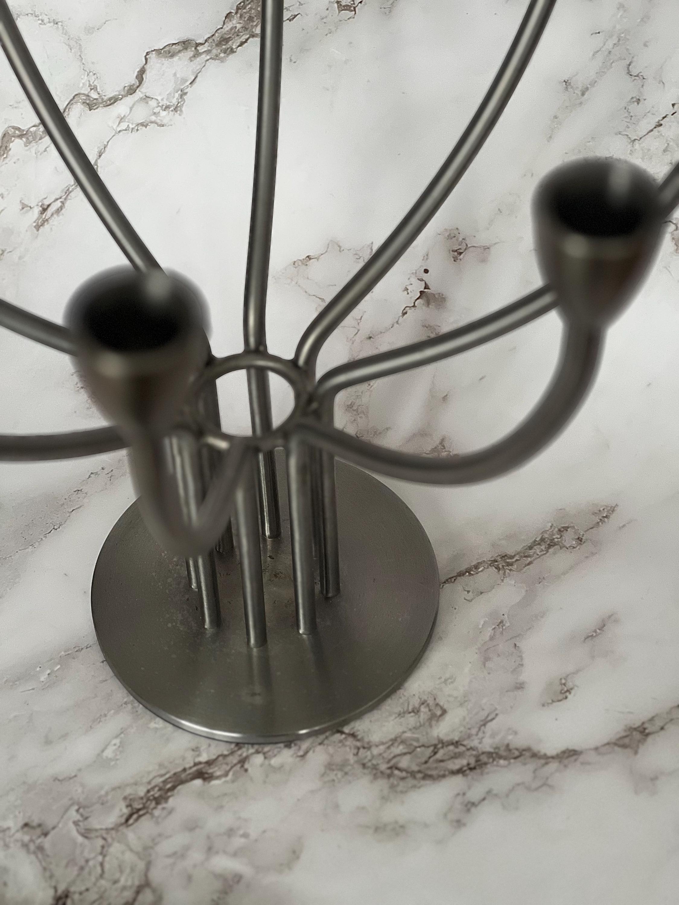 Finished in a muted brushed metal, it pairs easily with neutral interiors, stone surfaces, and natural textures. Strong enough to stand alone as an object, yet calm enough to live with every day. Statement decor for a dining table, console, or sideboard.