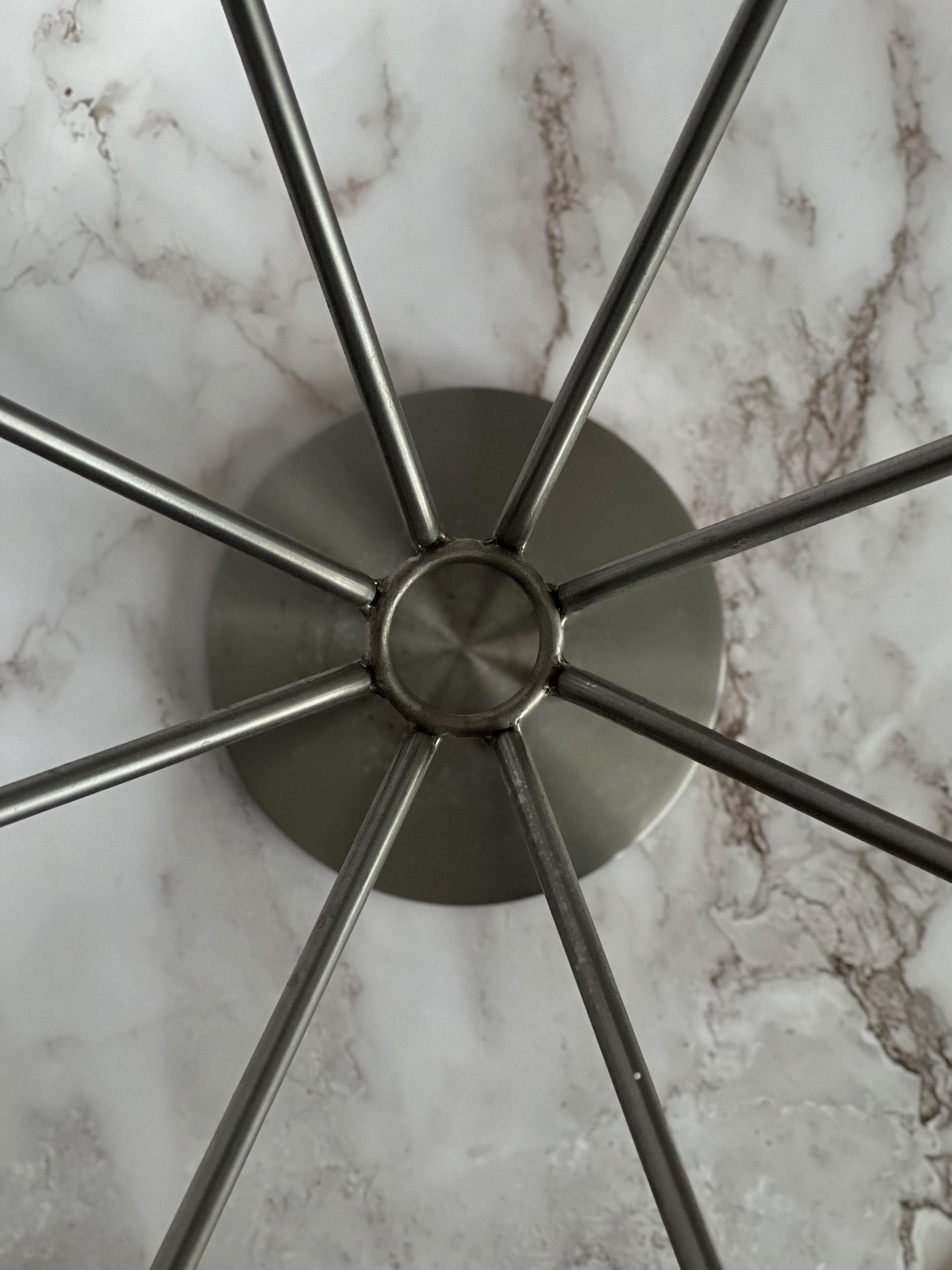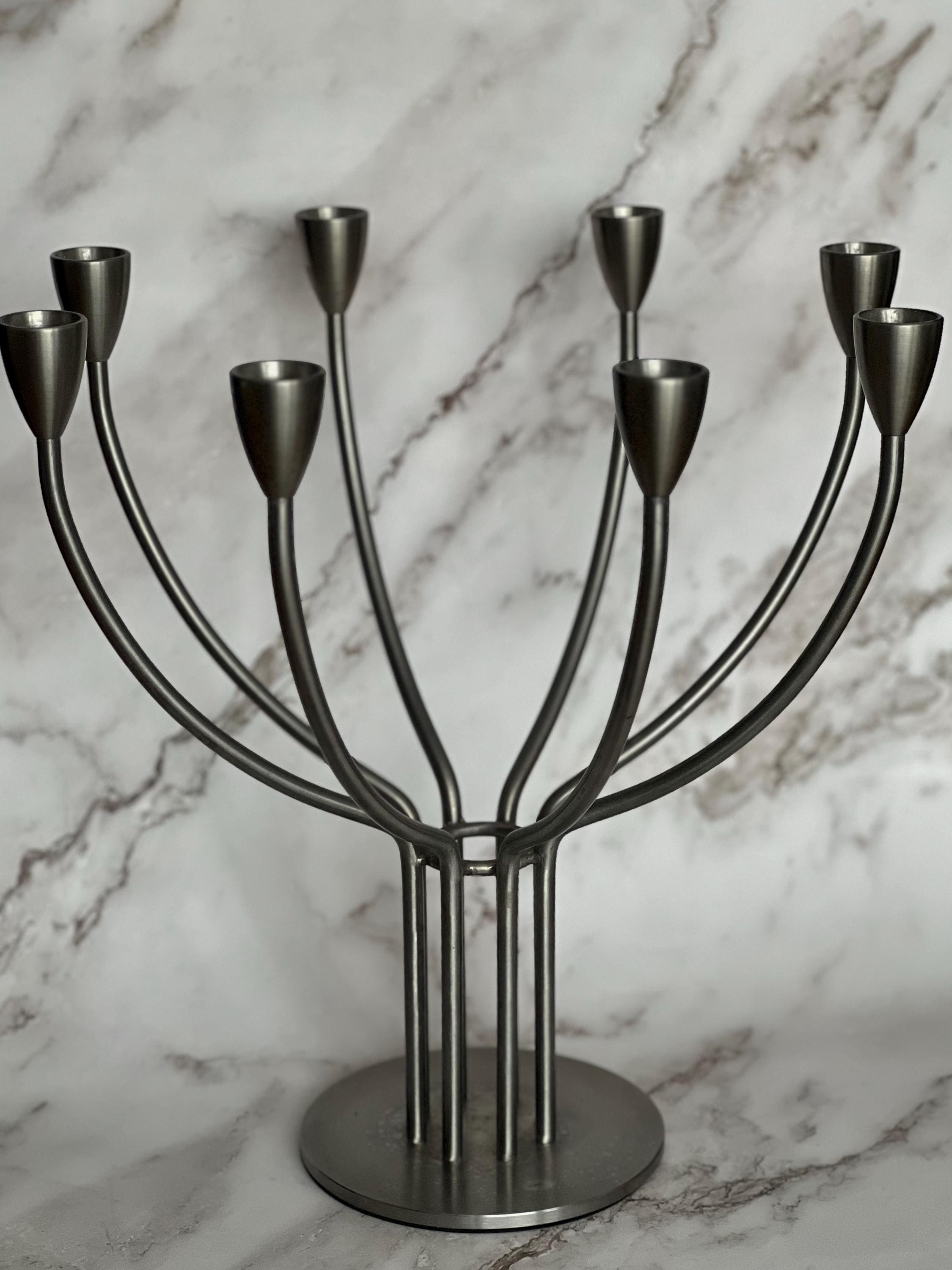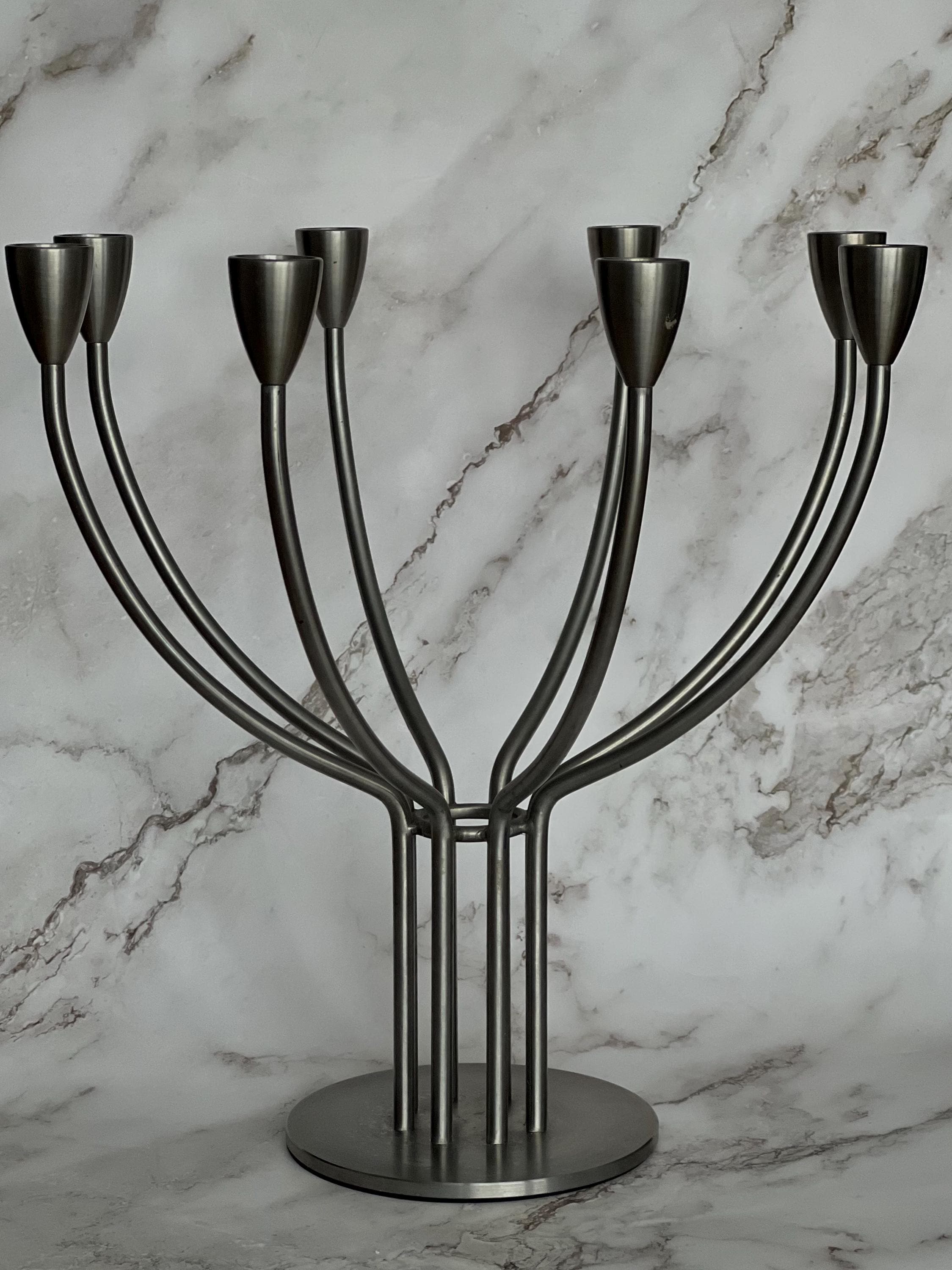 Finished in a muted brushed metal, it pairs easily with neutral interiors, stone surfaces, and natural textures. Strong enough to stand alone as an object, yet calm enough to live with every day. Statement decor for a dining table, console, or sideboard.