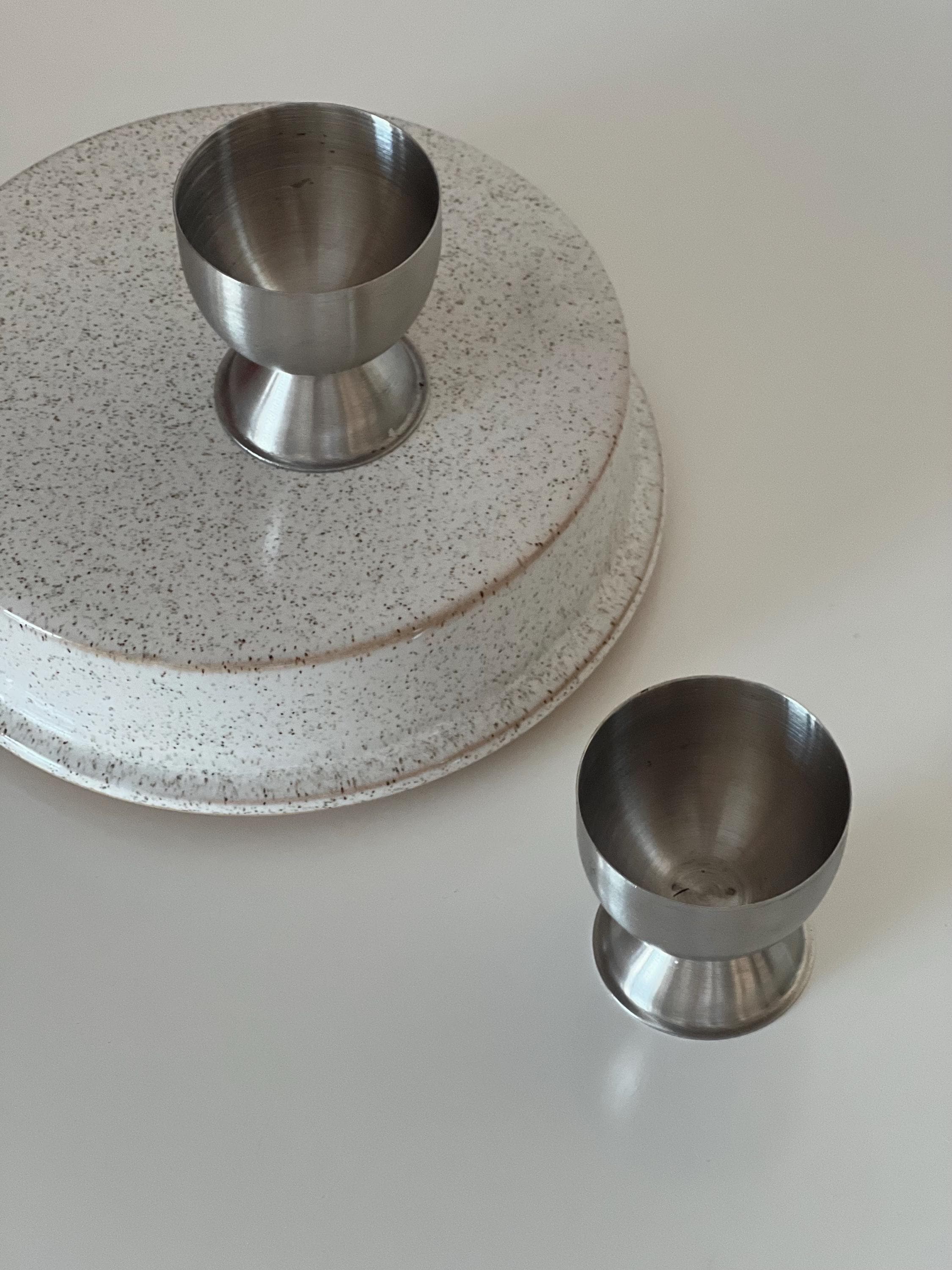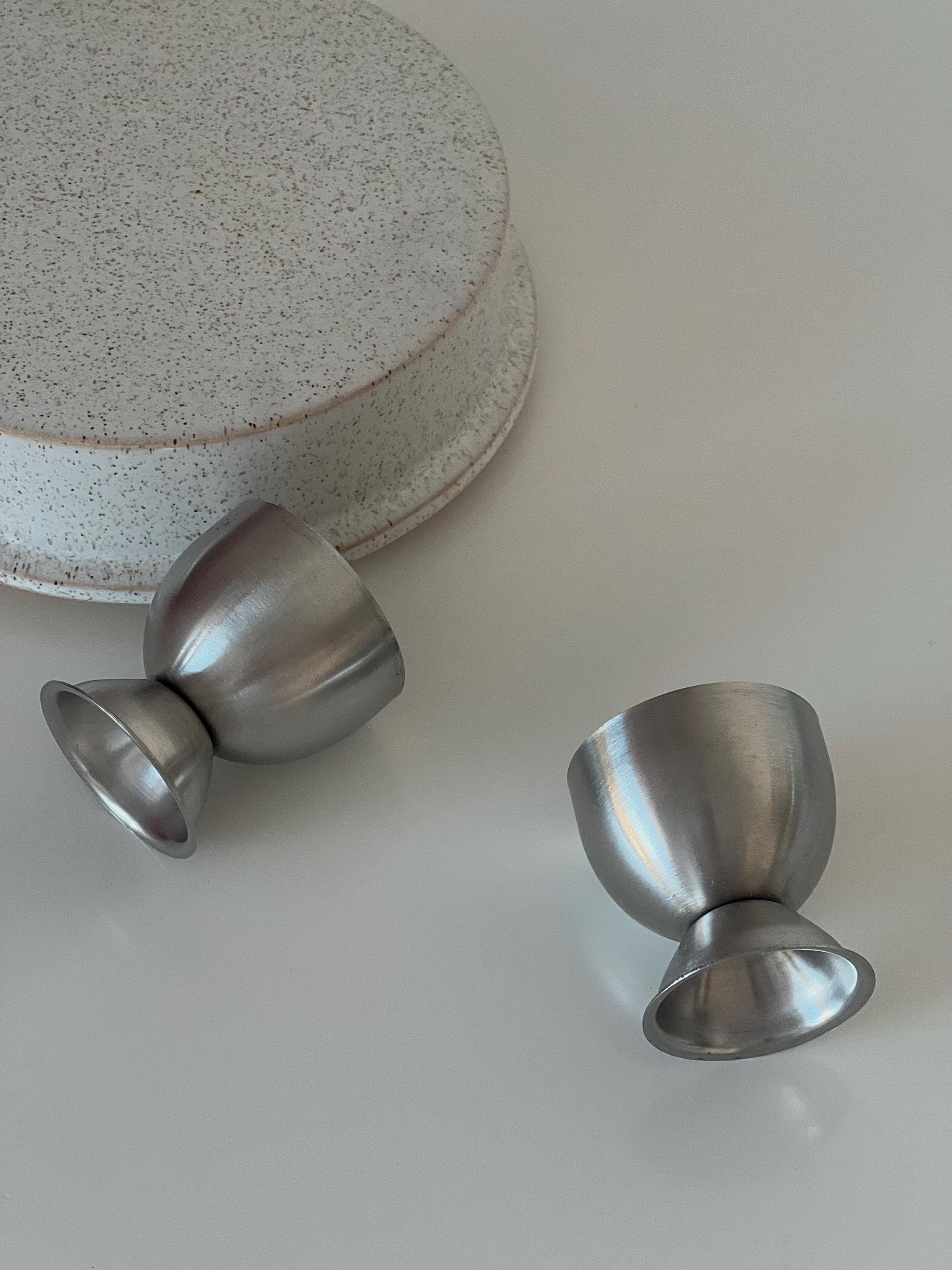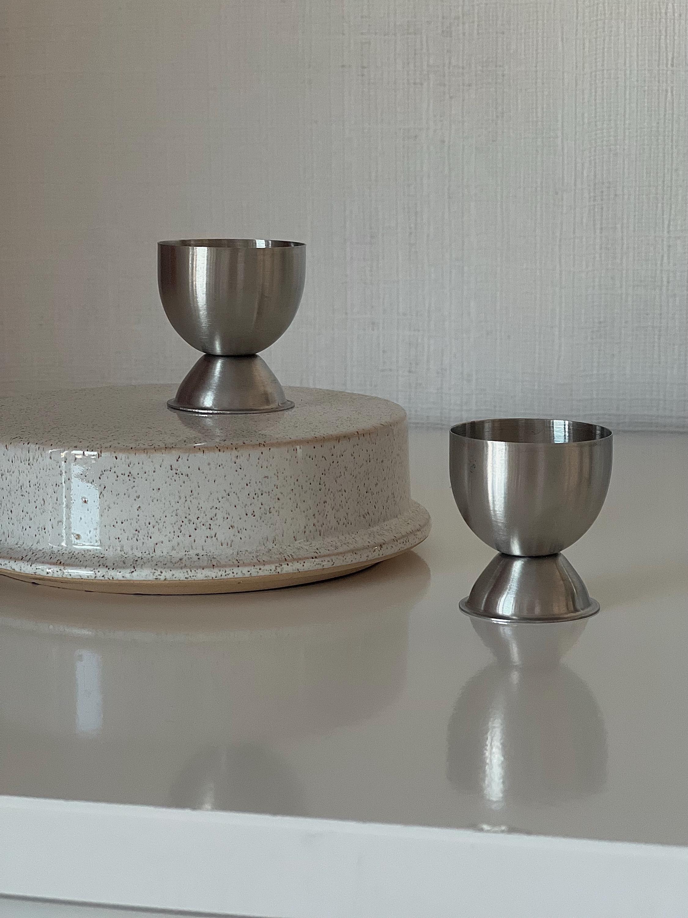 A beautifully simple pair of vintage stainless steel egg cups, designed in the spirit of Bauhaus modernism. Clean lines, balanced proportions, and a soft industrial sheen give these pieces a timeless presence on the breakfast table.