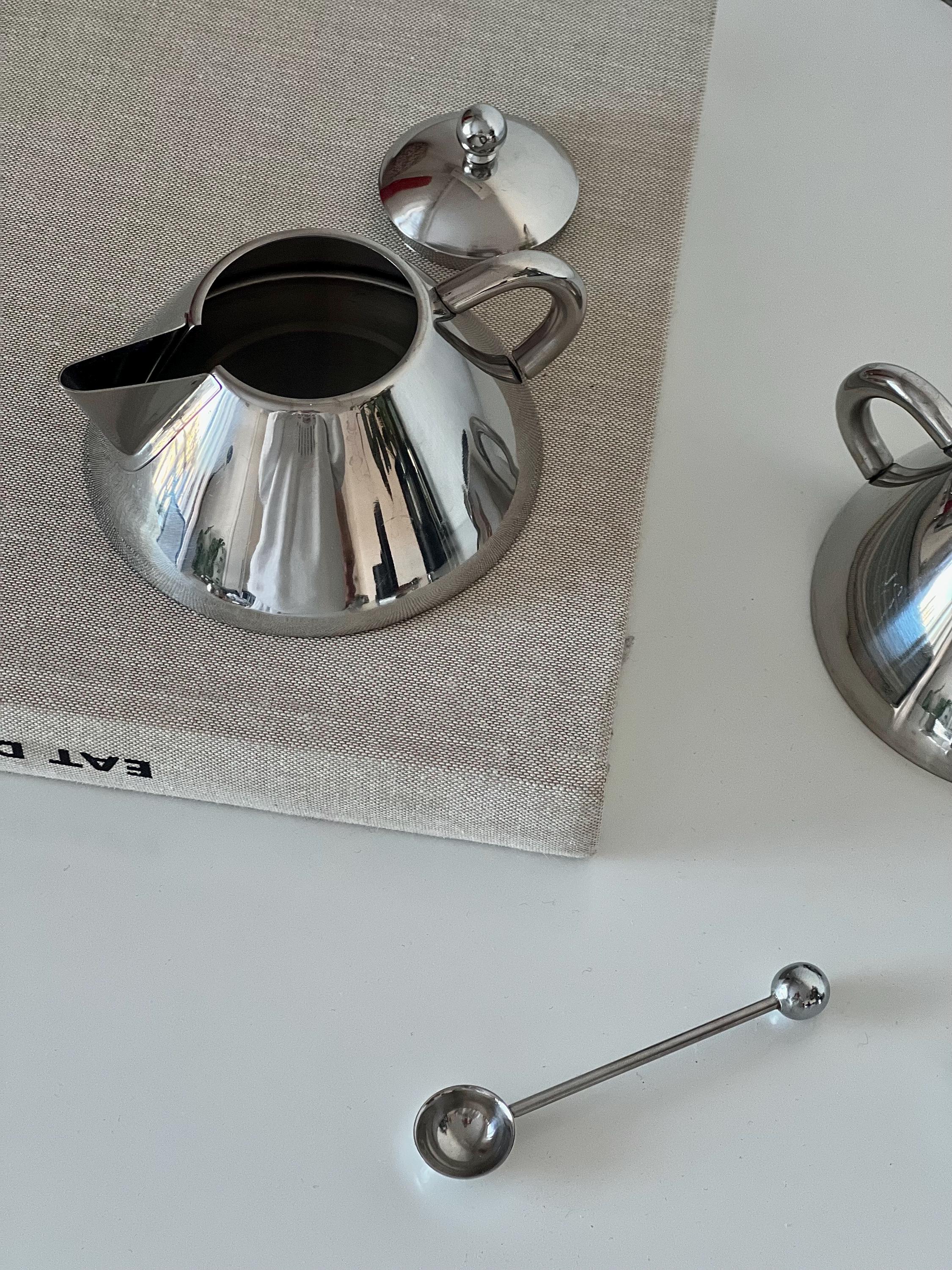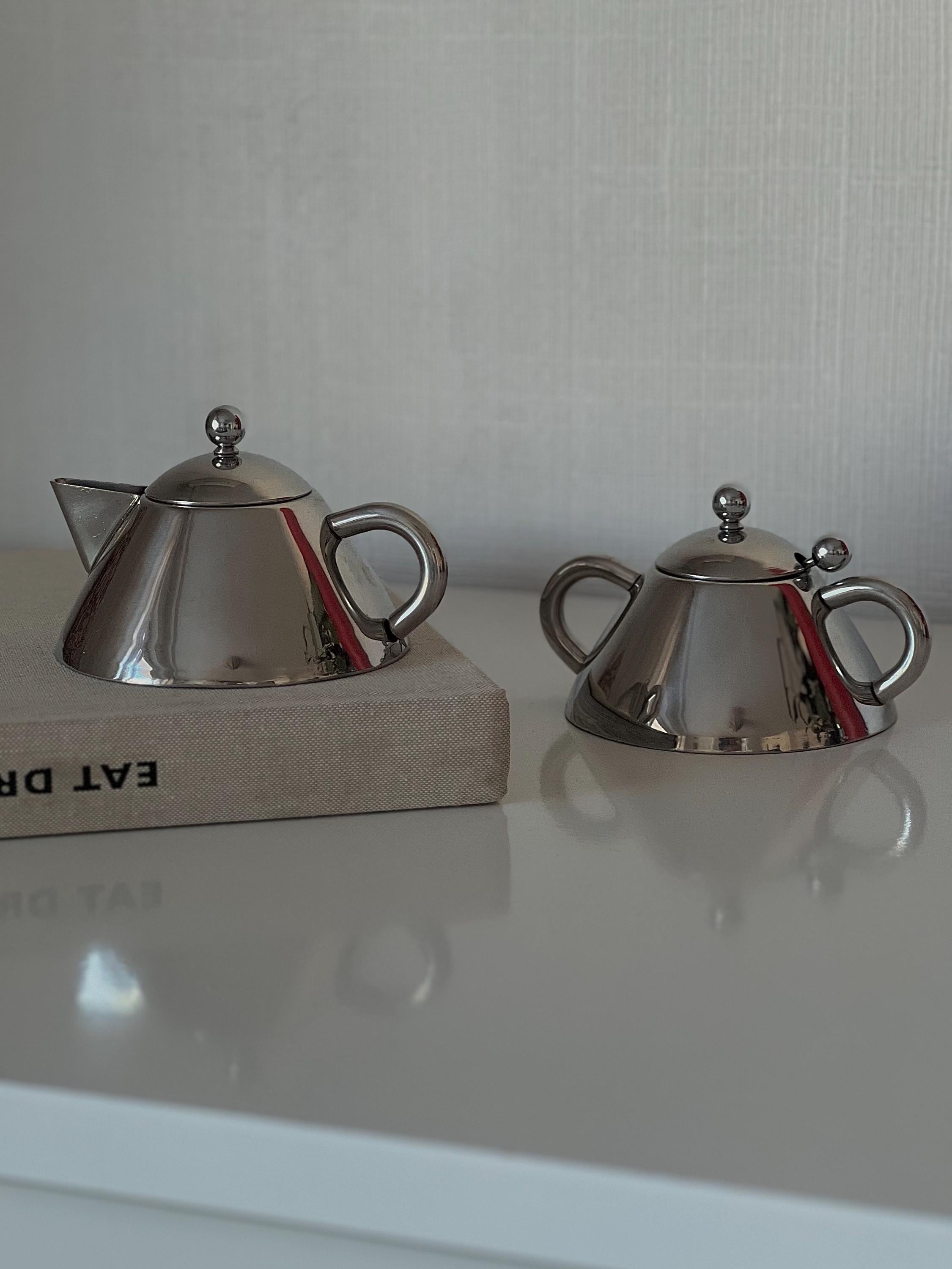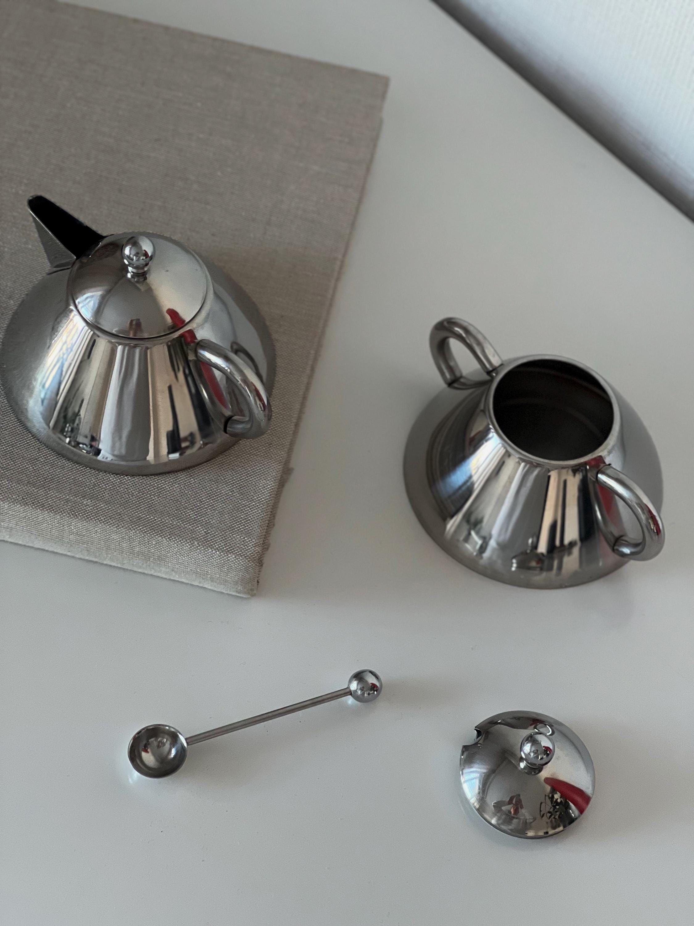 A sculptural mid-century modern sugar bowl and creamer set with soft curves and a polished stainless steel finish. Minimal yet expressive, this Alessi-style duo adds quiet character to a coffee station, breakfast table, or open shelf decor.