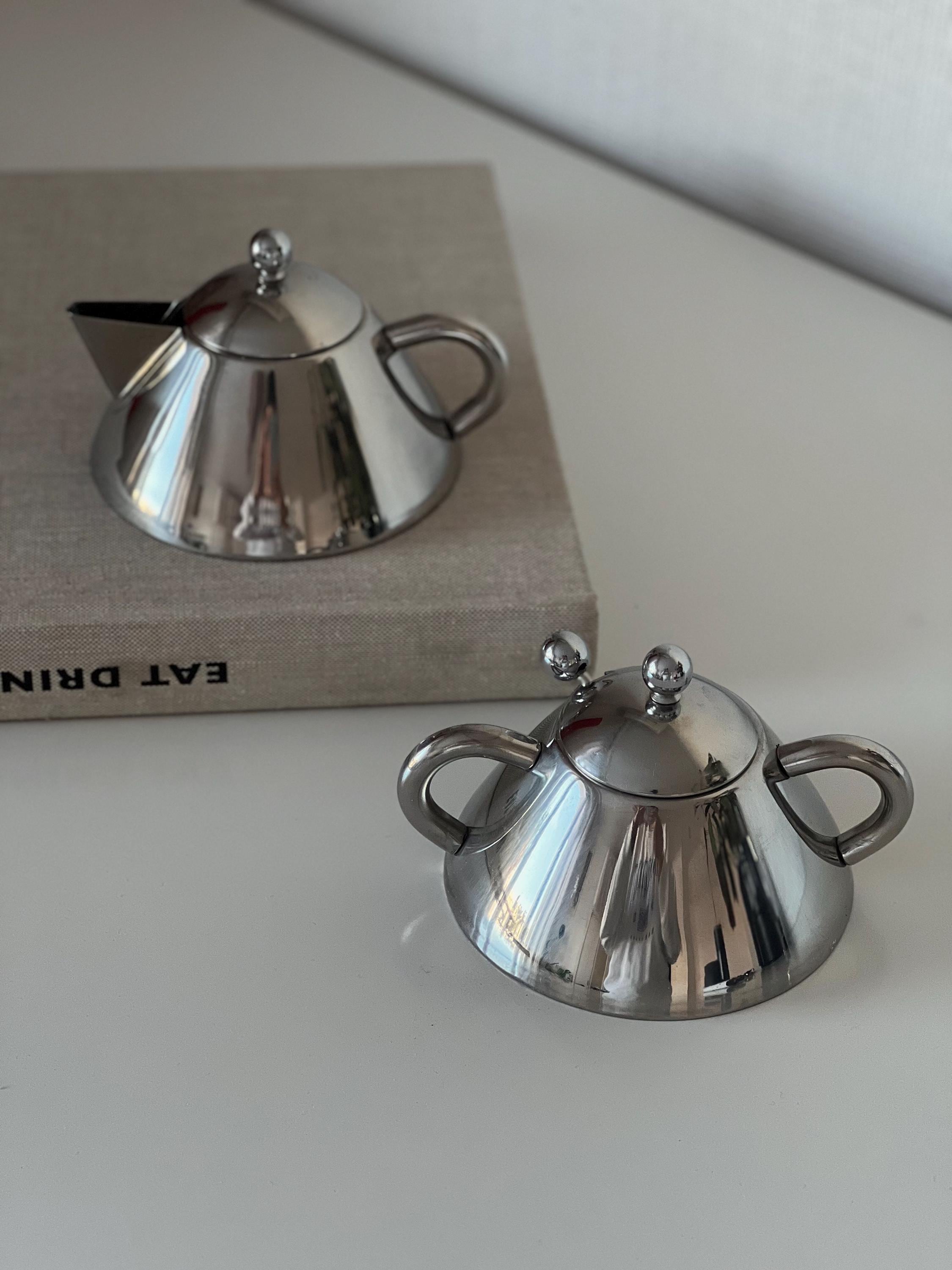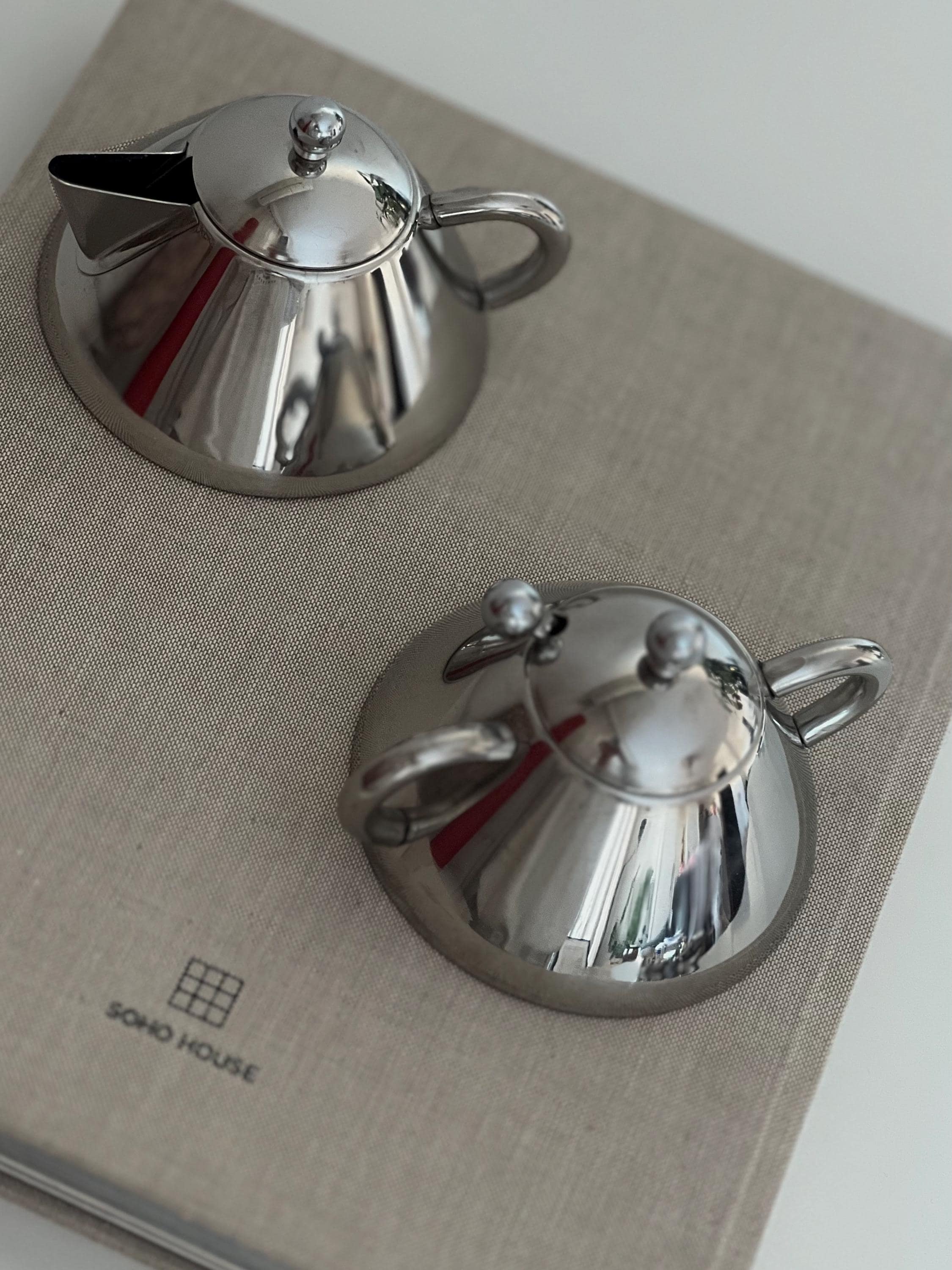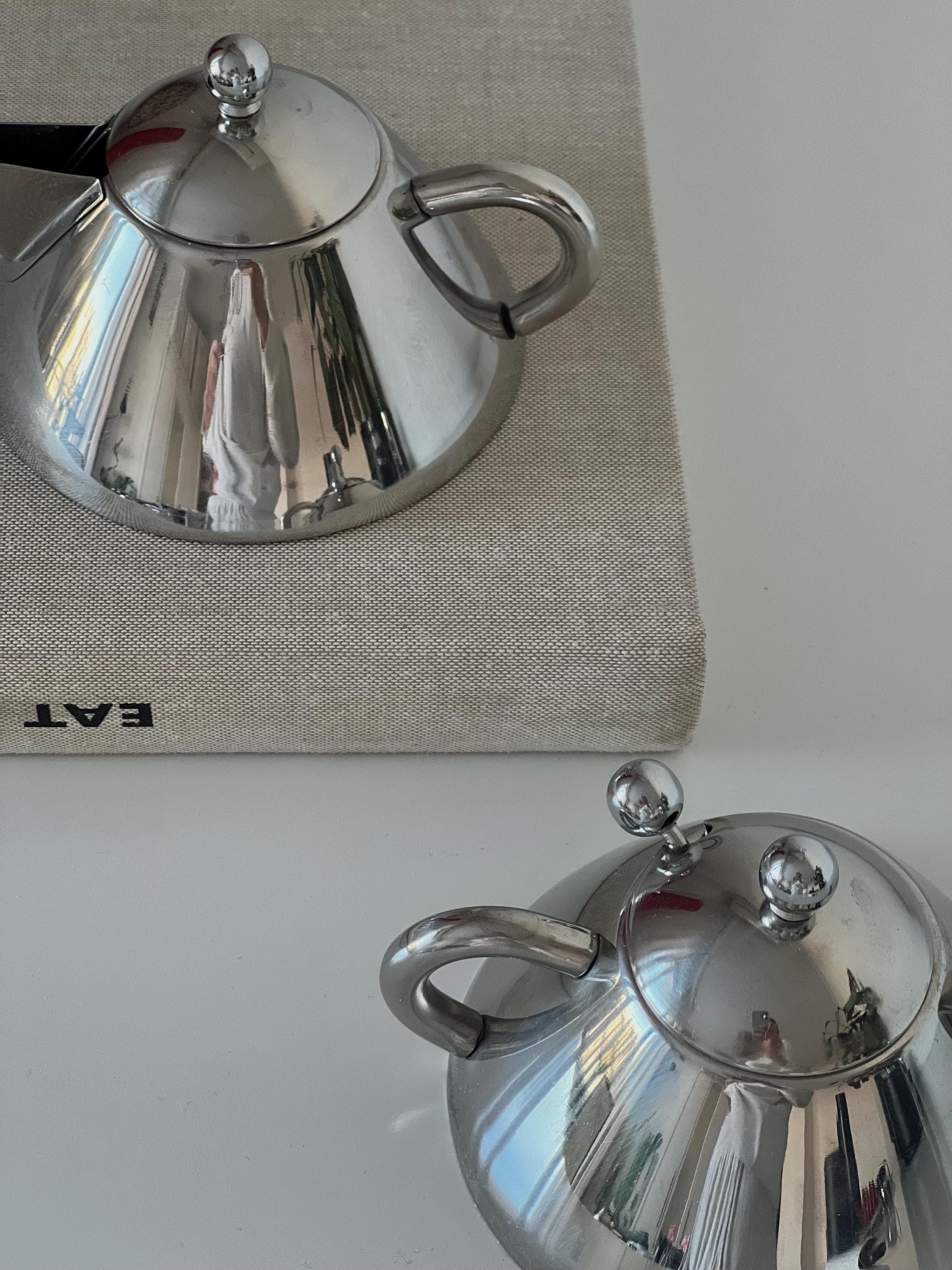 A sculptural mid-century modern sugar bowl and creamer set with soft curves and a polished stainless steel finish. Minimal yet expressive, this Alessi-style duo adds quiet character to a coffee station, breakfast table, or open shelf decor.