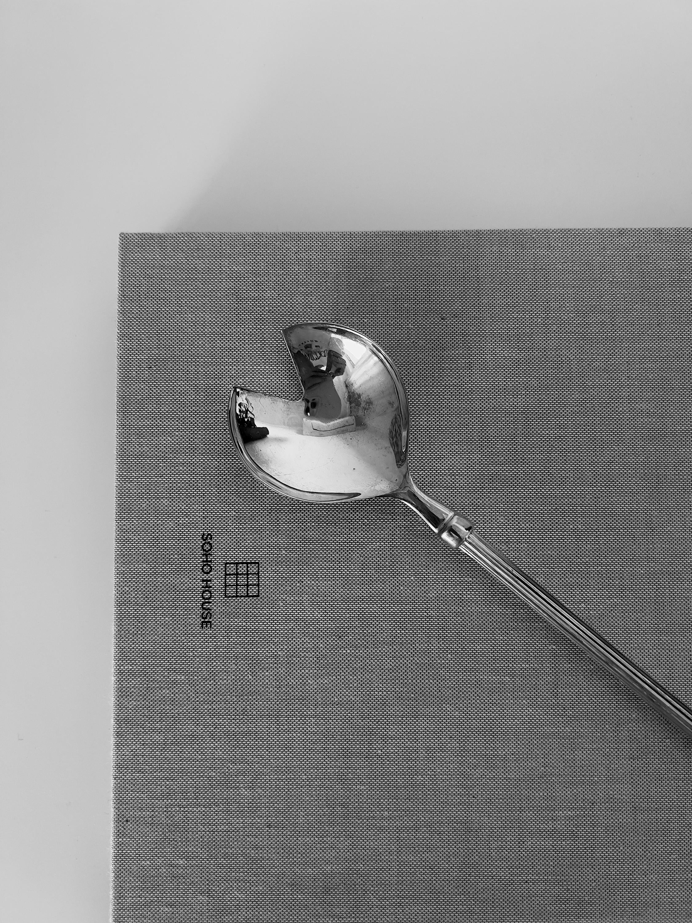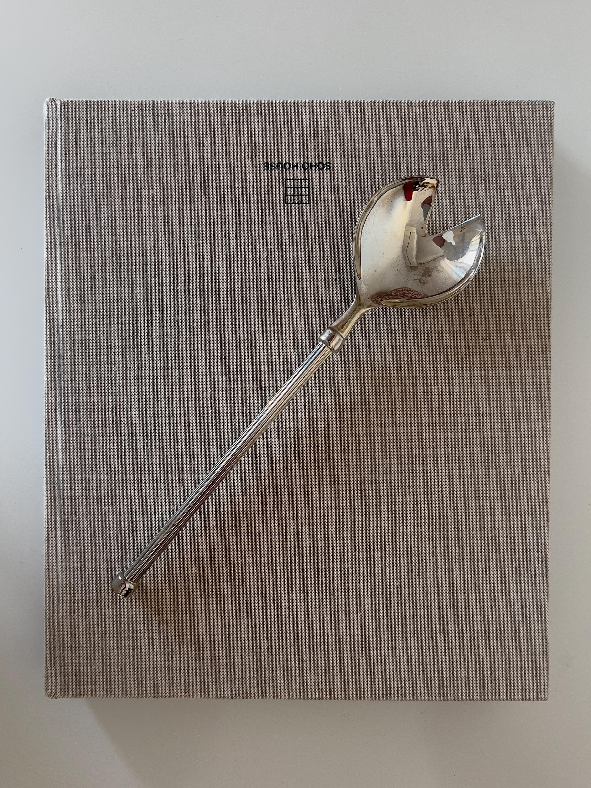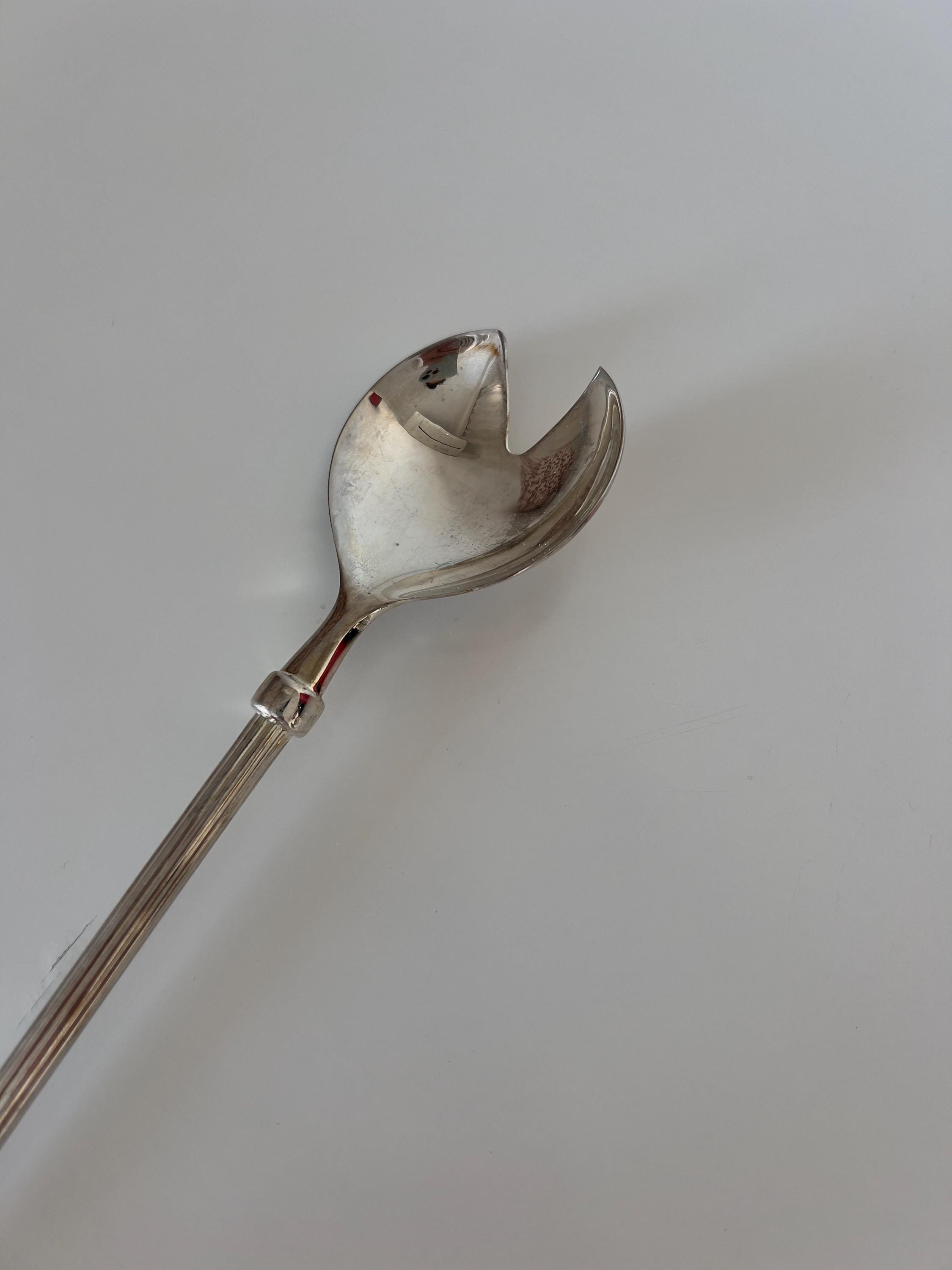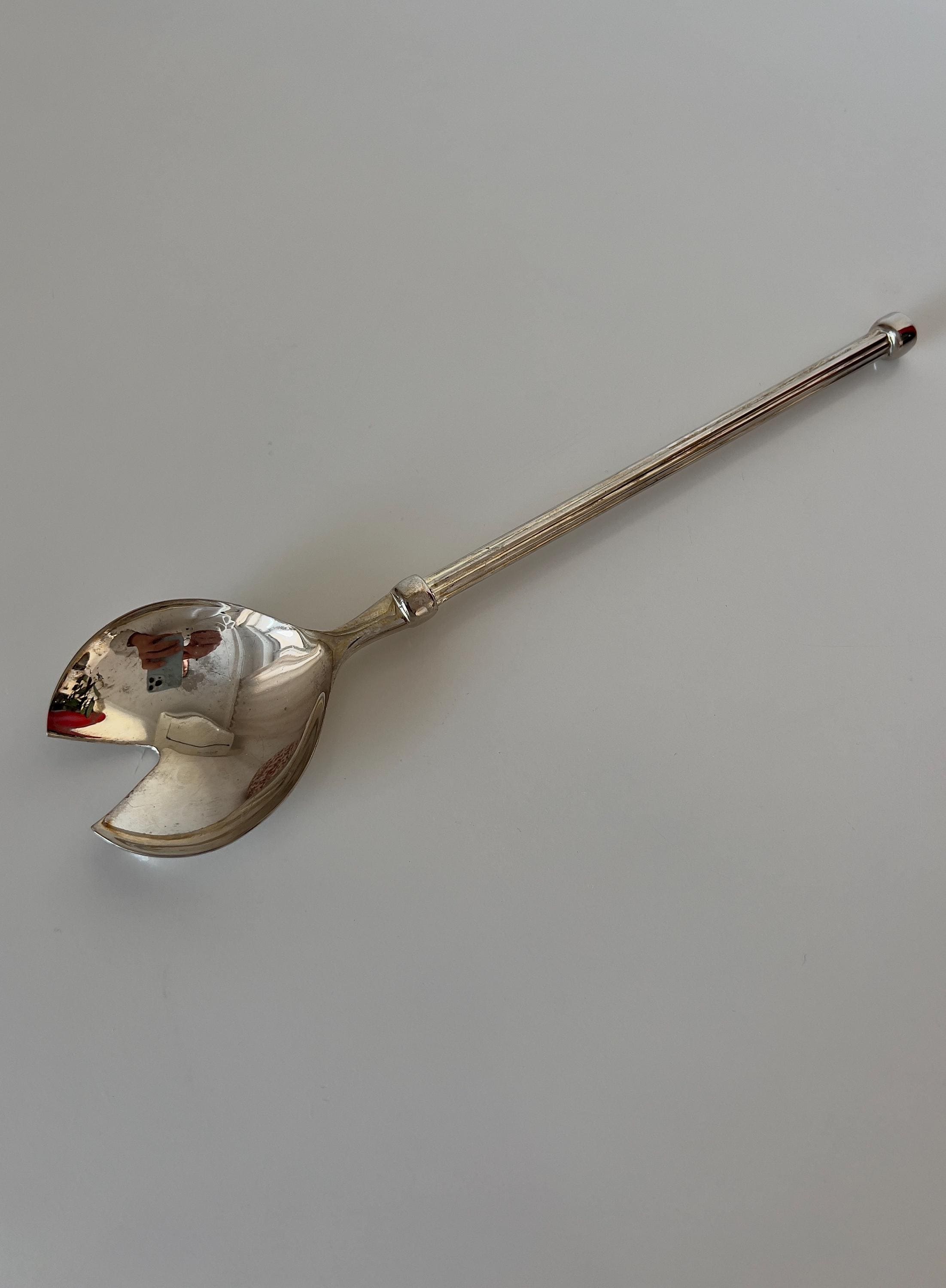 Mid-century modern alpaca silver serving spoon with sculptural cutout bowl and elegant vertical-lined handle. Made from durable nickel silver and stamped SOHO HOUSE, this piece was likely created for hospitality use in the 1950s–70s.