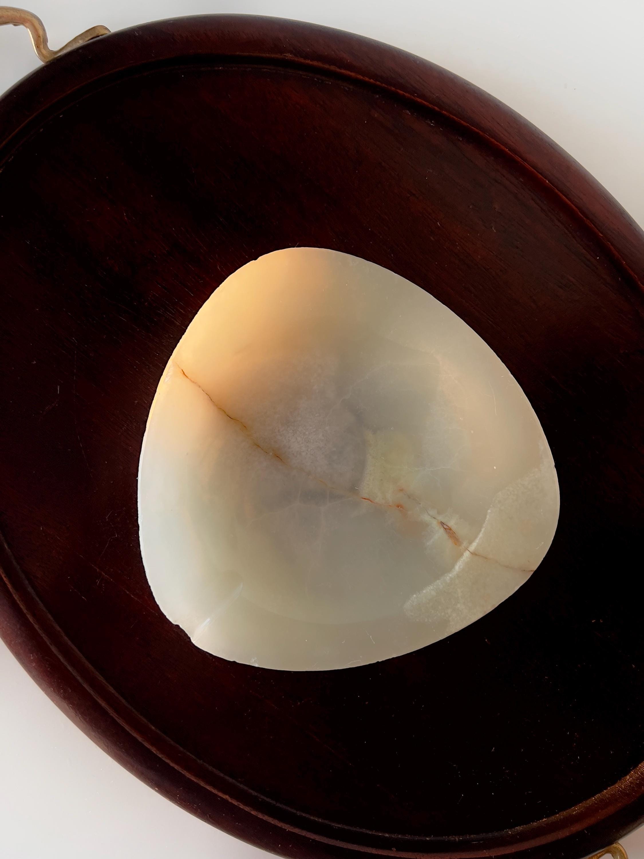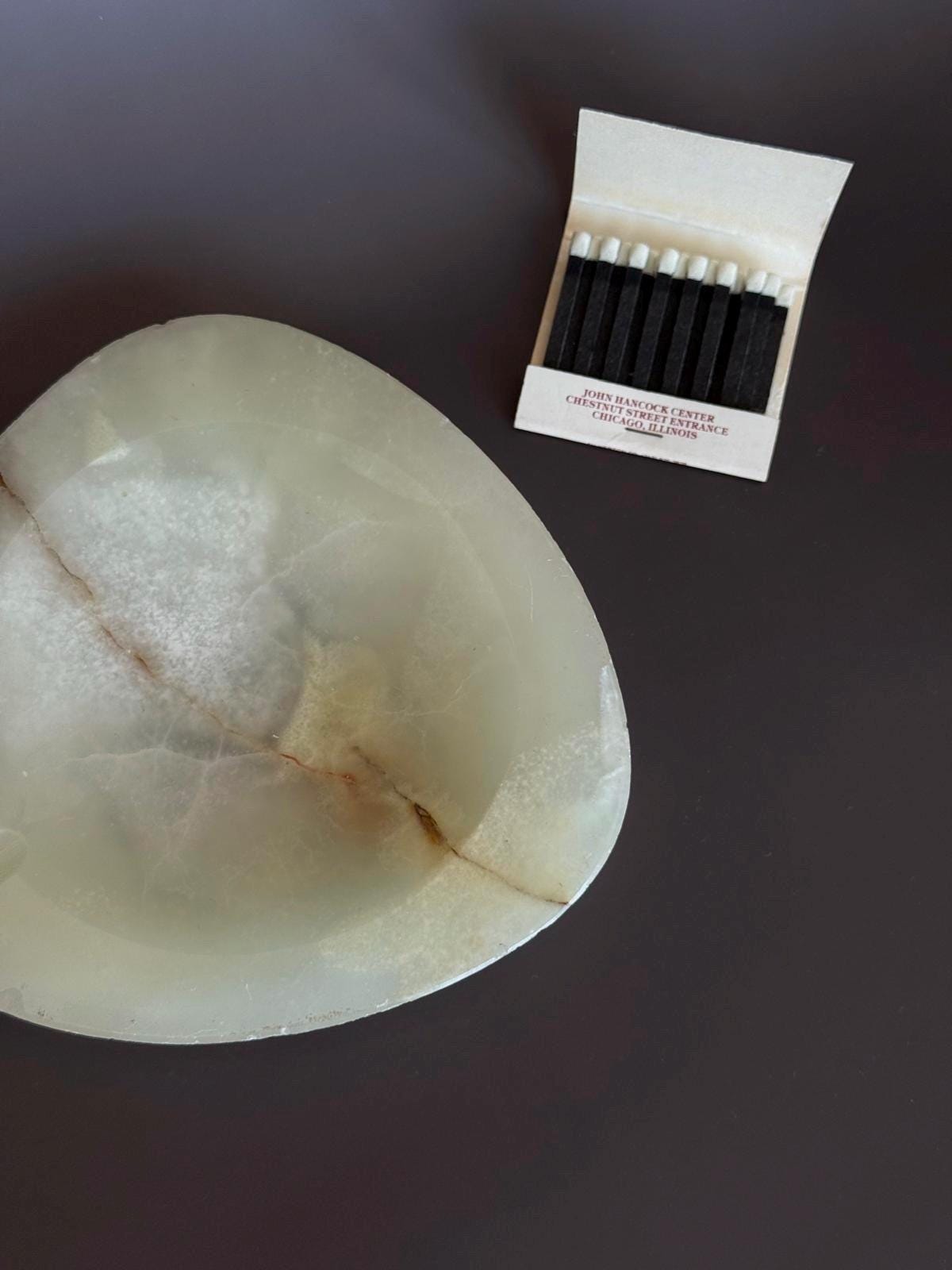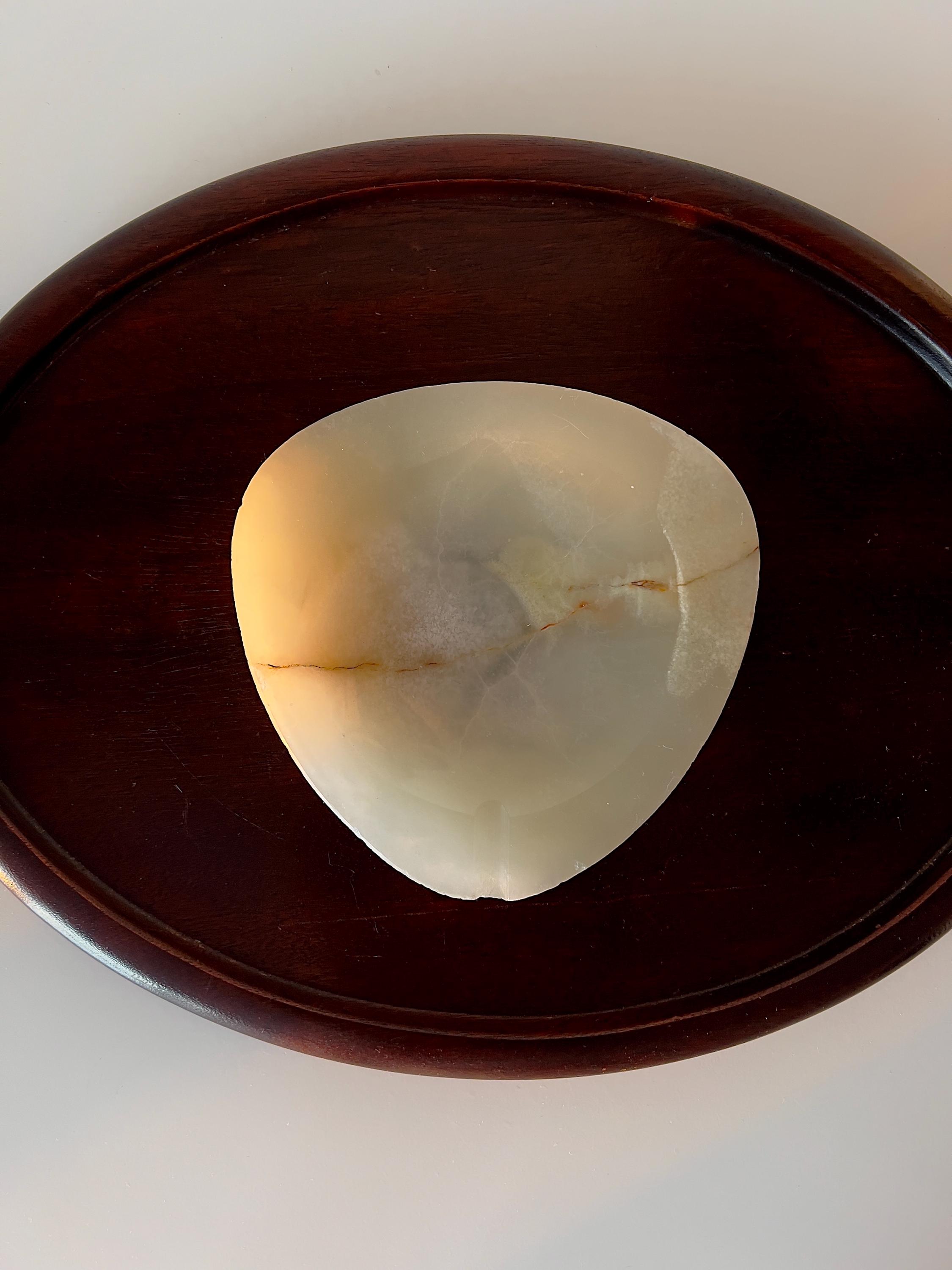 Mid Century Modern onyx ashtray with a smooth oval triangal form and natural stone veining. Originally designed as an ashtray, it also works beautifully as a jewelry tray, trinket dish, or ring holder. A sculptural, understated piece that adds quiet texture to any surface.