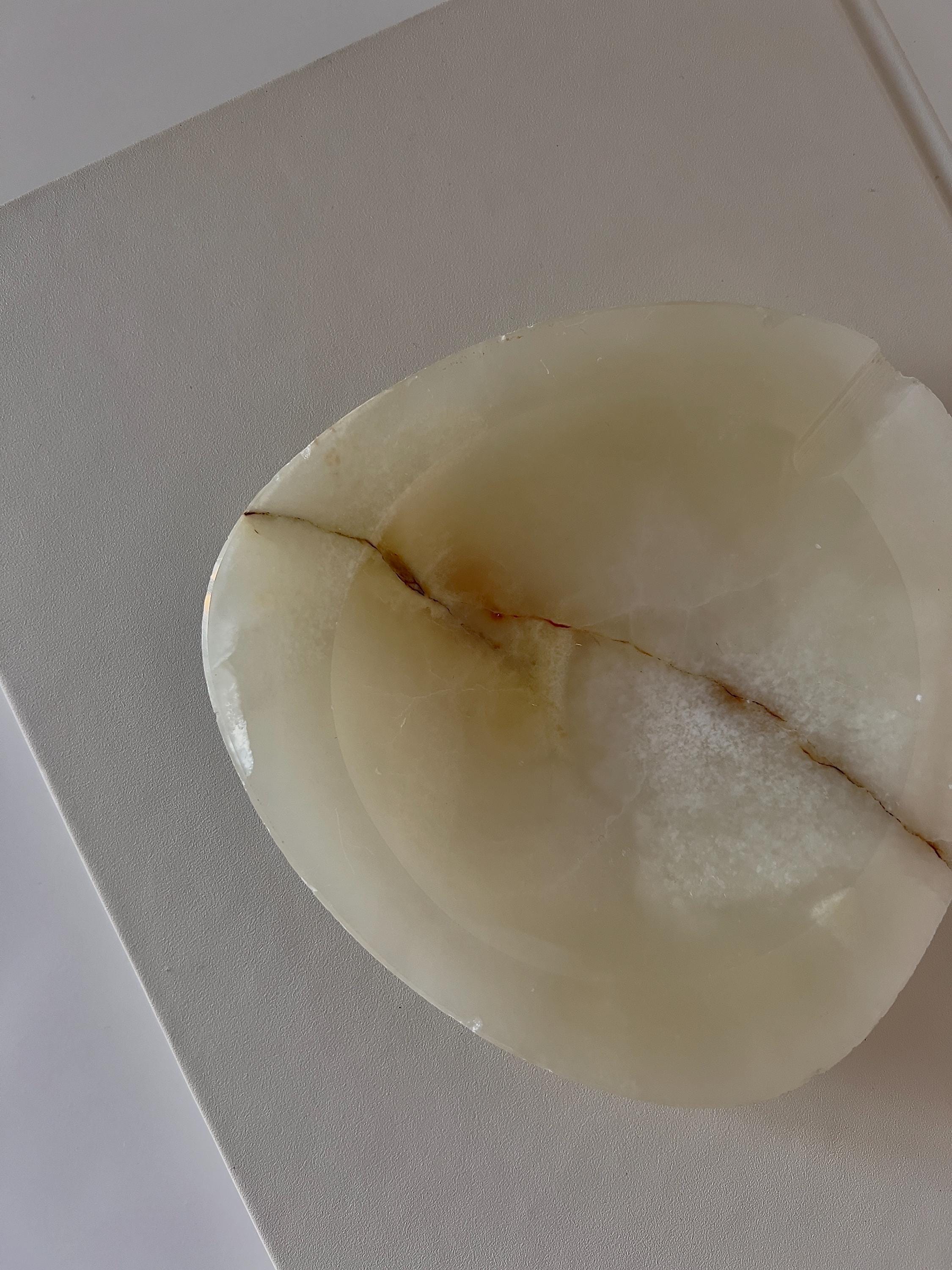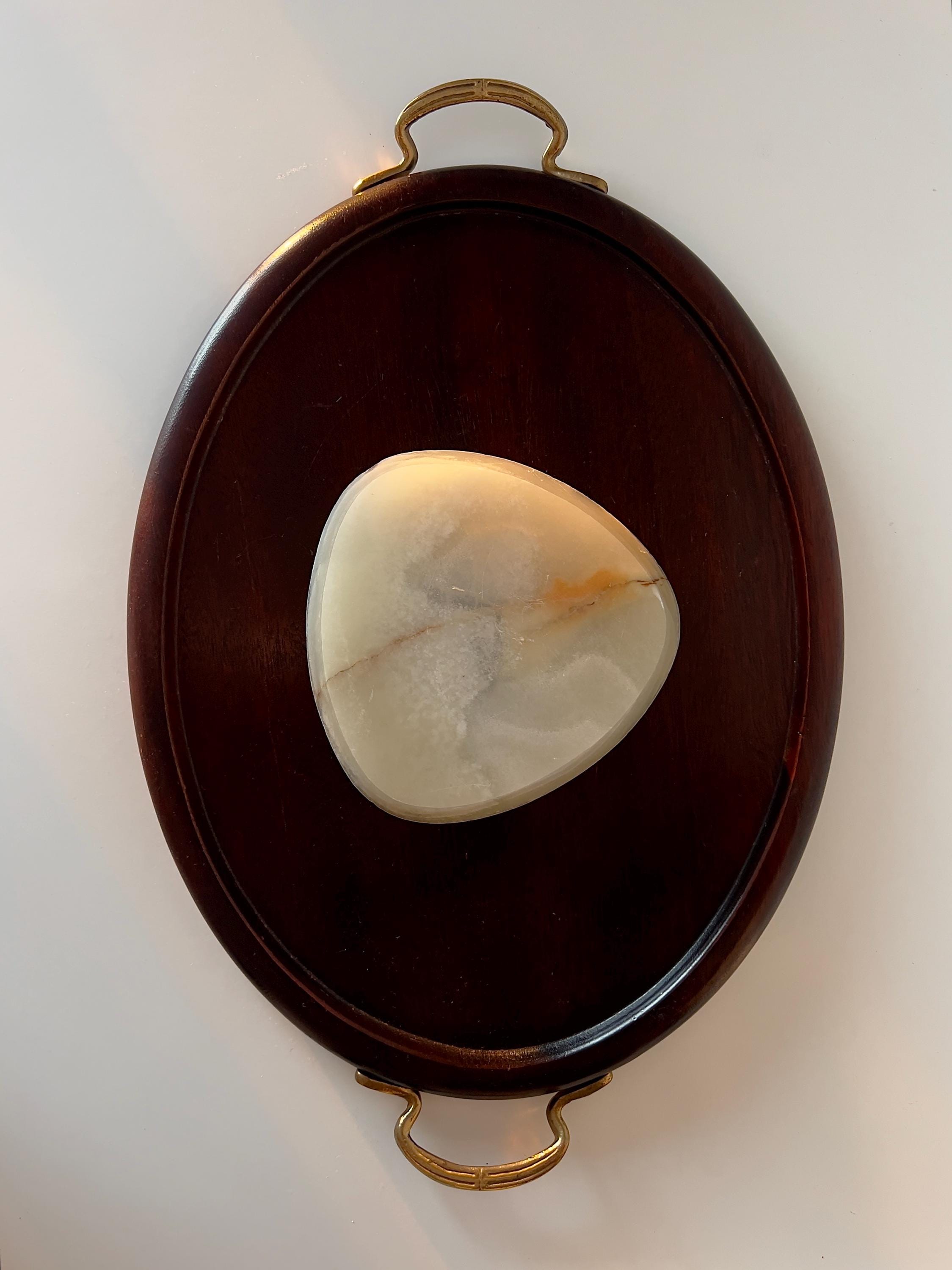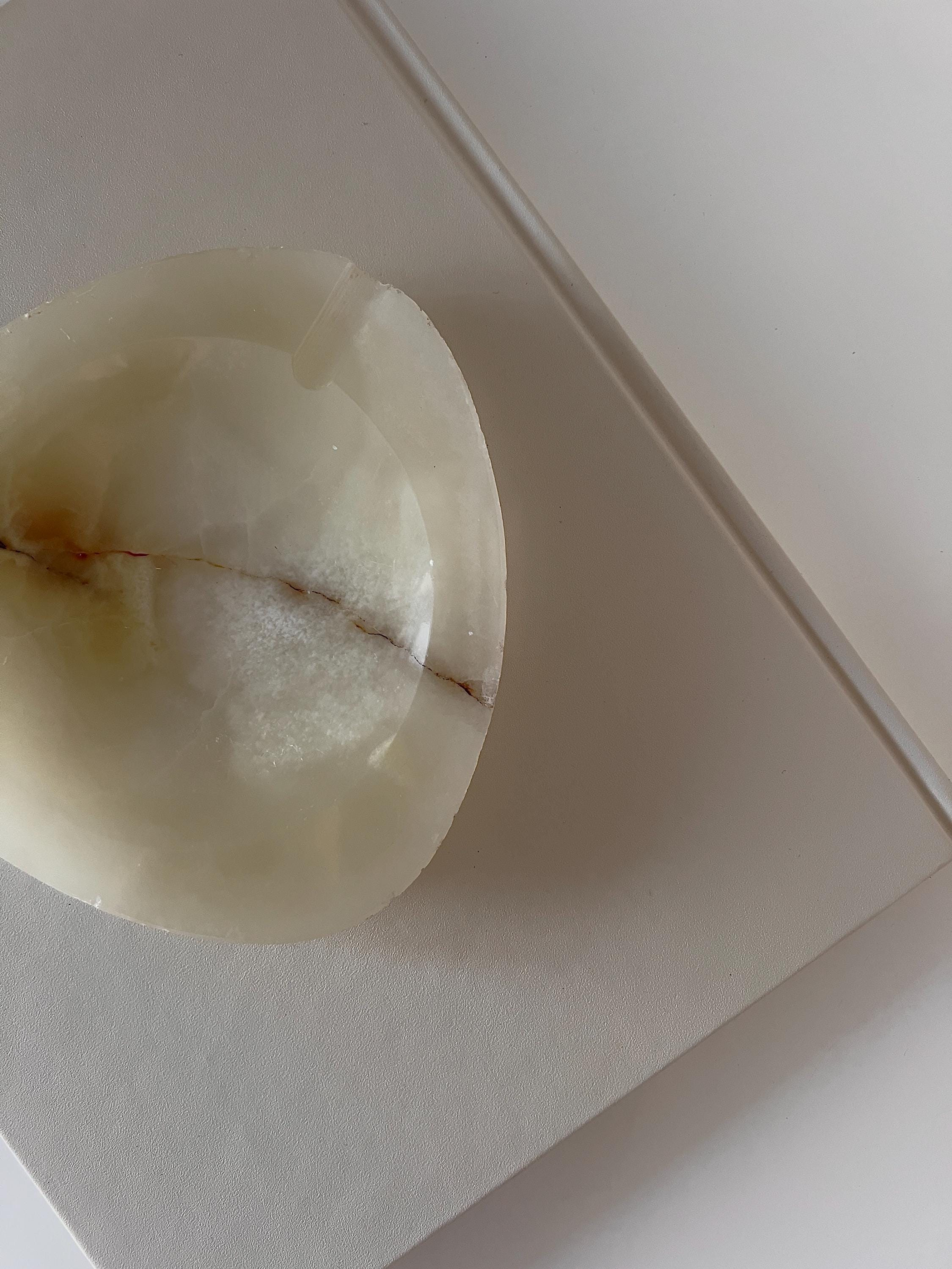 Mid Century Modern onyx ashtray with a smooth oval triangal form and natural stone veining. Originally designed as an ashtray, it also works beautifully as a jewelry tray, trinket dish, or ring holder. A sculptural, understated piece that adds quiet texture to any surface.