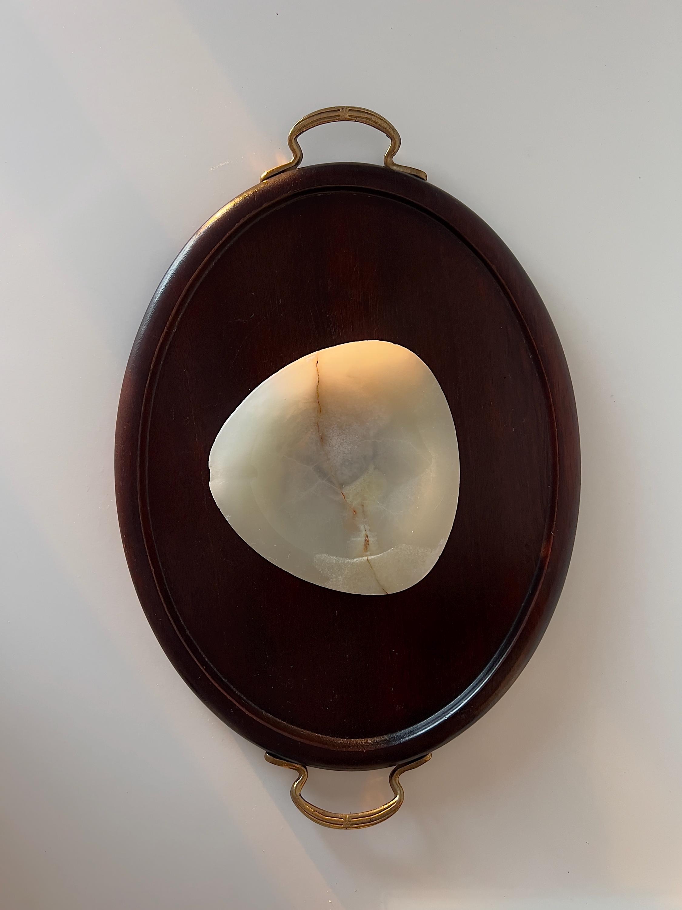This particular ashtray, with its triangular form and polished surface, likely dates from the mid-20th century, a period when decorative stone items were popular as home accessories. The natural veining within the onyx adds a unique character to each piece, making it a distinctive decorative item. Its design suggests it was intended for both utility and aesthetic appeal, fitting into various interior design styles.