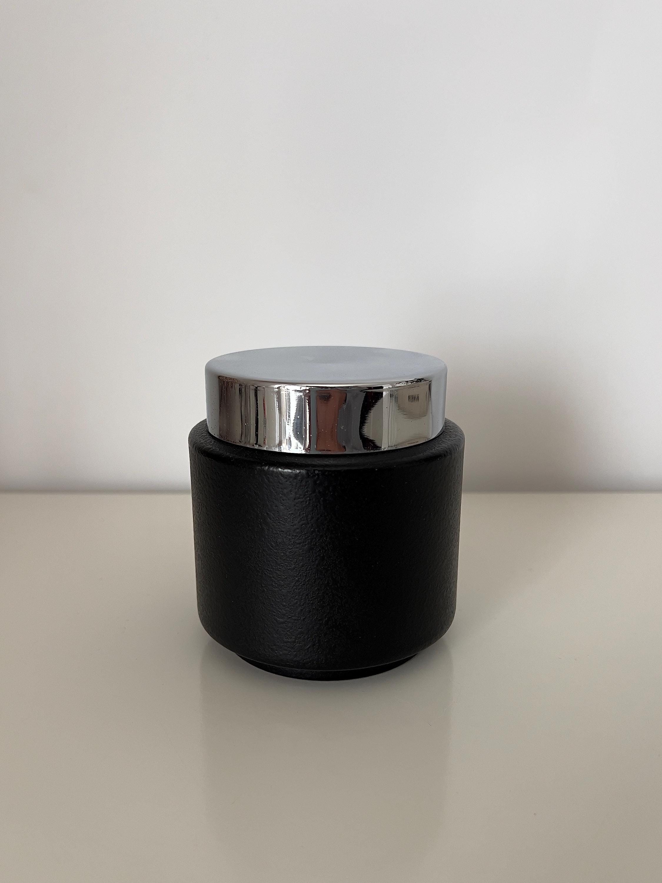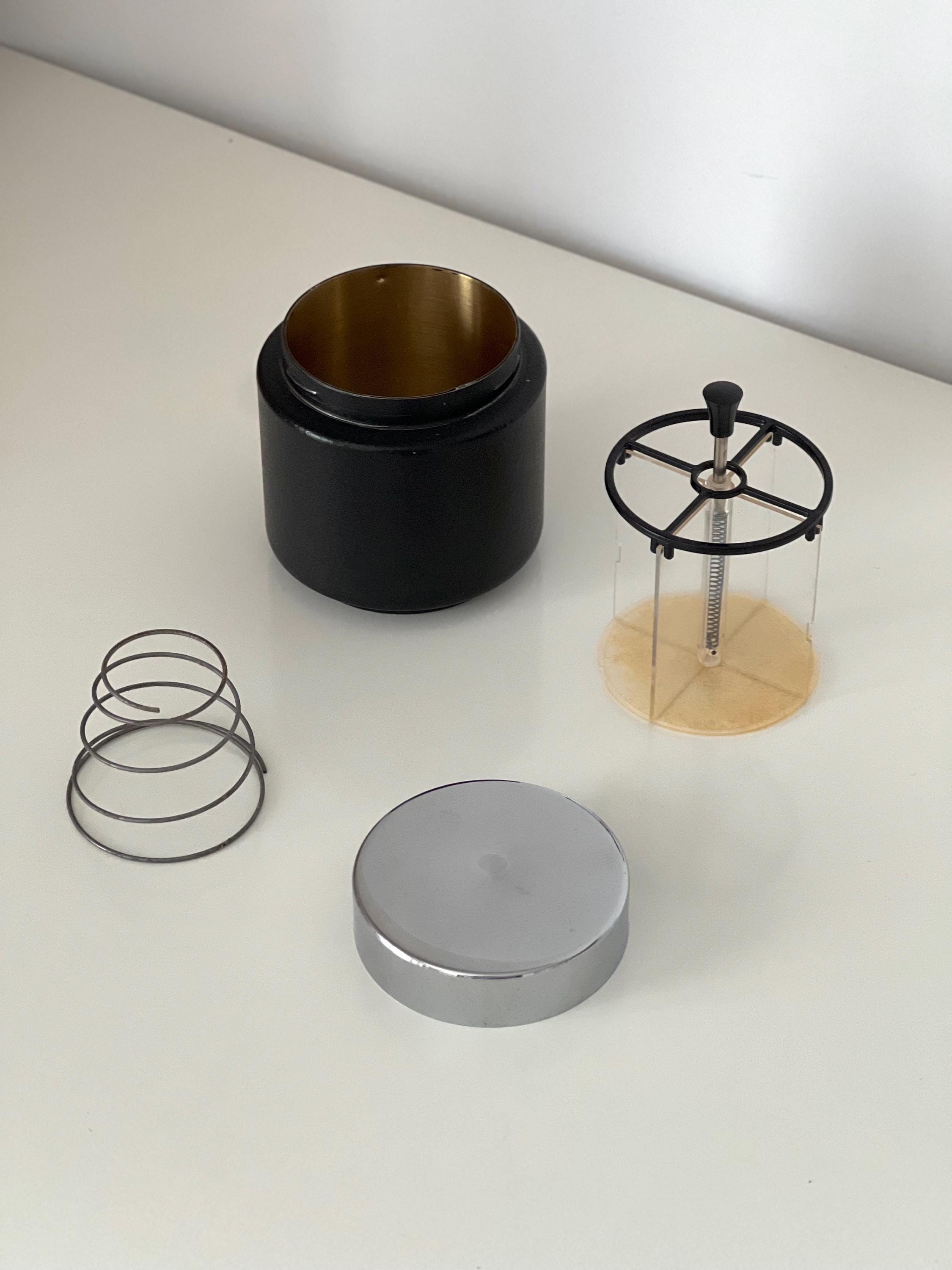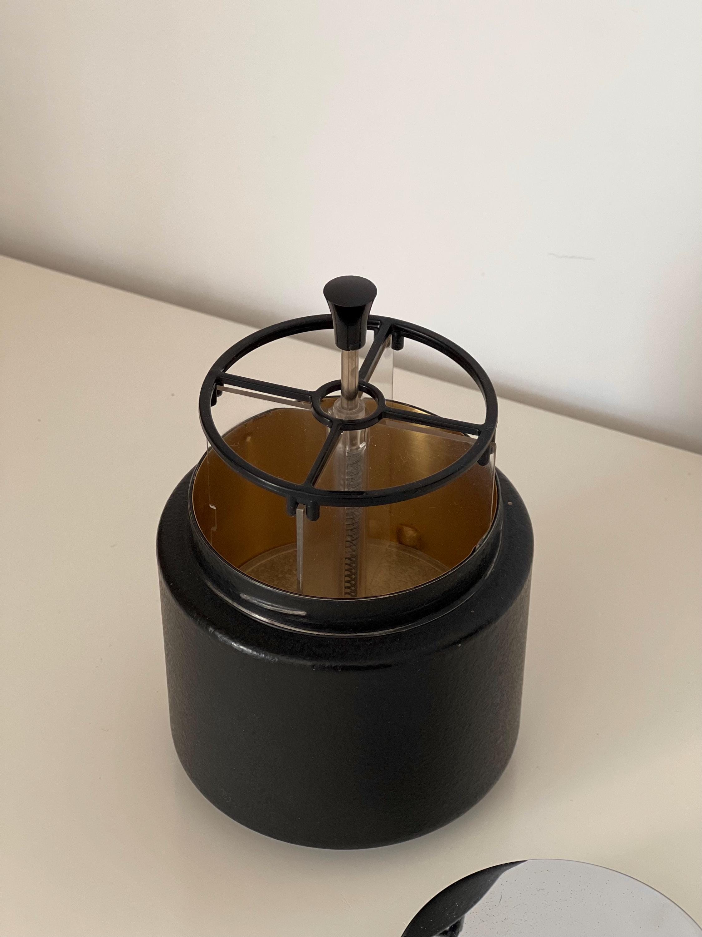 Vintage mid century cigarette dispenser dating to the 1950s–1960s. Featuring a black textured metal base, chrome lid with velvet insert, and smoked acrylic cylinder, this automatic cigarette box is both functional and sculptural.