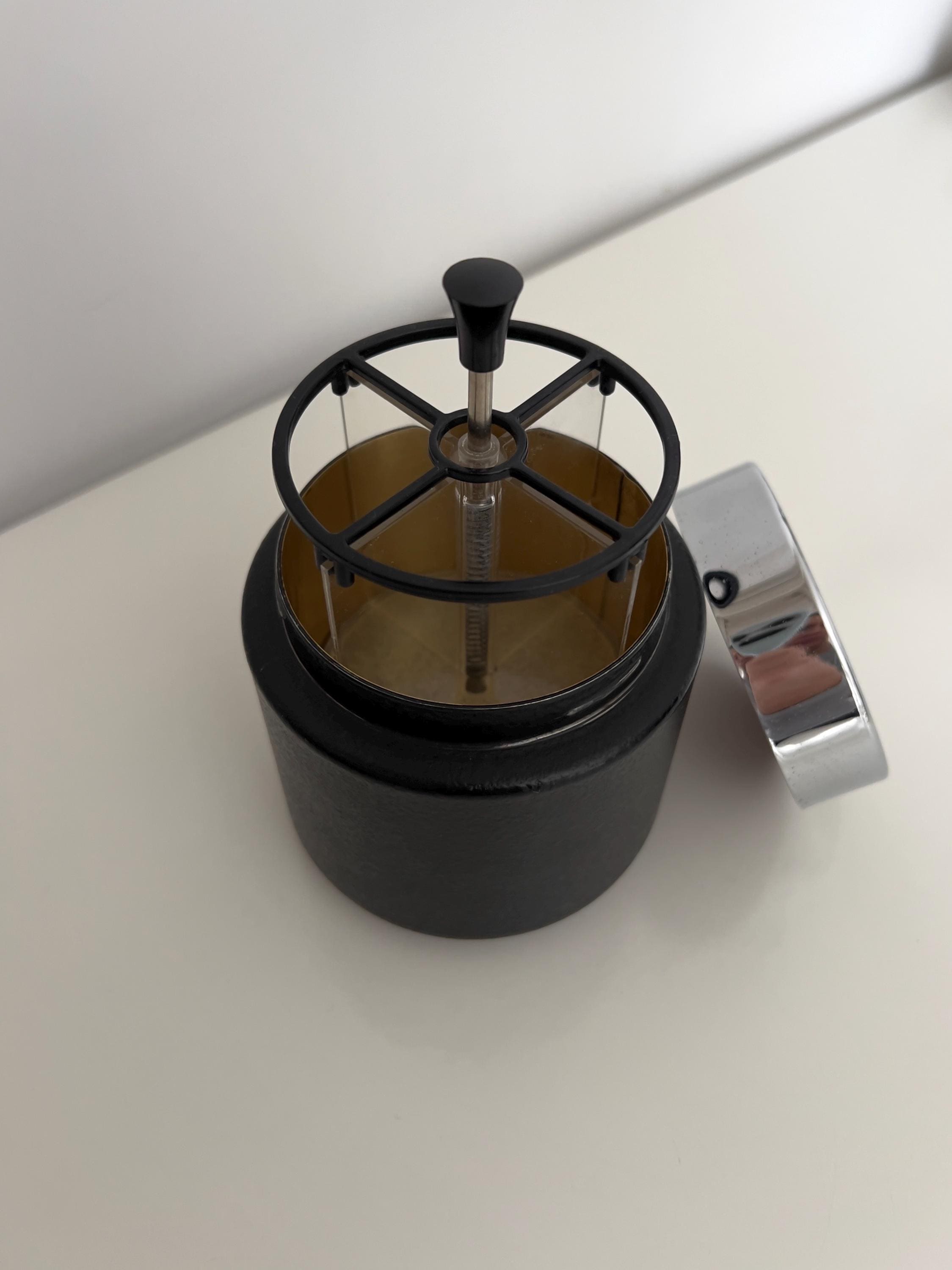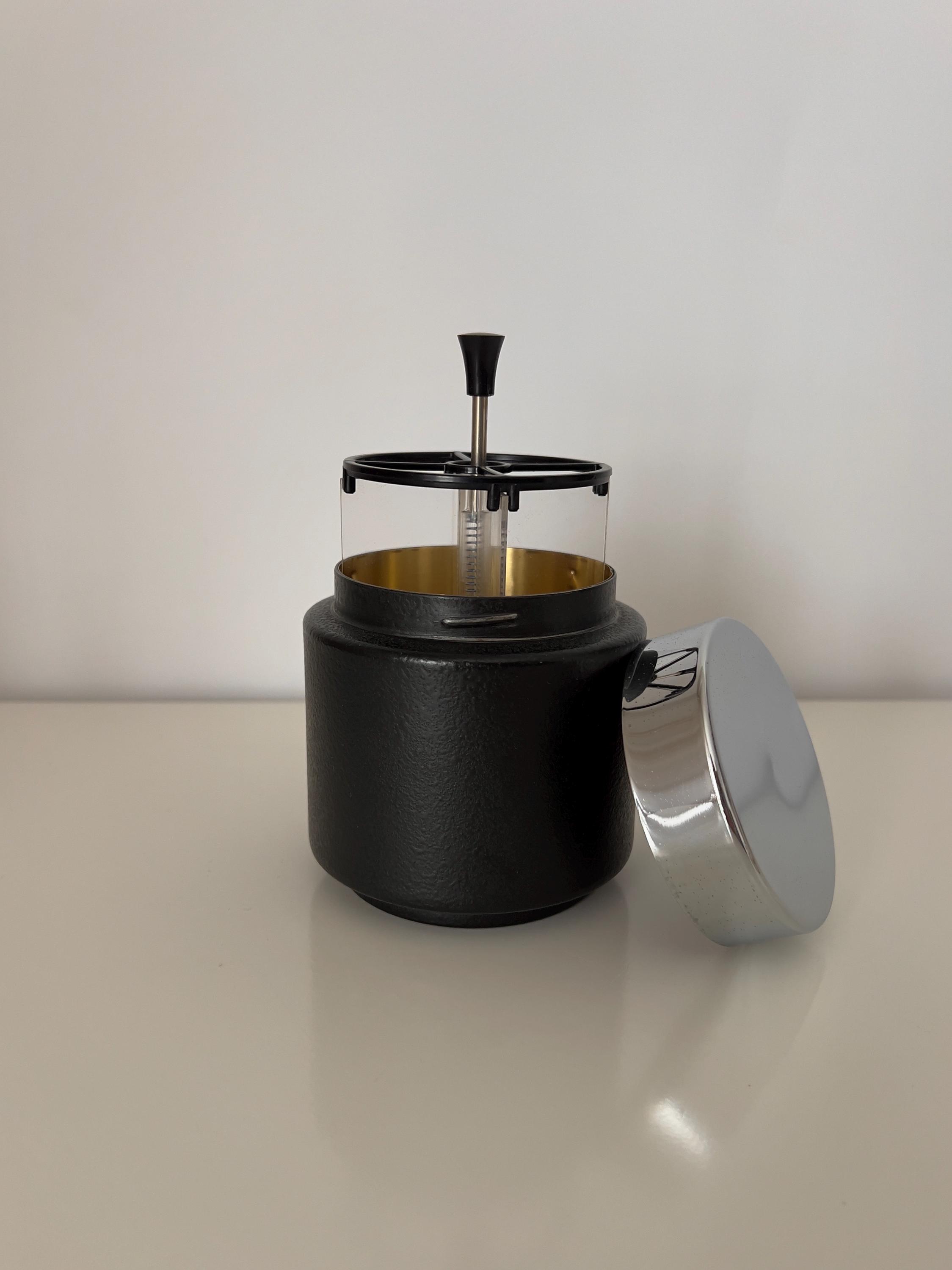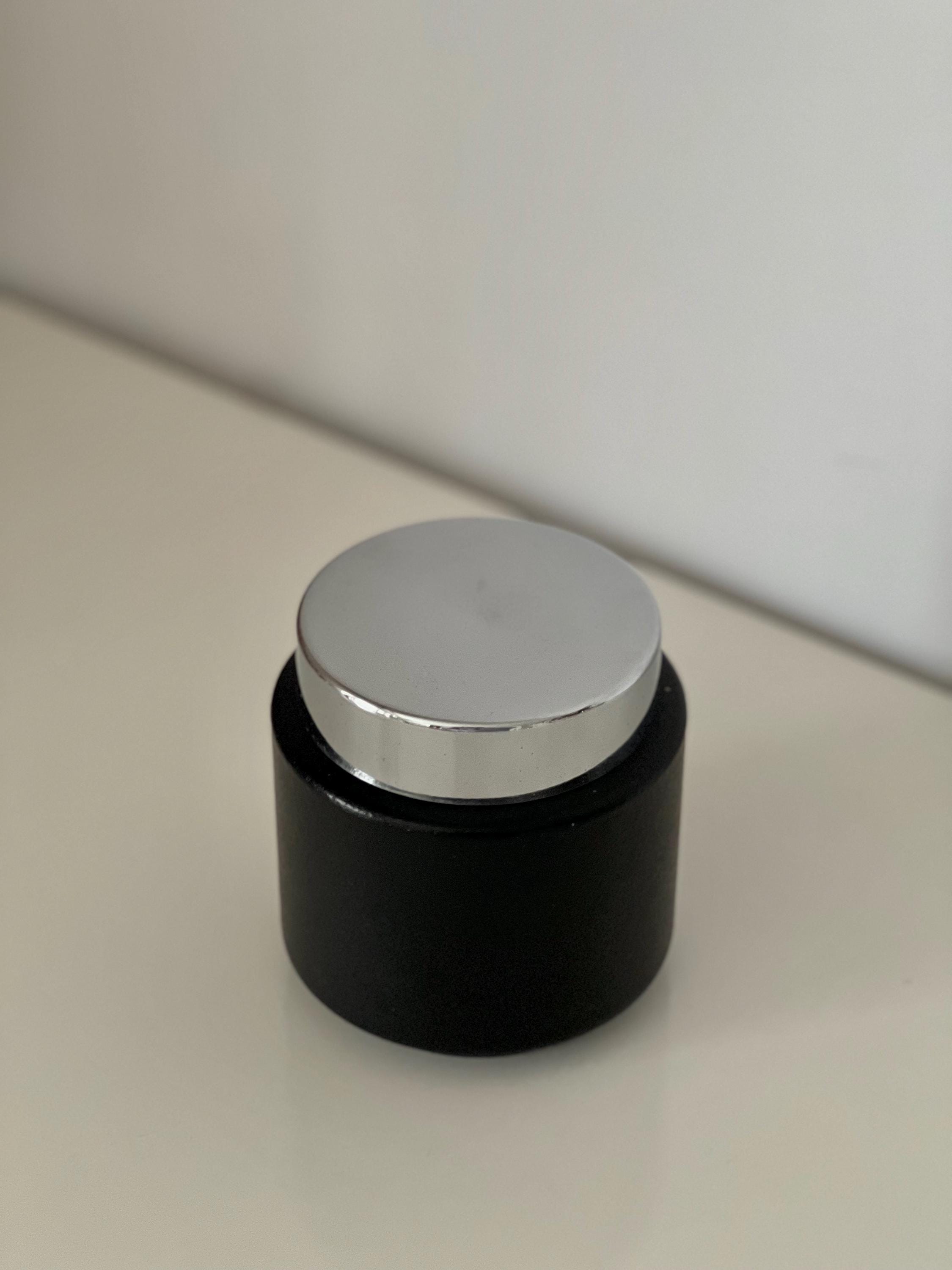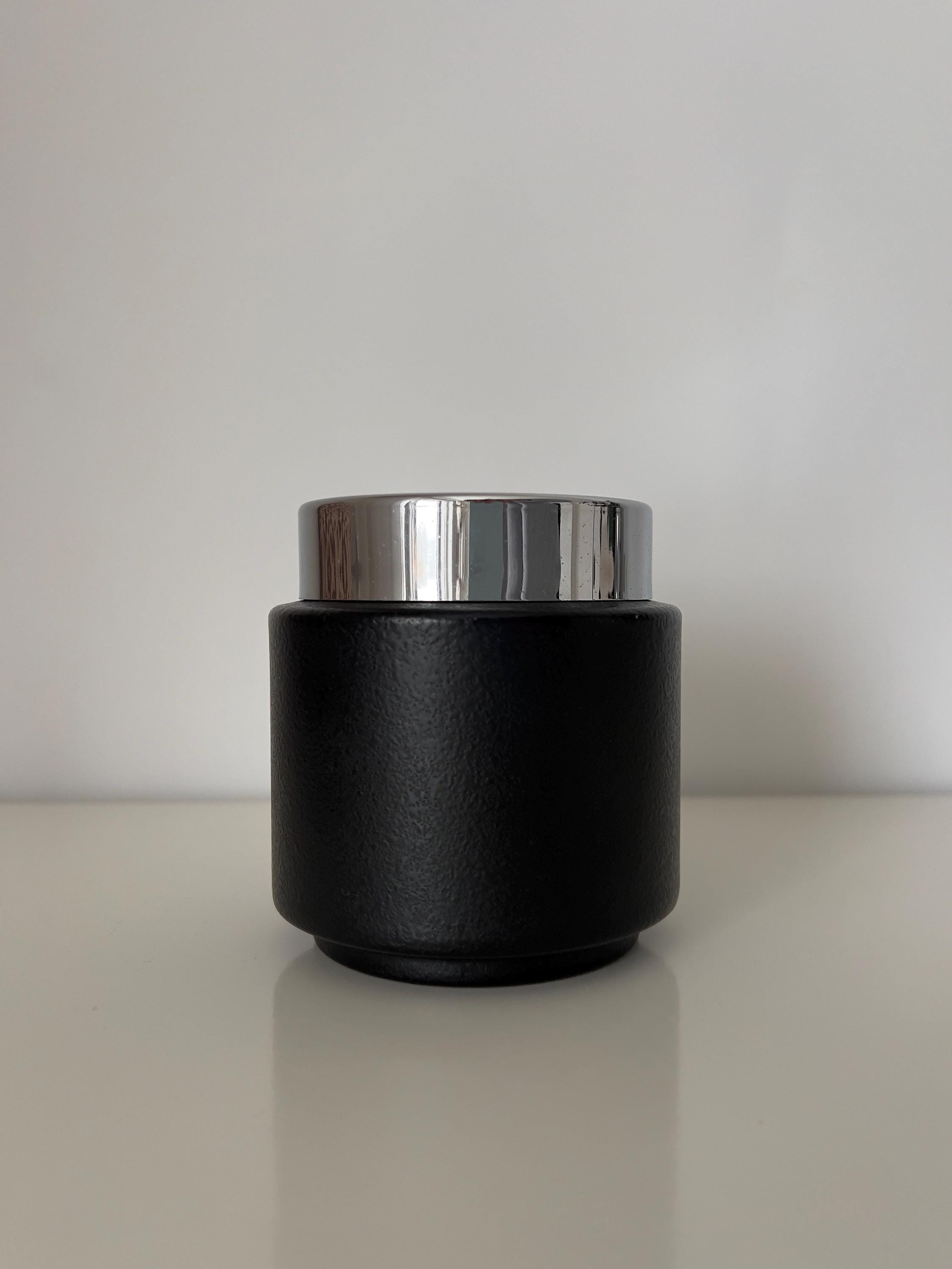 Vintage mid century cigarette dispenser dating to the 1950s–1960s. Featuring a black textured metal base, chrome lid with velvet insert, and smoked acrylic cylinder, this automatic cigarette box is both functional and sculptural.