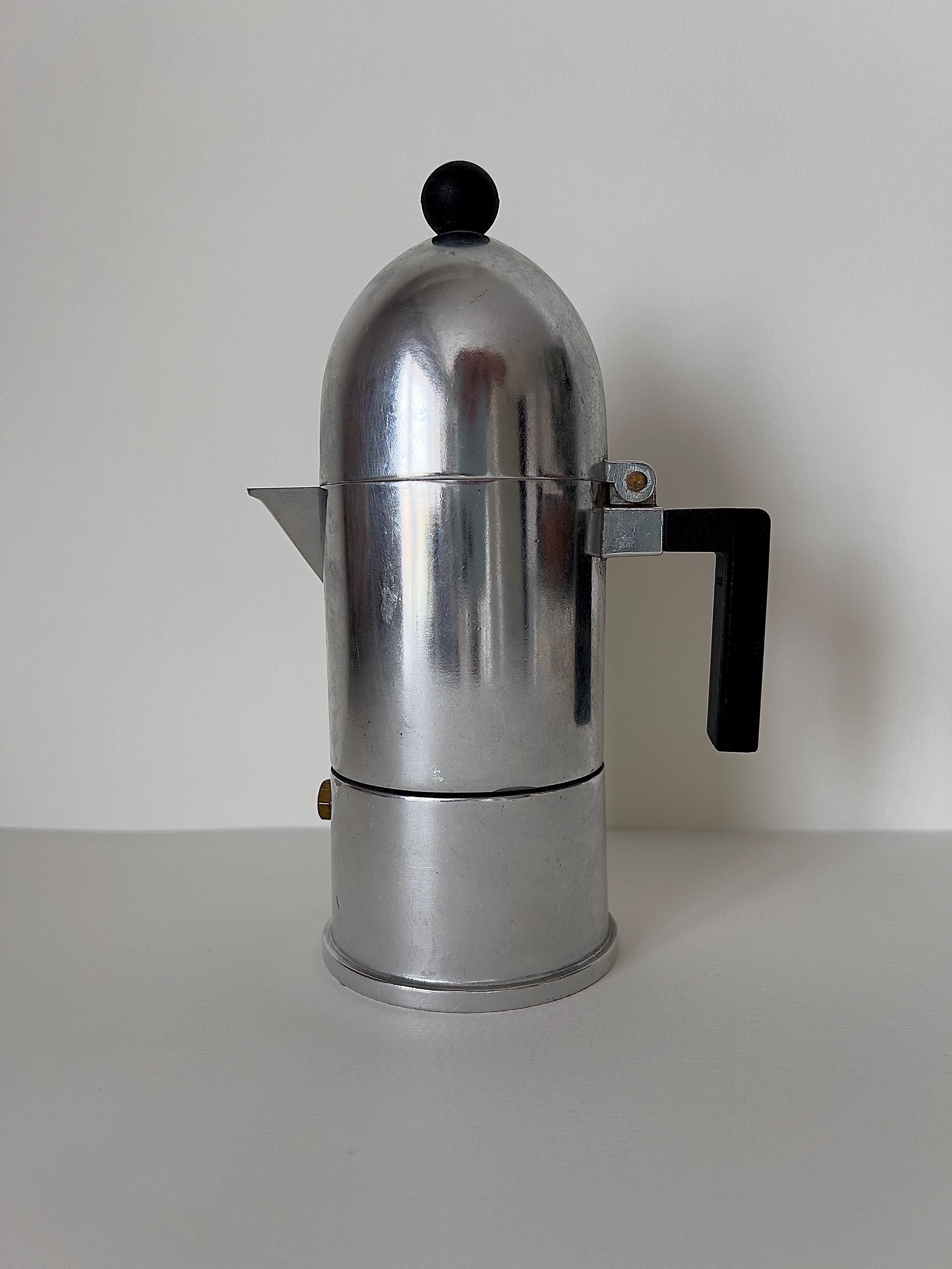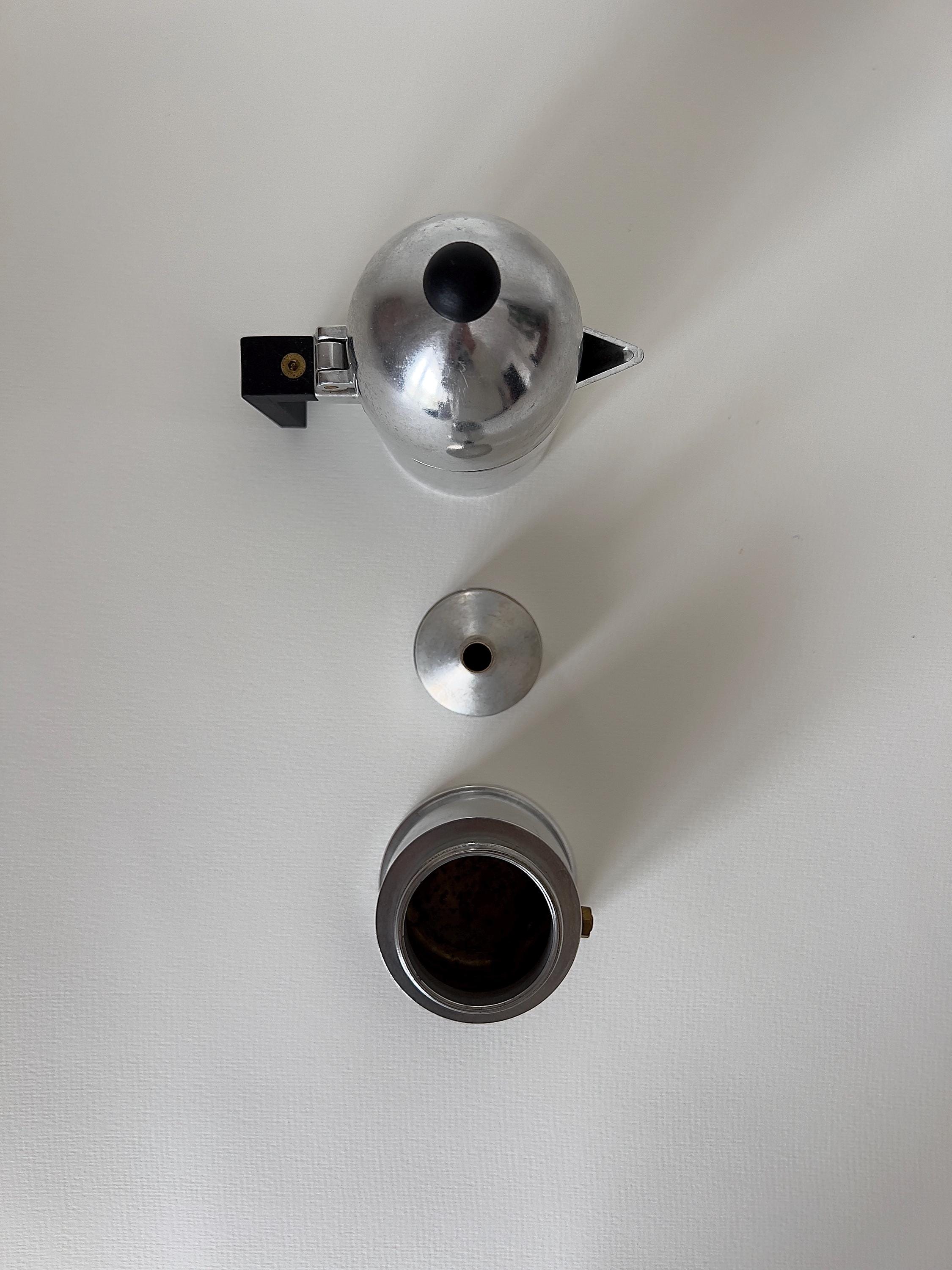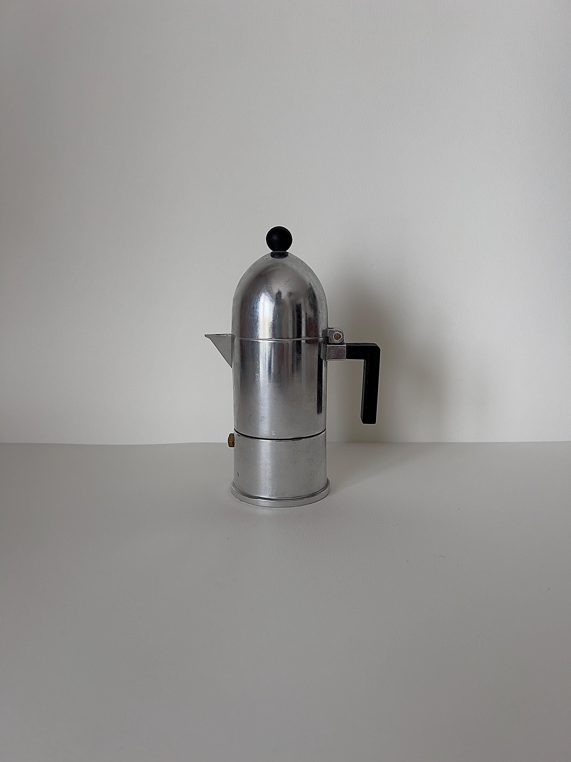 This sculptural aluminum stovetop percolator embodies postmodern architecture in miniature form, with its domed silhouette and striking geometric handle. A true collector’s piece, blending function and art.