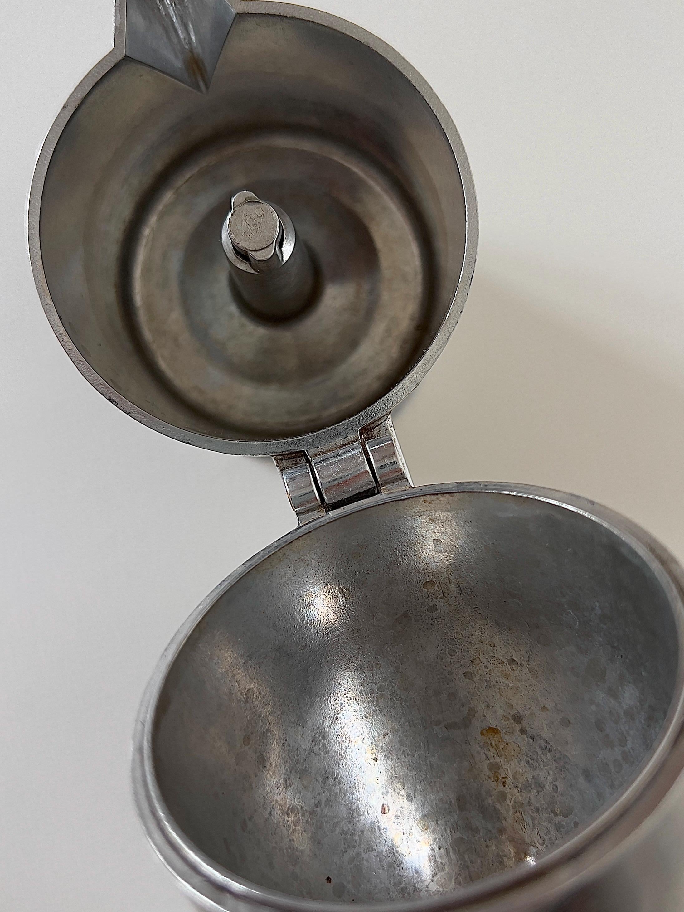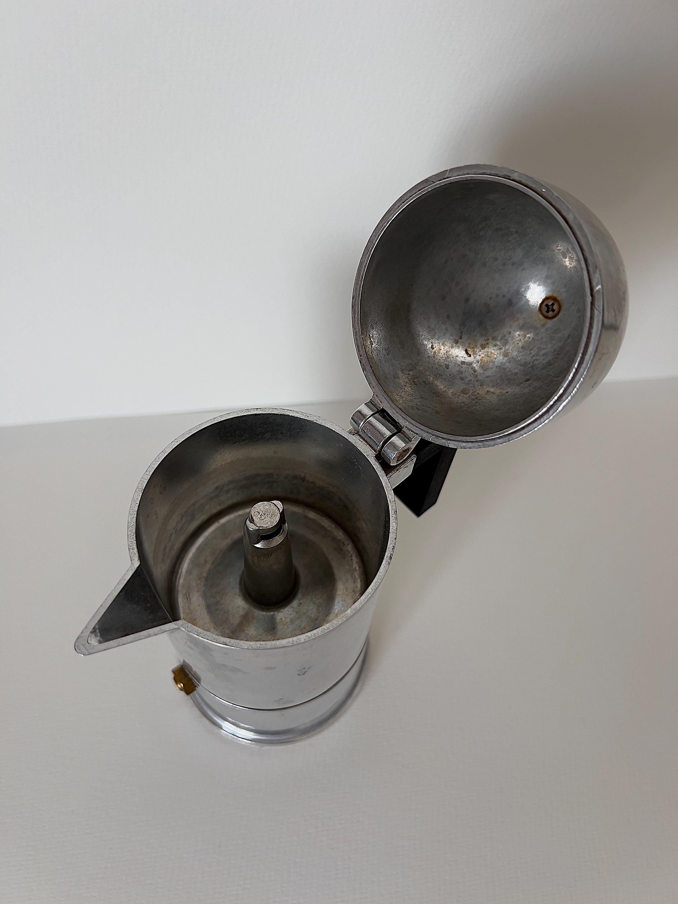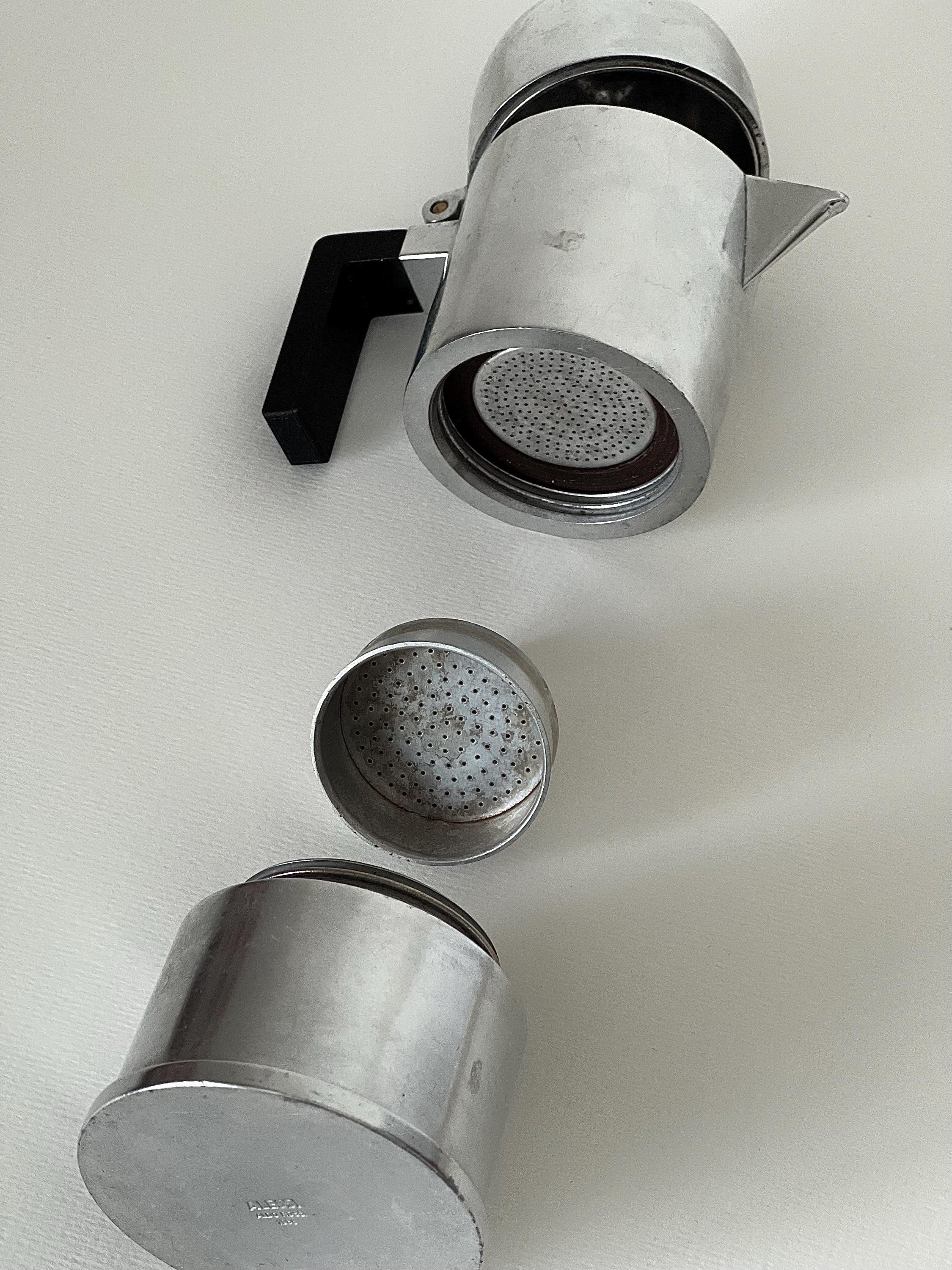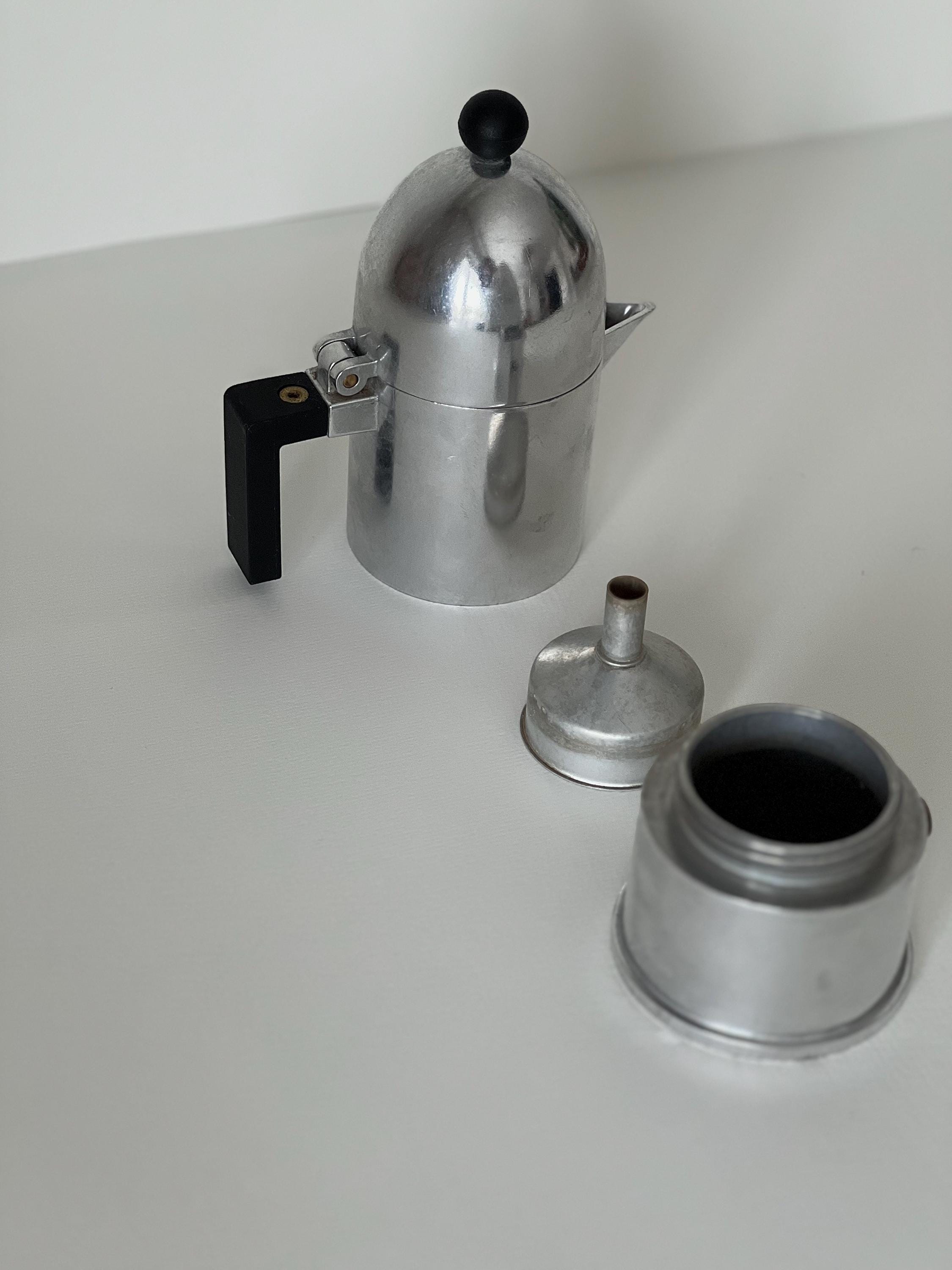 This sculptural aluminum stovetop percolator embodies postmodern architecture in miniature form, with its domed silhouette and striking geometric handle. A true collector’s piece, blending function and art.