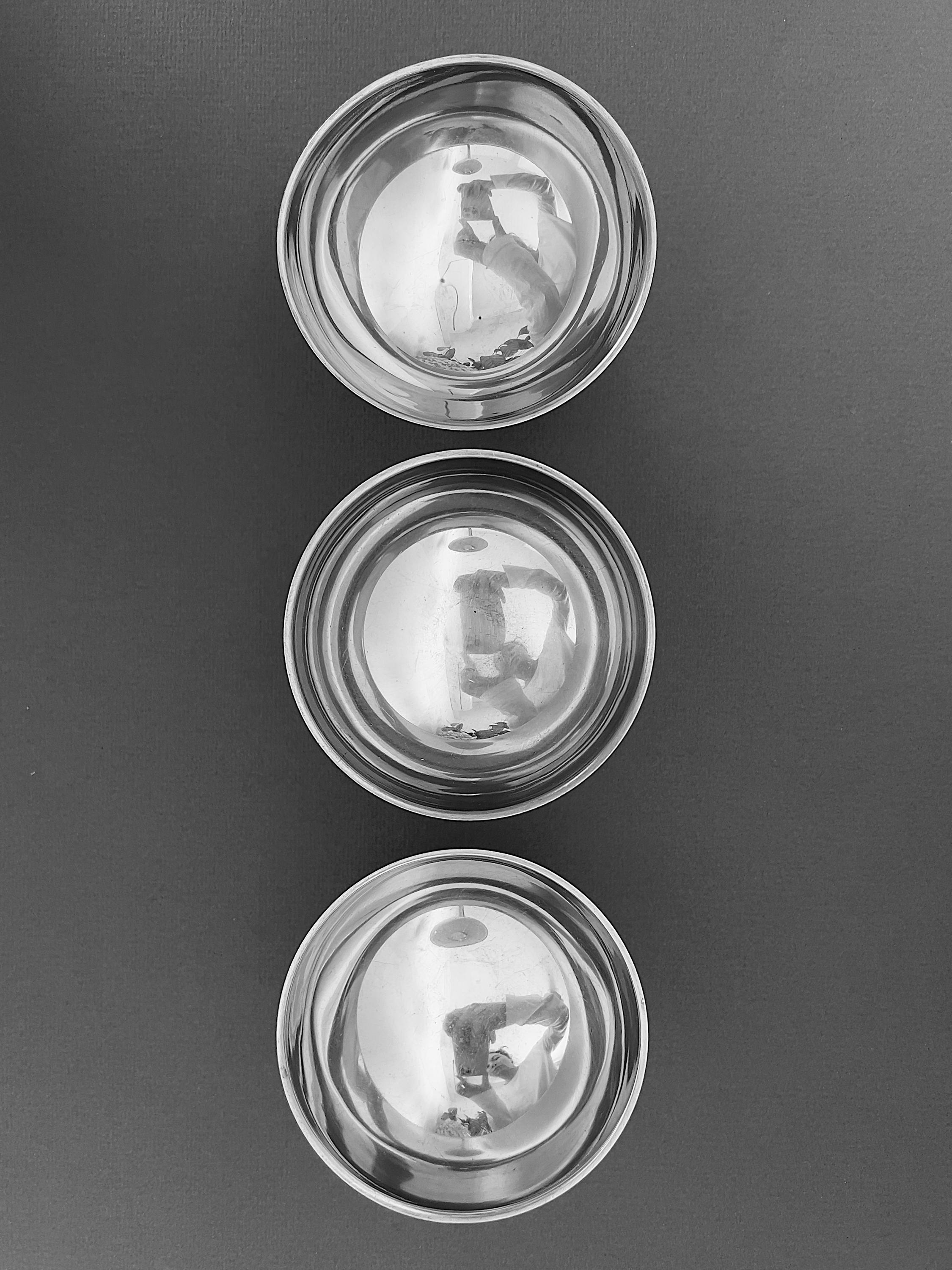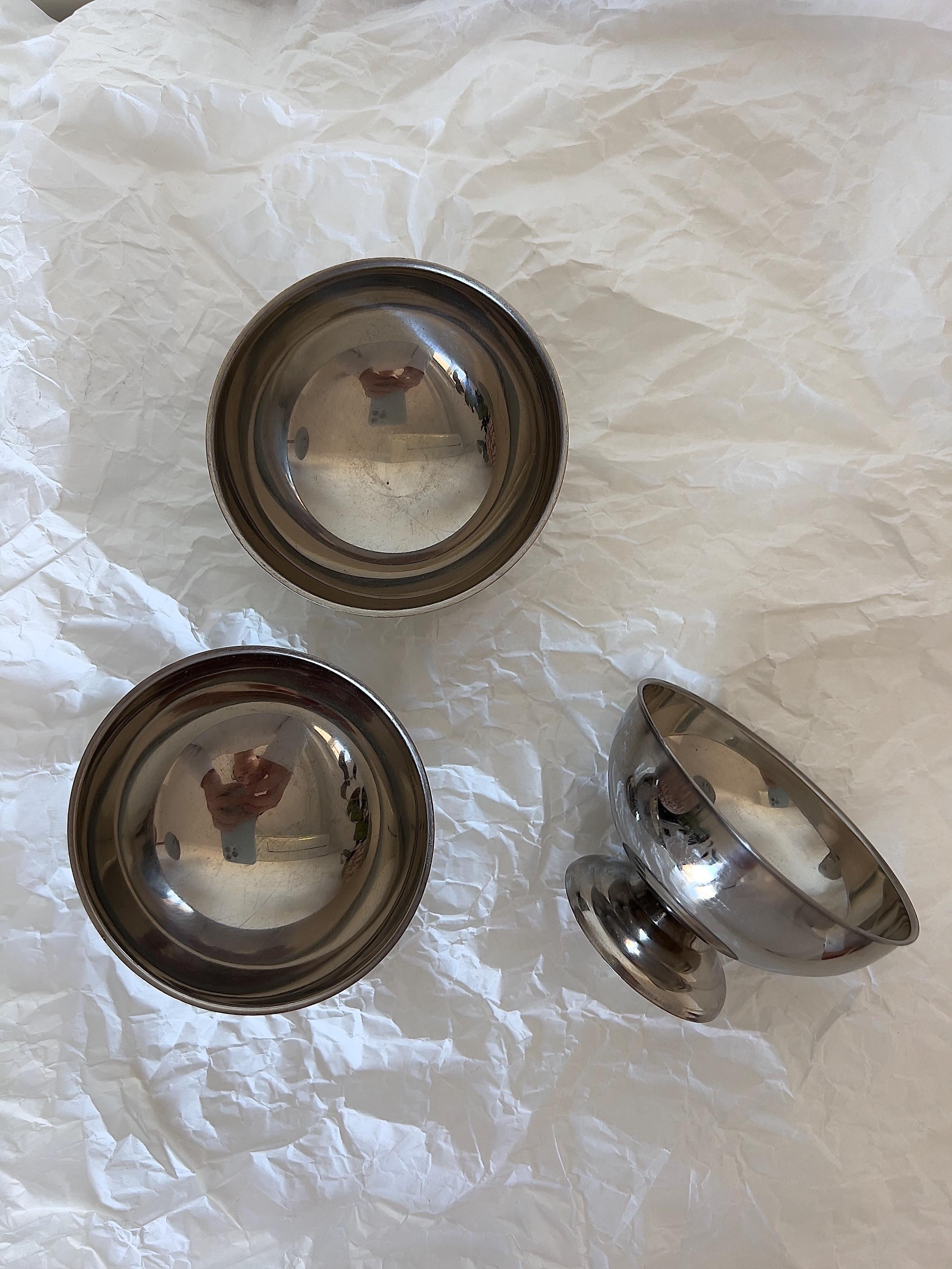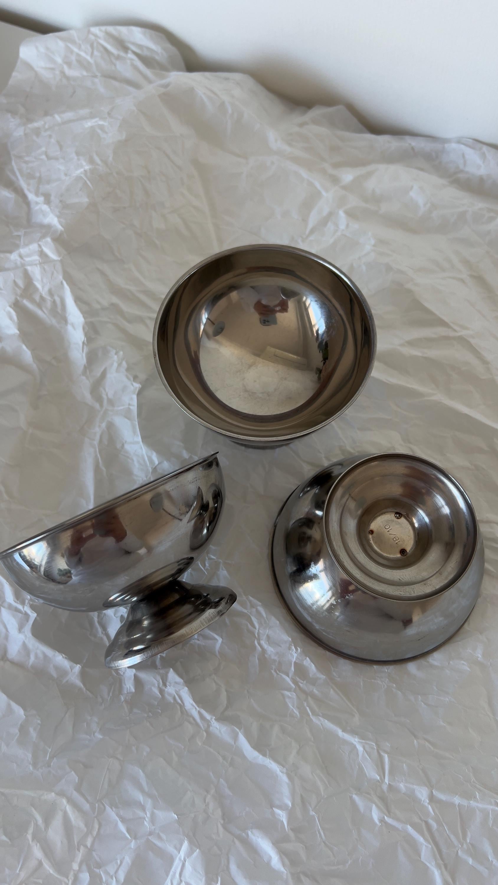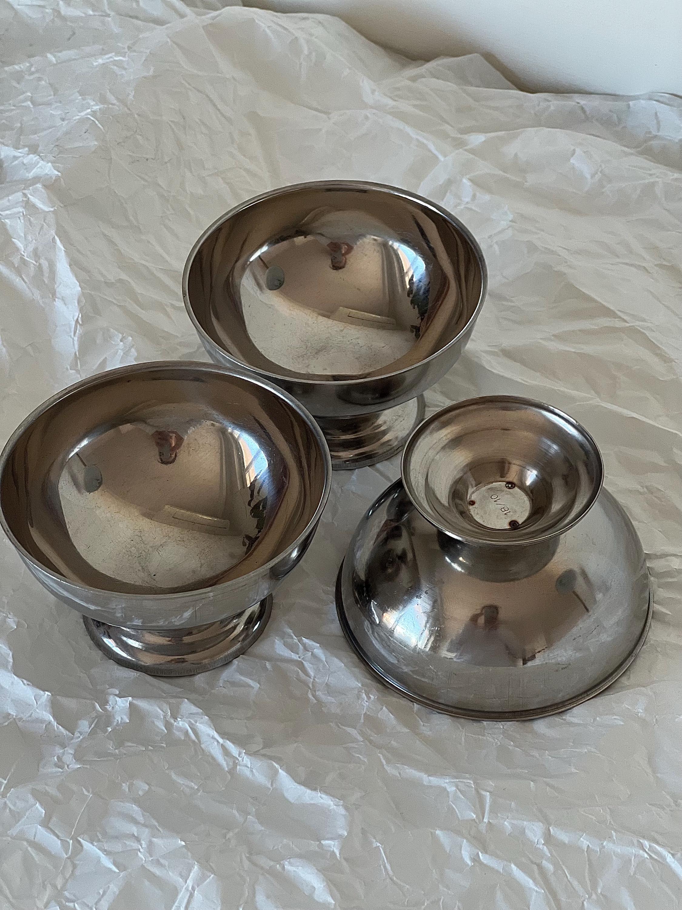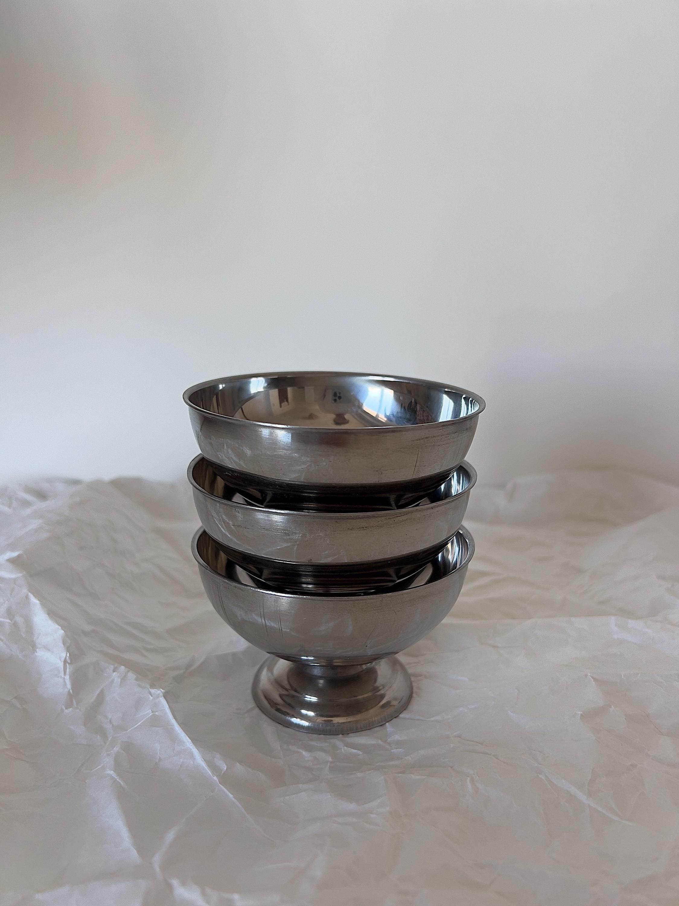 A set of three vintage stainless steel dessert cups from the 1980s, stamped INOX. These classic pedestal bowls have a clean, timeless design with a soft brushed exterior and polished interior.
