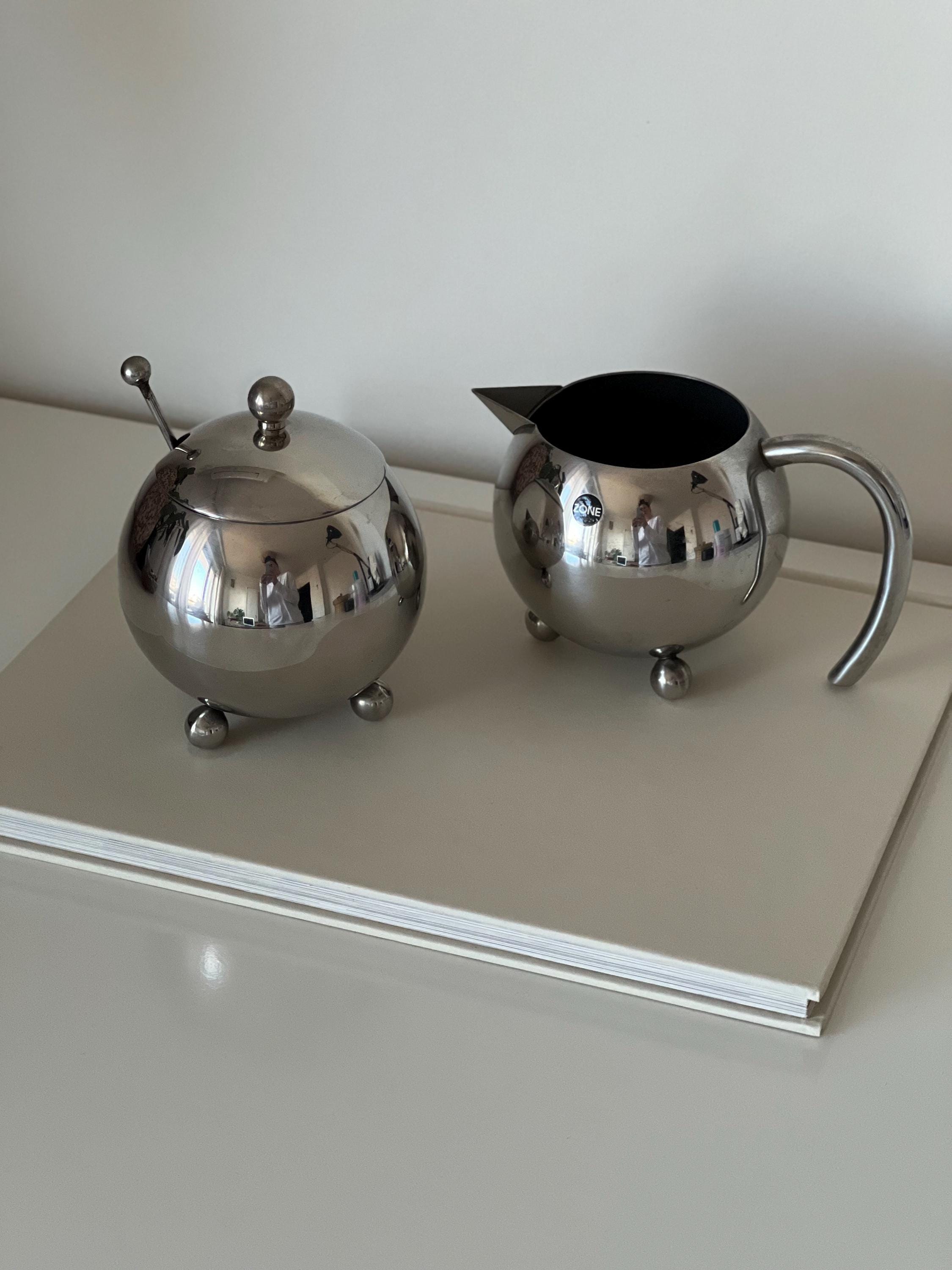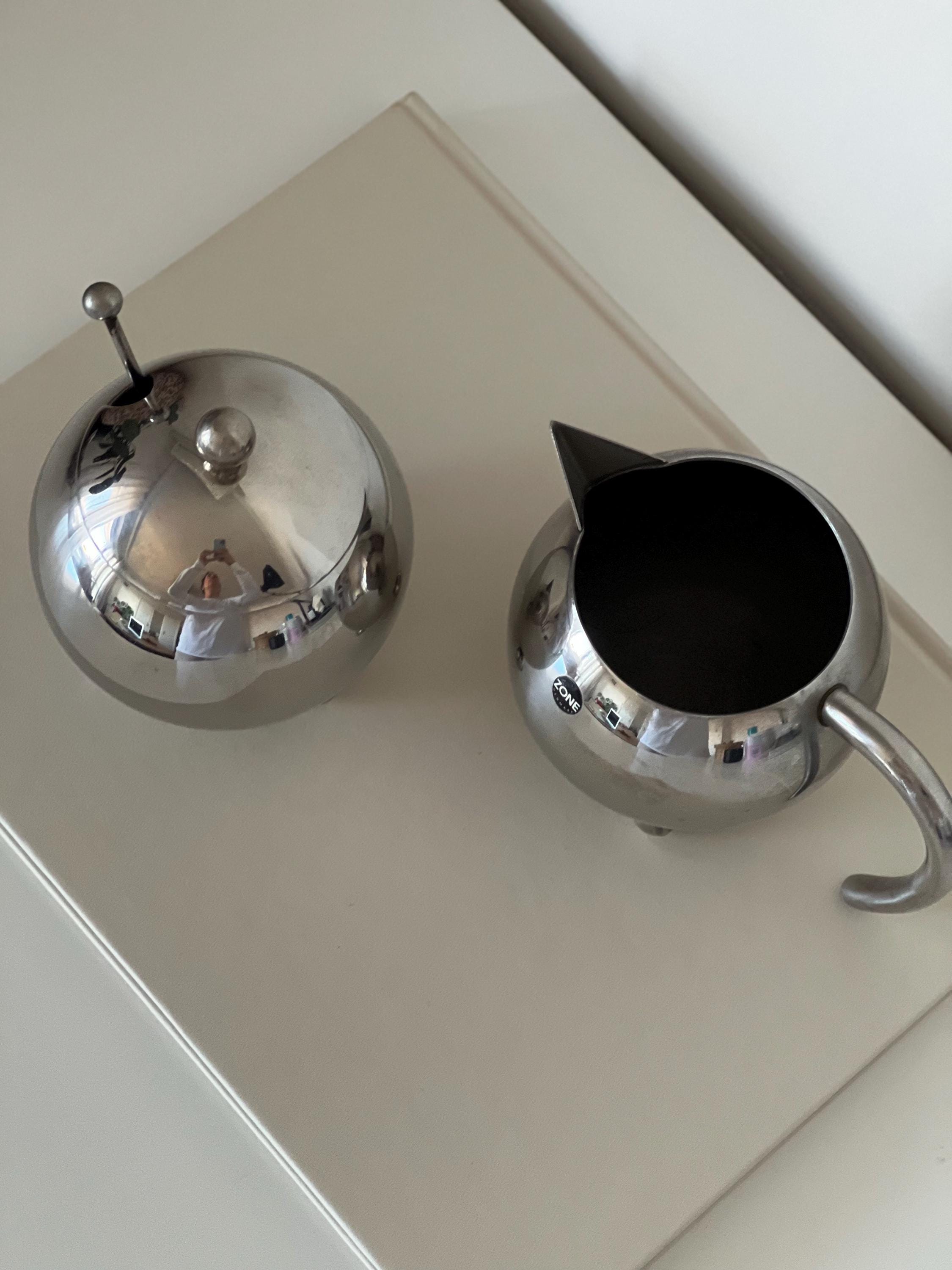 Vintage ZONE Denmark creamer and sugar bowl set in stainless steel, minimalist Scandinavian coffee service with sculptural rounded form, perfect for modern coffee bar decor.
