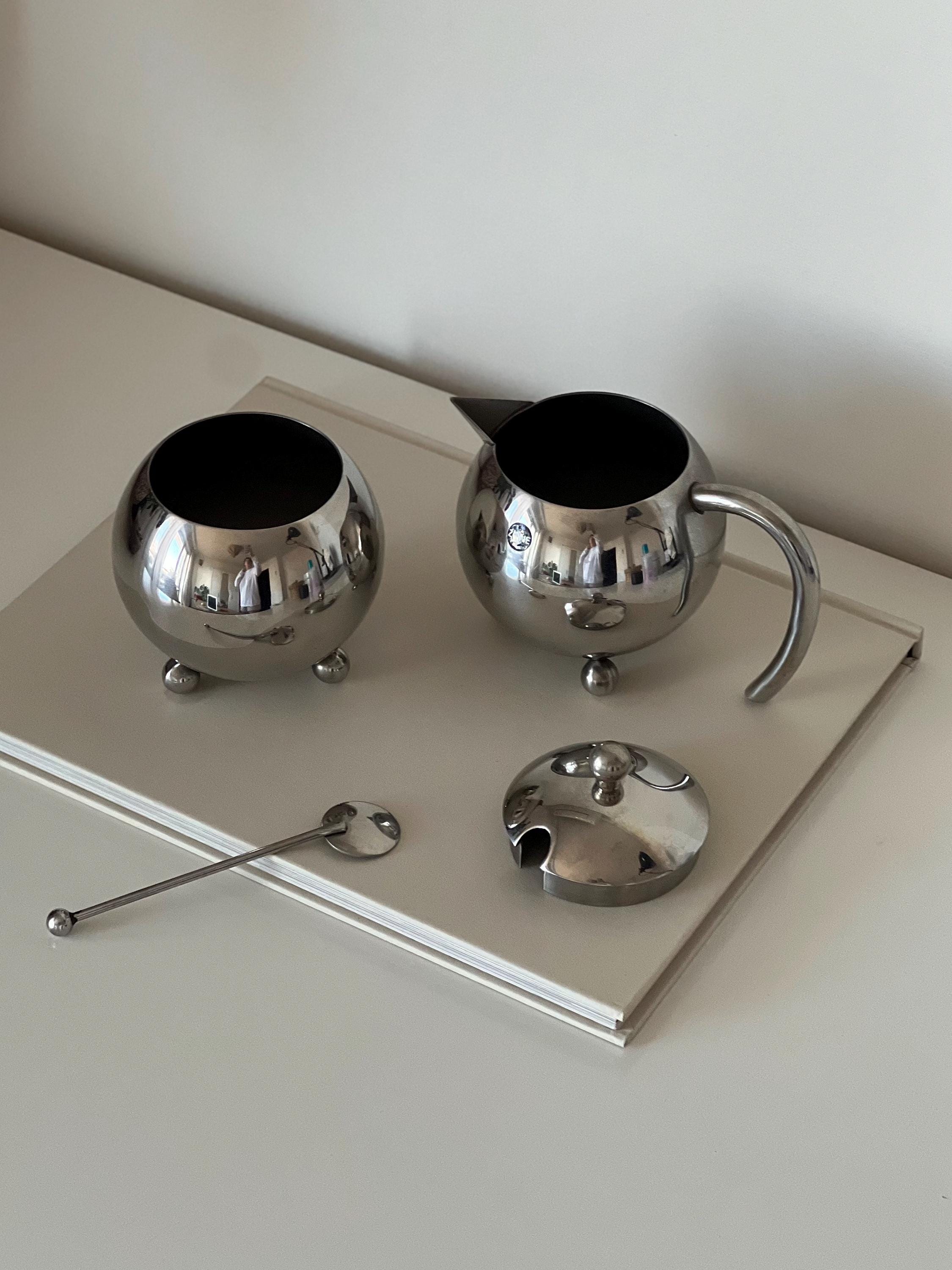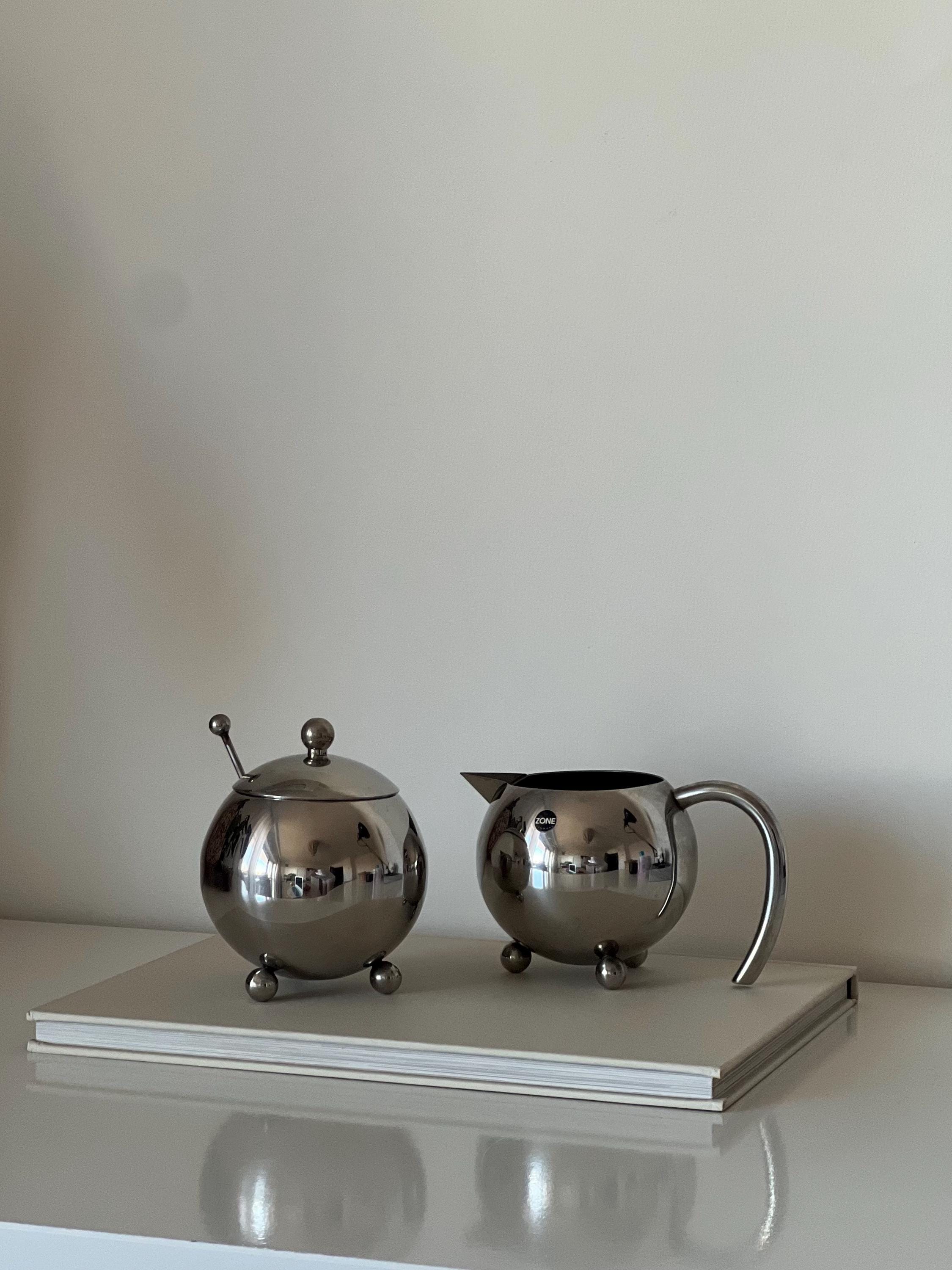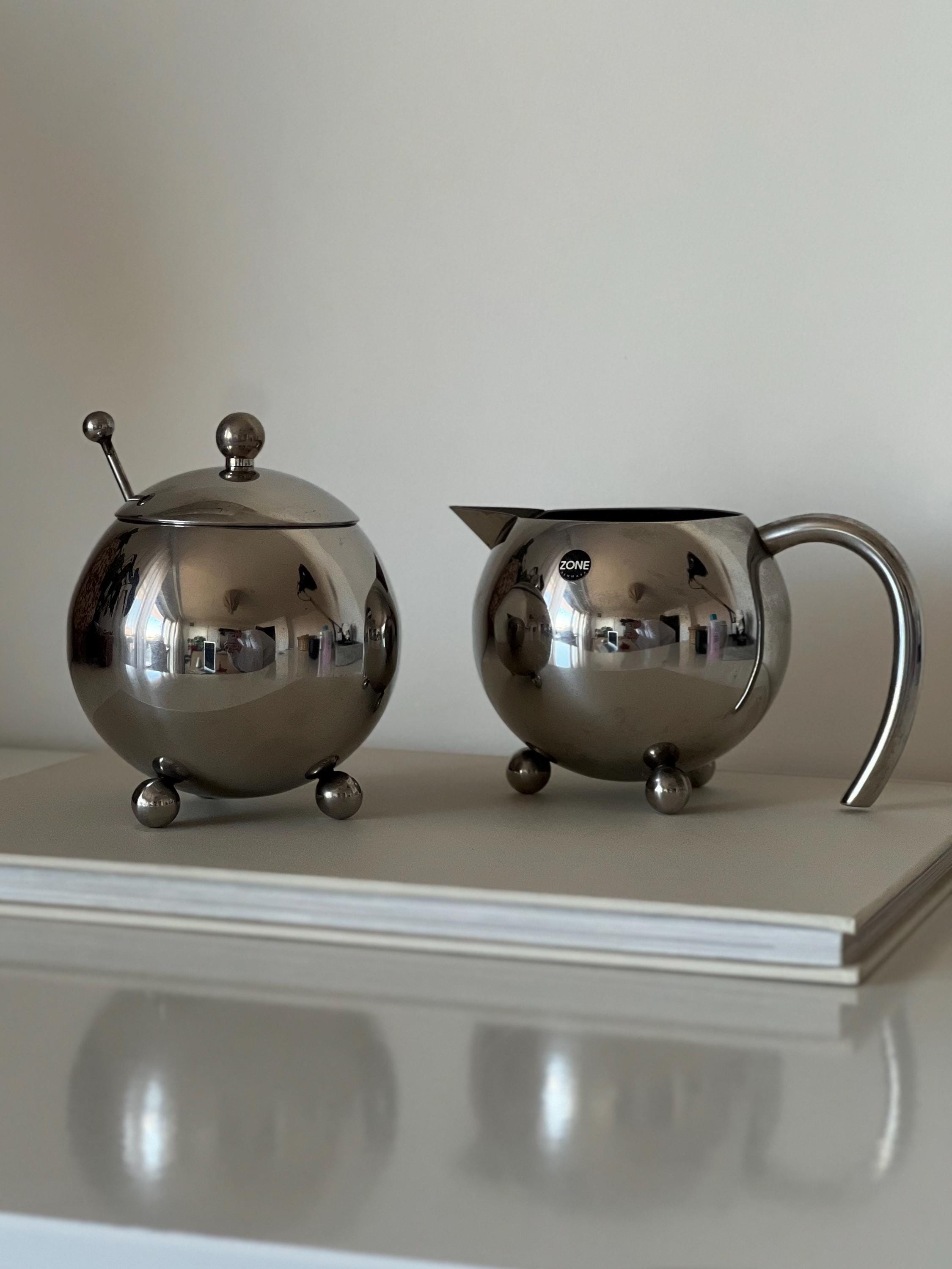 A softly sculptural vintage set by ZONE Denmark, composed of a creamer and lidded sugar bowl with matching spoon. The rounded, almost spherical forms rest gently on small ball feet, giving the set a quiet sense of playfulness while maintaining a clean, minimalist presence.