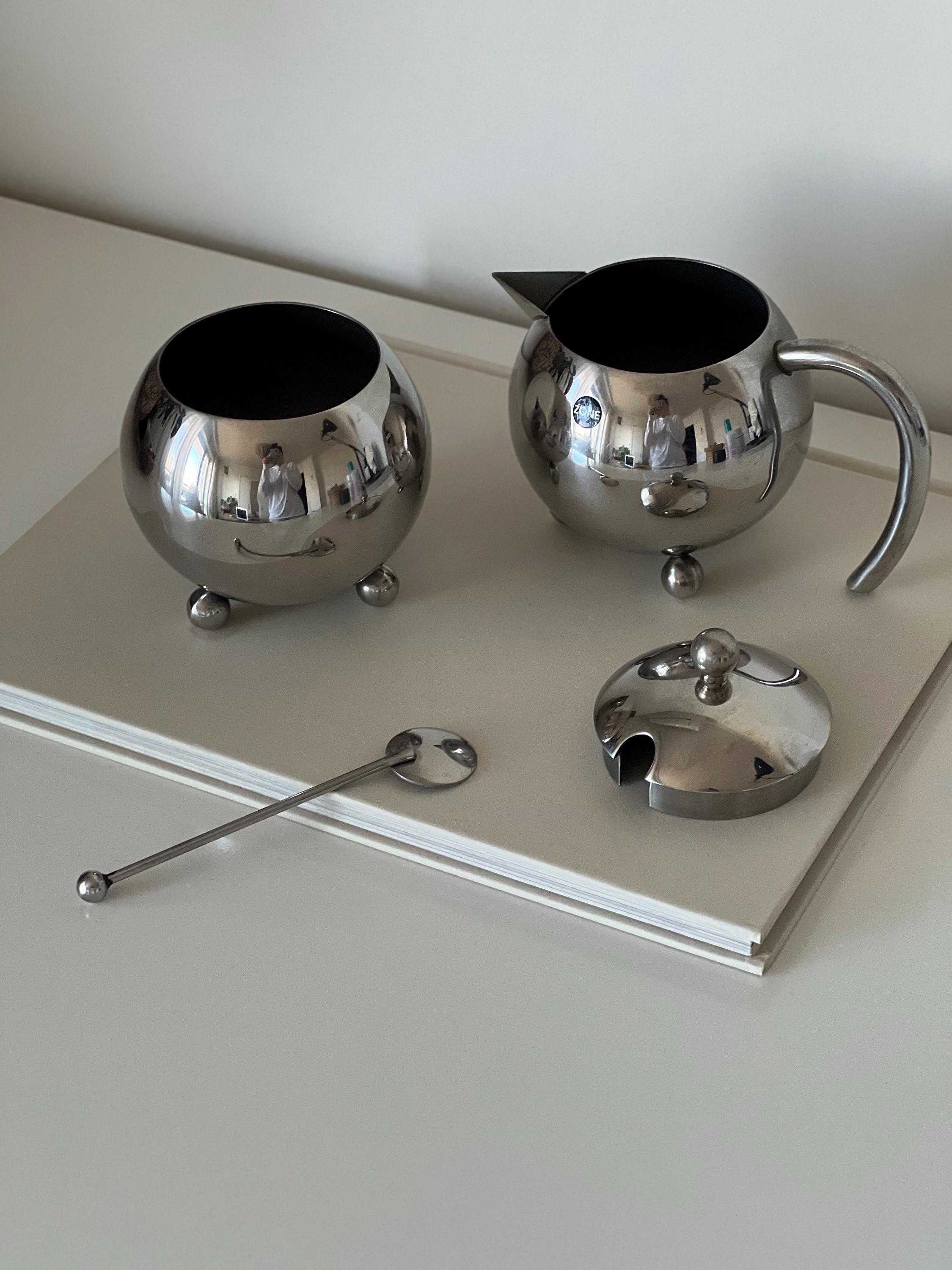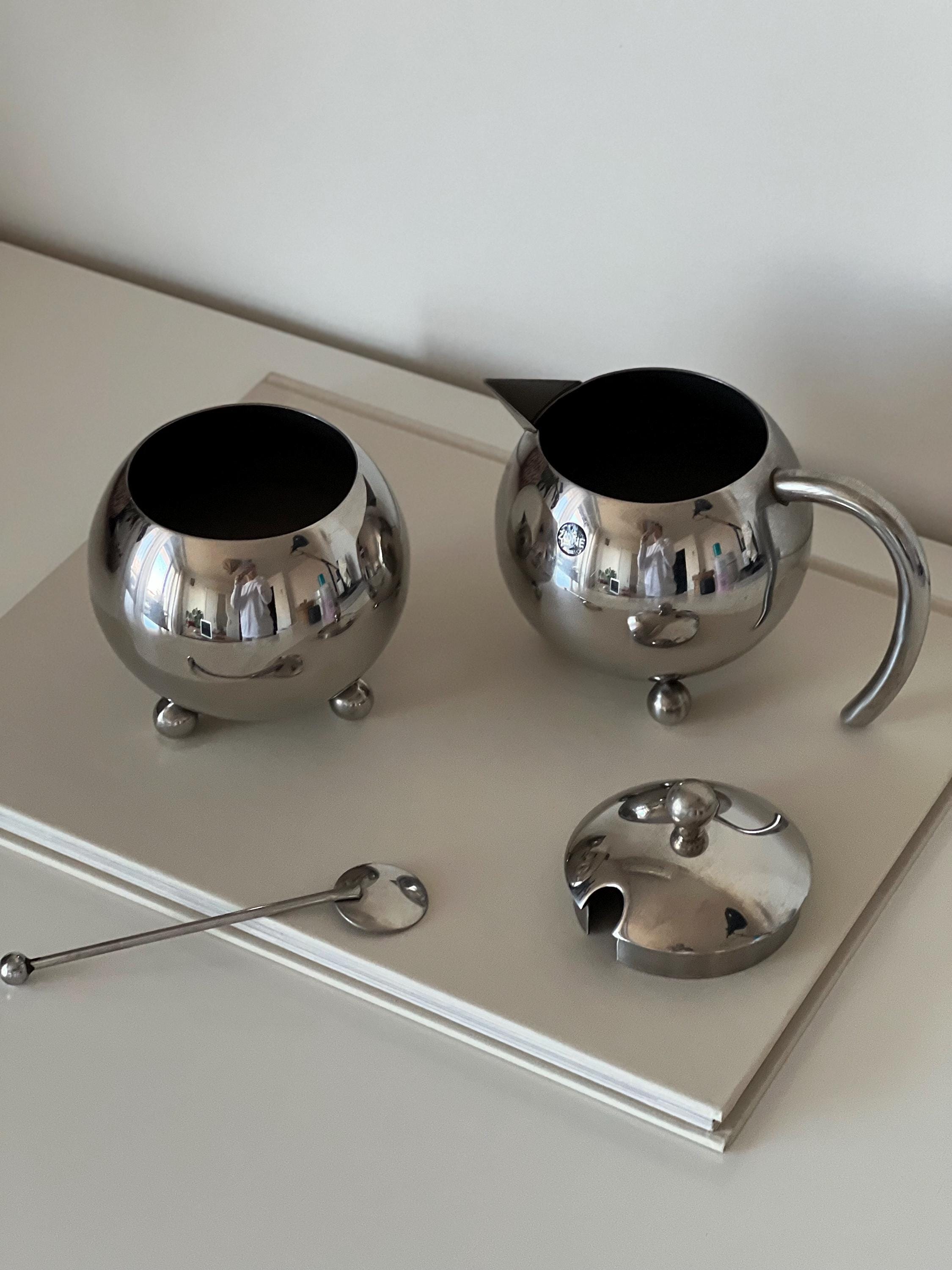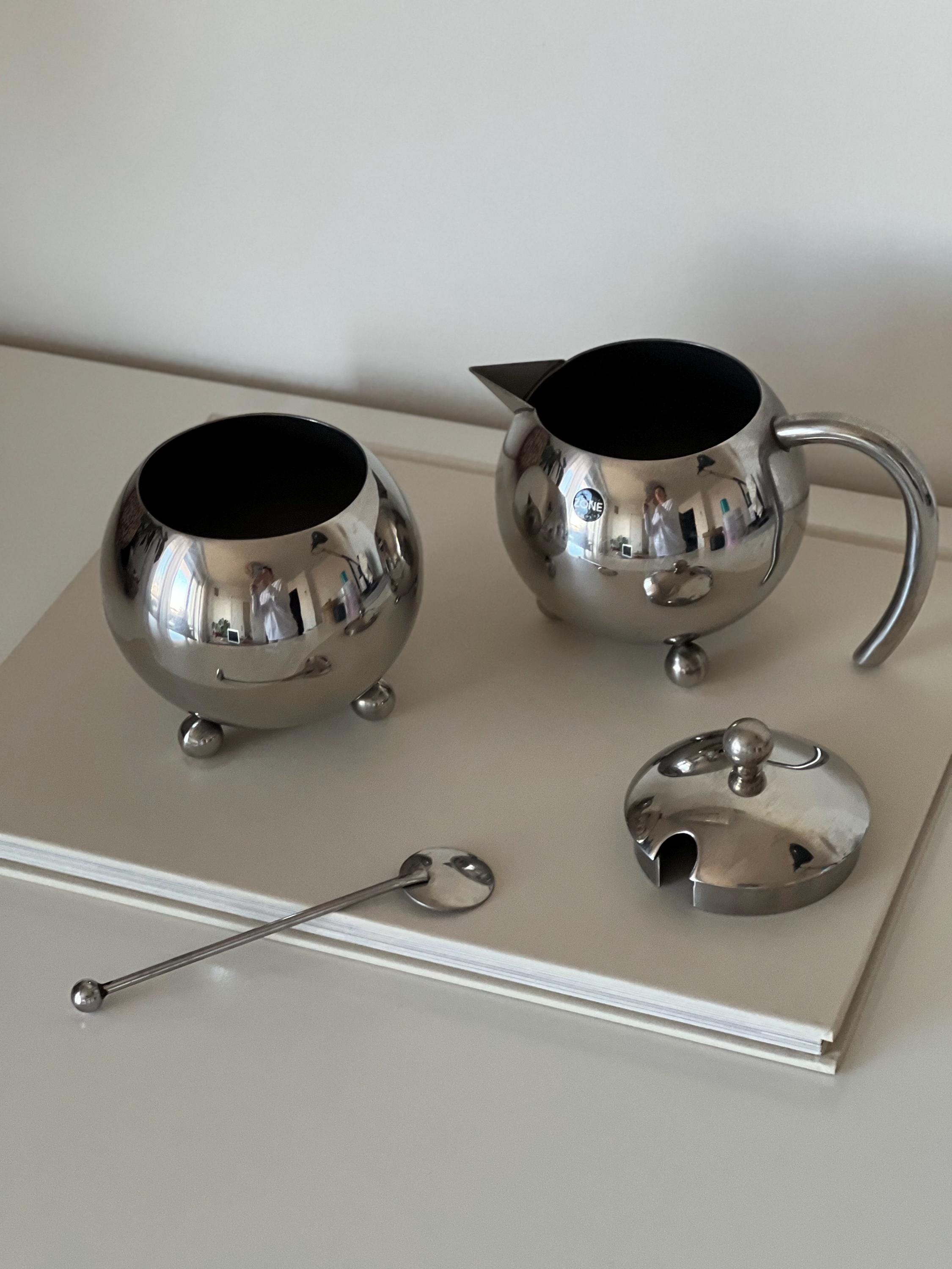 A softly sculptural vintage set by ZONE Denmark, composed of a creamer and lidded sugar bowl with matching spoon. The rounded, almost spherical forms rest gently on small ball feet, giving the set a quiet sense of playfulness while maintaining a clean, minimalist presence.
