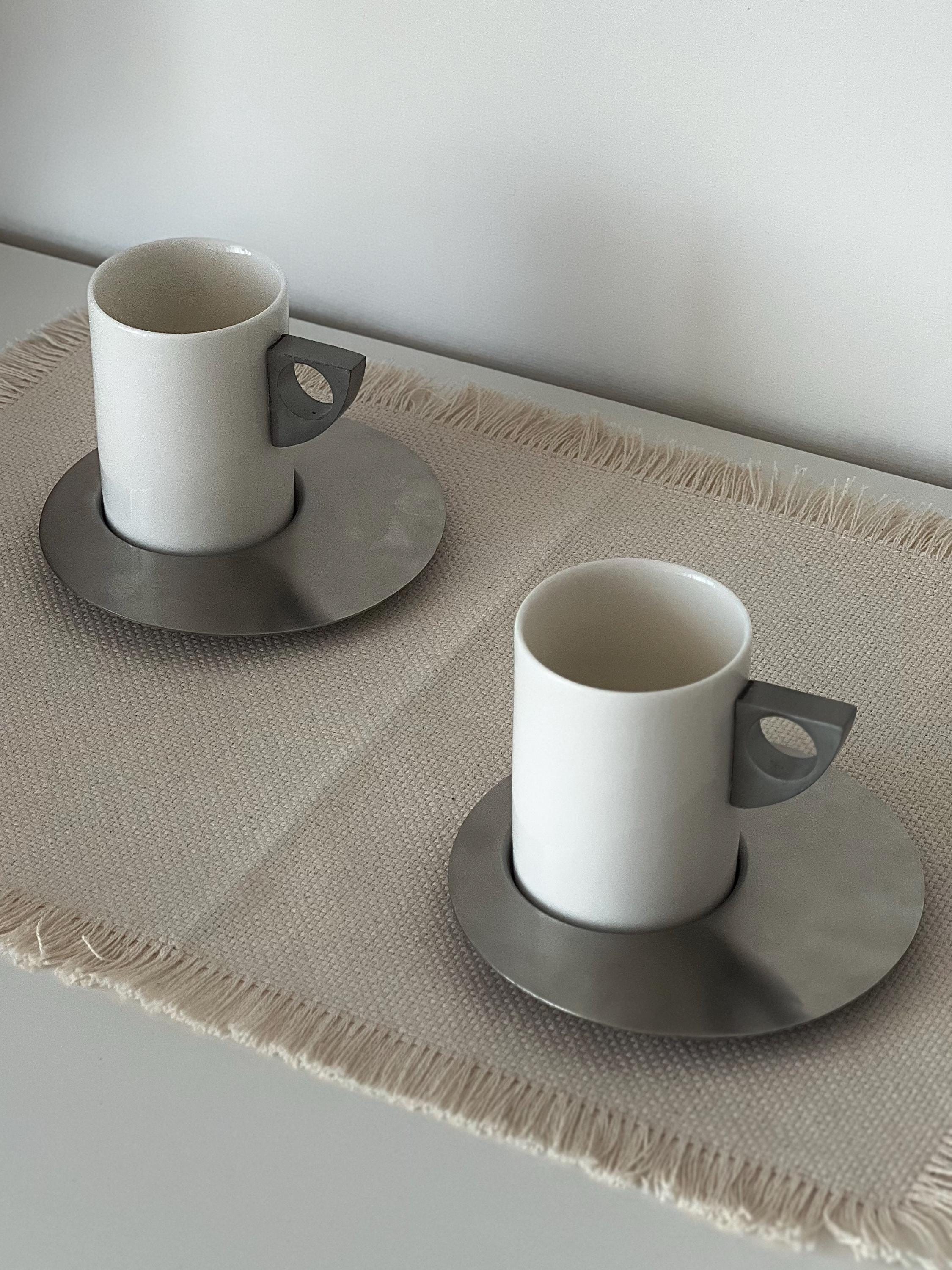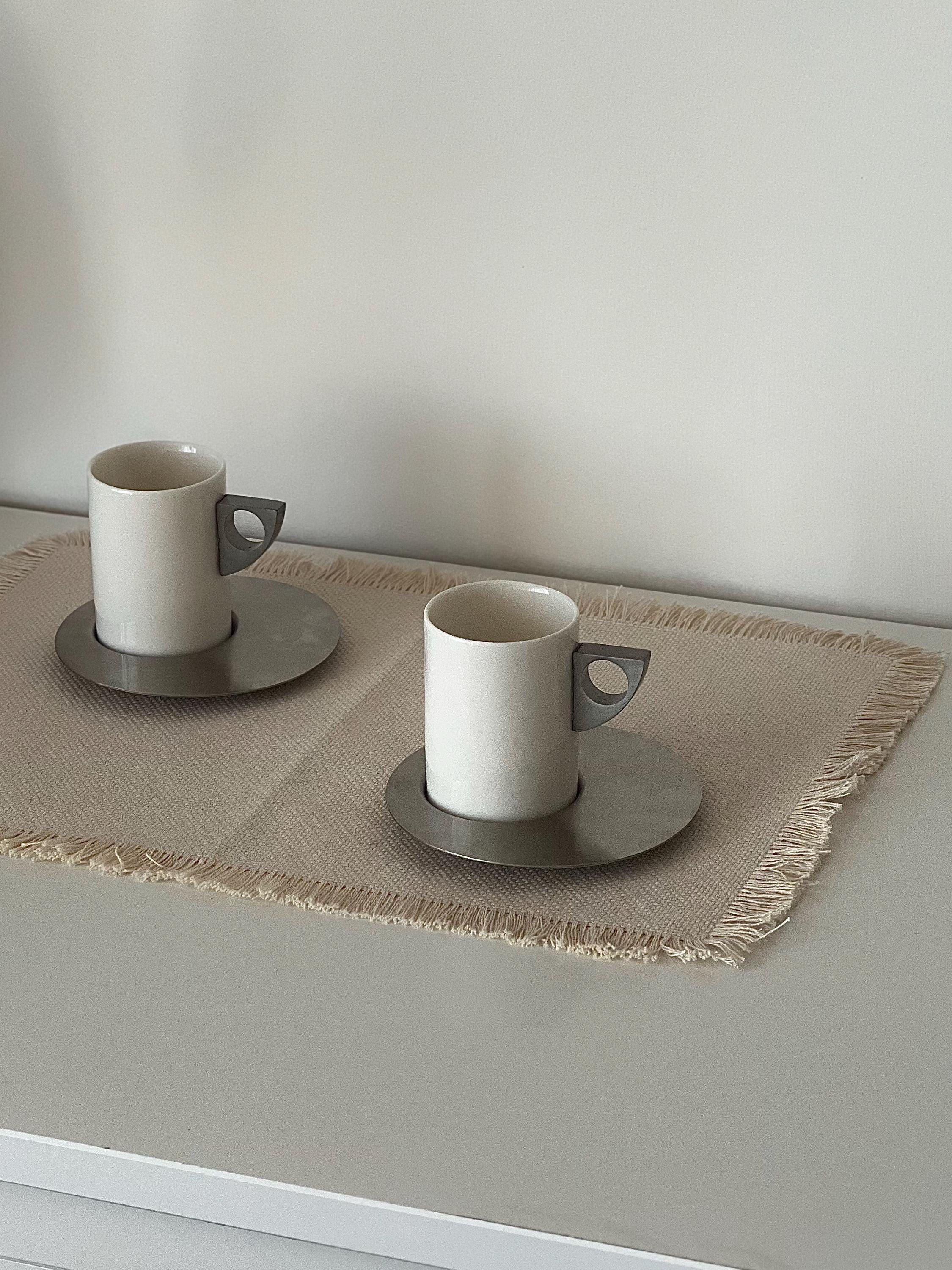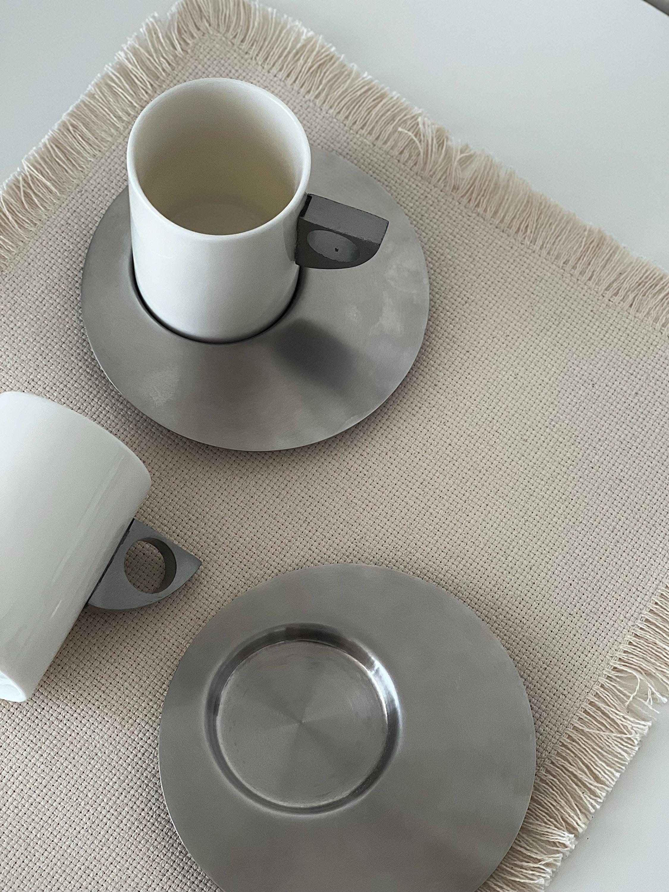 This set of two vintage espresso cups with saucers carries a subtle Brutalist edge, where clean cylindrical forms meet cool brushed metal. The white ceramic feels soft and grounded, while the geometric handles add a slightly architectural note—something you notice more each time you reach for it. It’s the kind of vintage espresso cup set with saucers that doesn’t try too hard, yet naturally becomes part of a calm, intentional routine.
