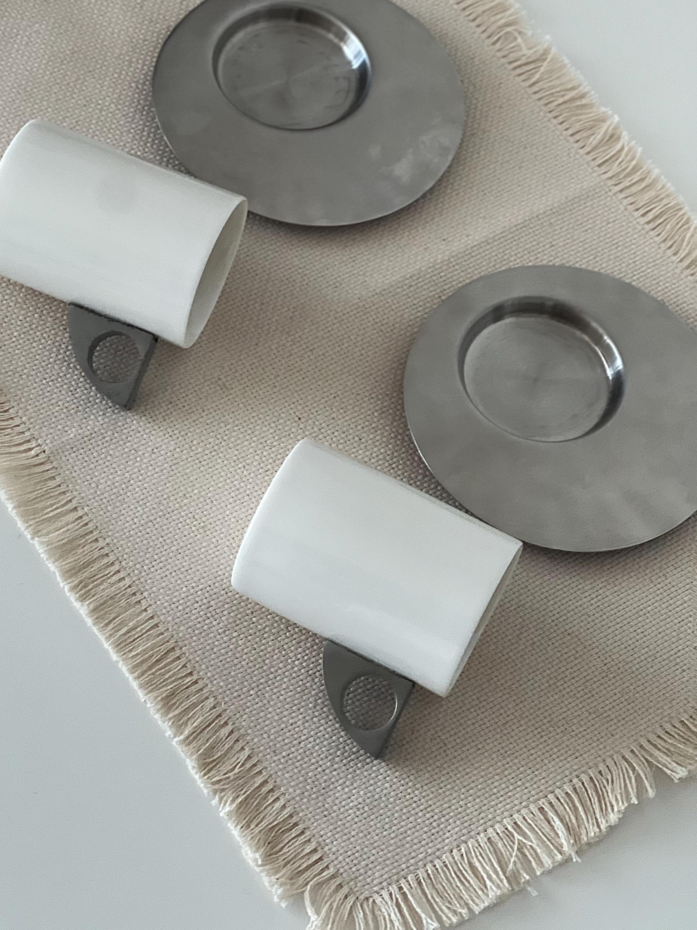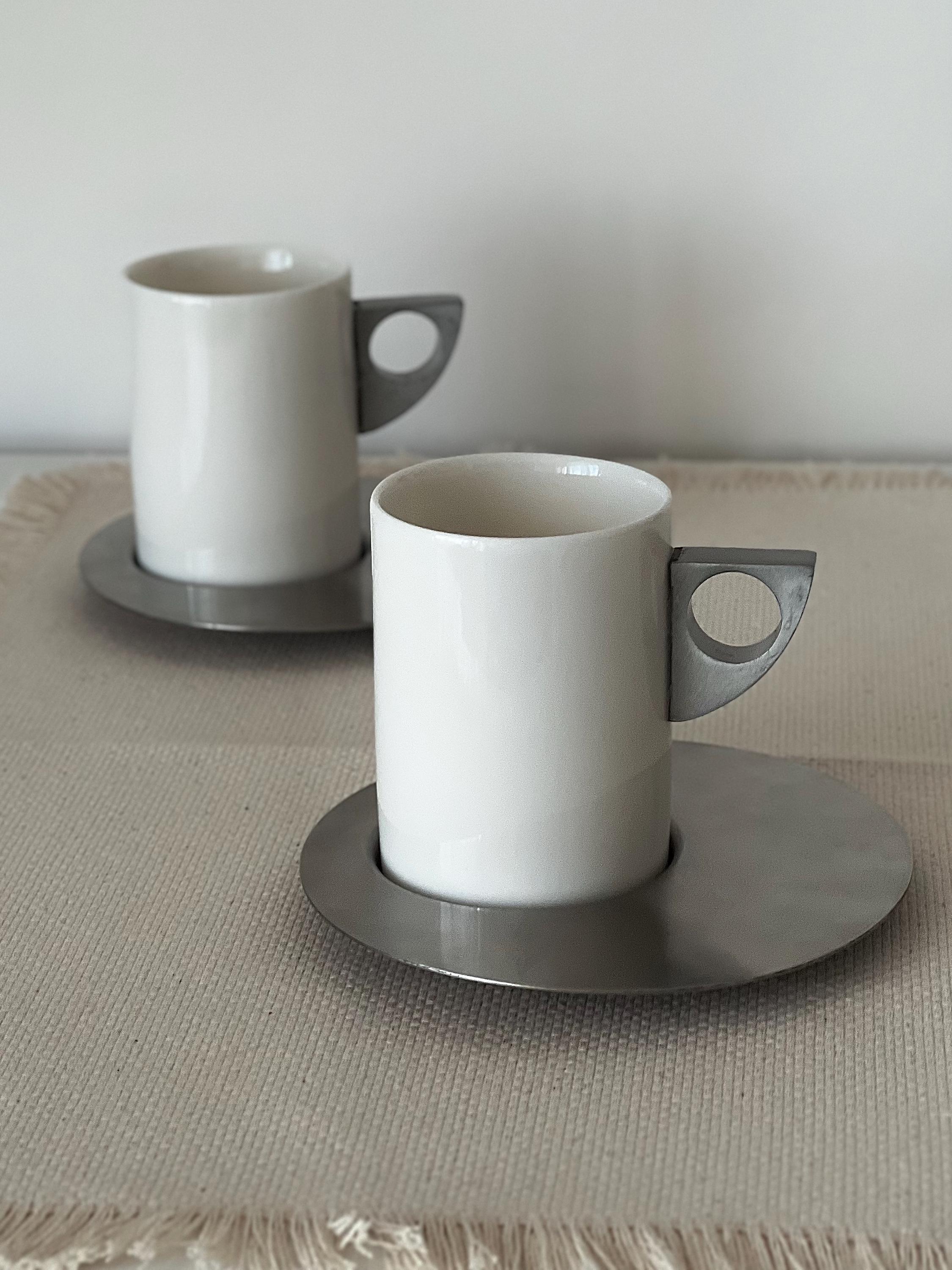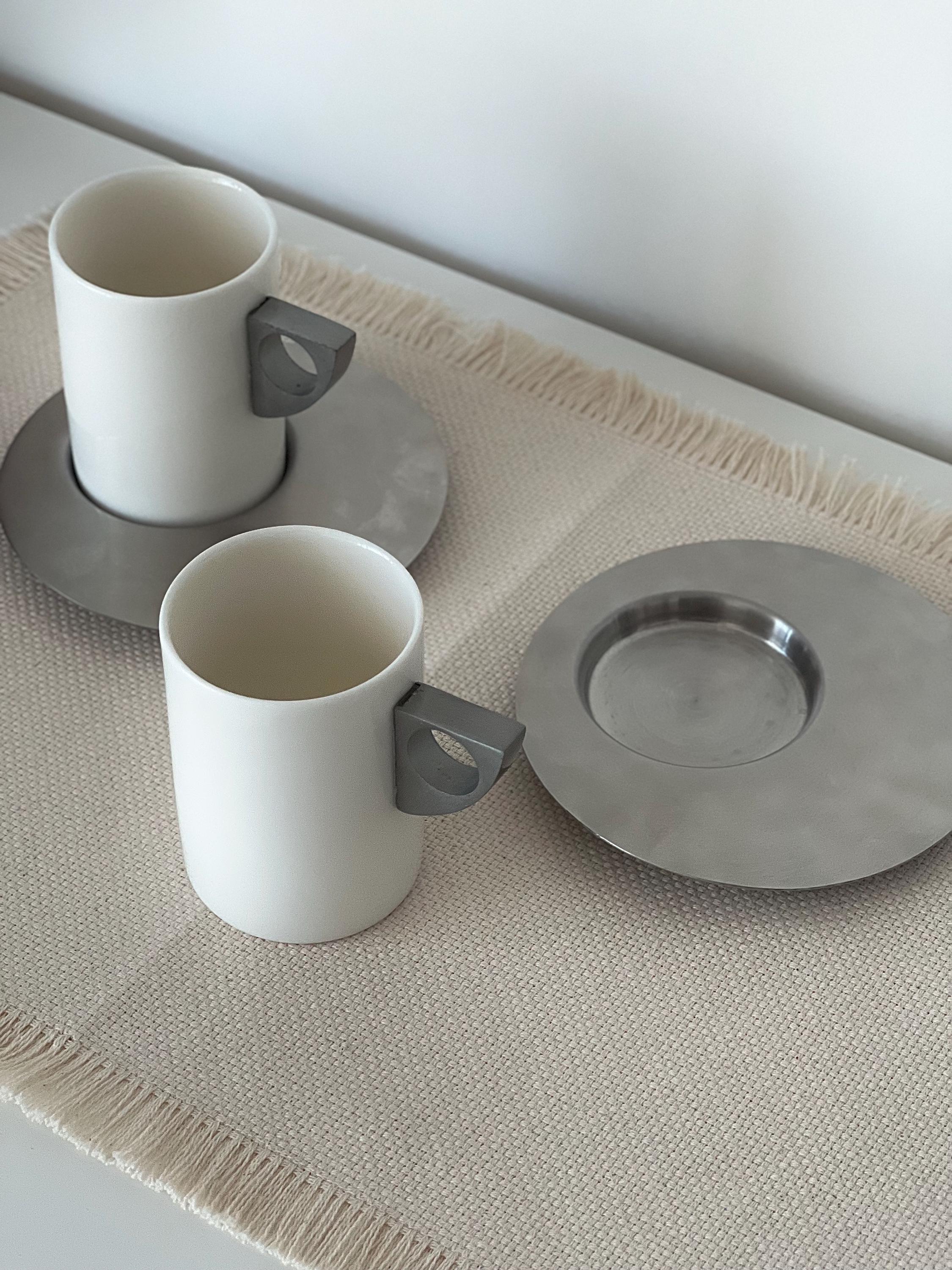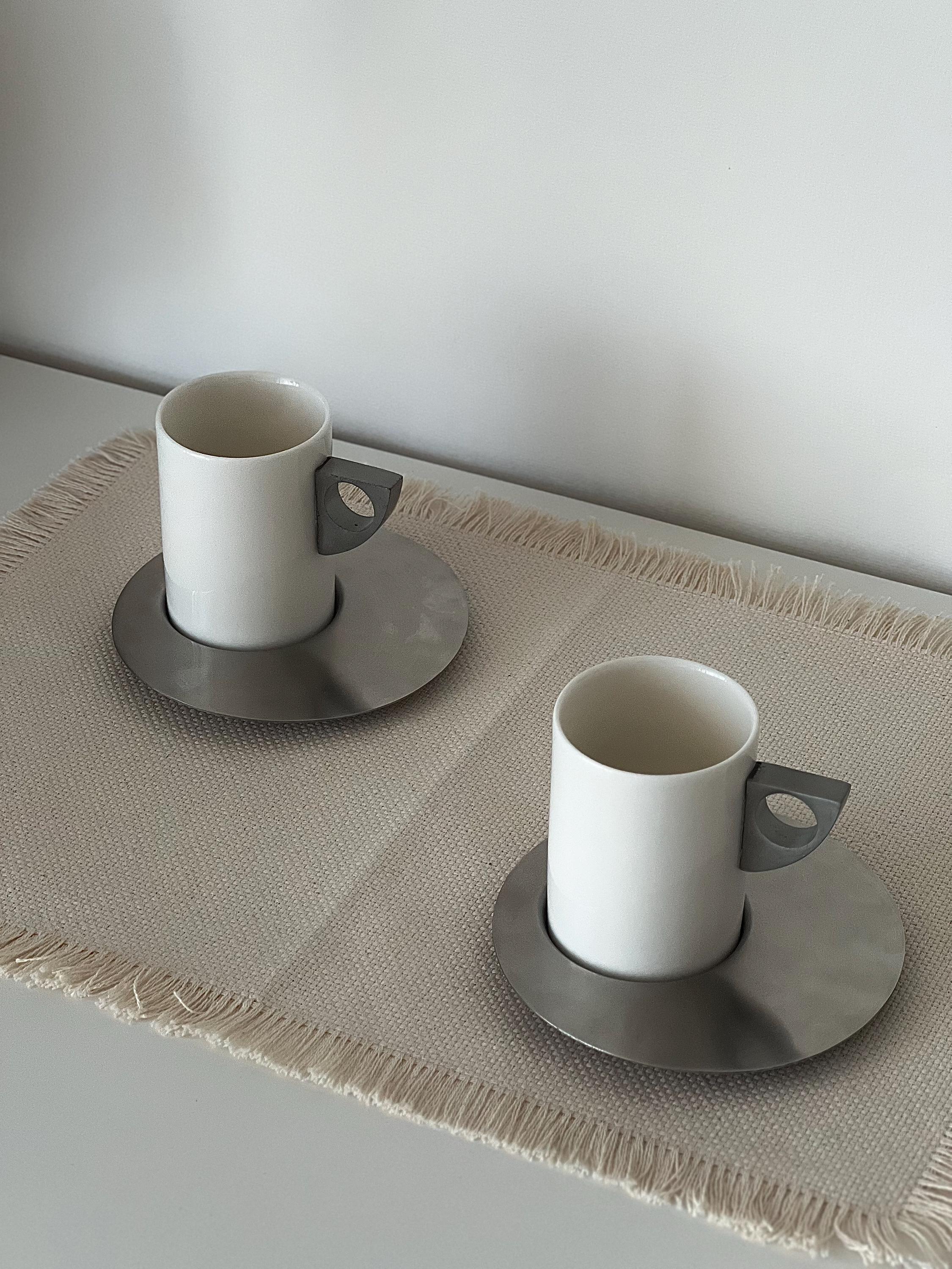 This set of two vintage espresso cups with saucers carries a subtle Brutalist edge, where clean cylindrical forms meet cool brushed metal. The white ceramic feels soft and grounded, while the geometric handles add a slightly architectural note—something you notice more each time you reach for it. It’s the kind of vintage espresso cup set with saucers that doesn’t try too hard, yet naturally becomes part of a calm, intentional routine.